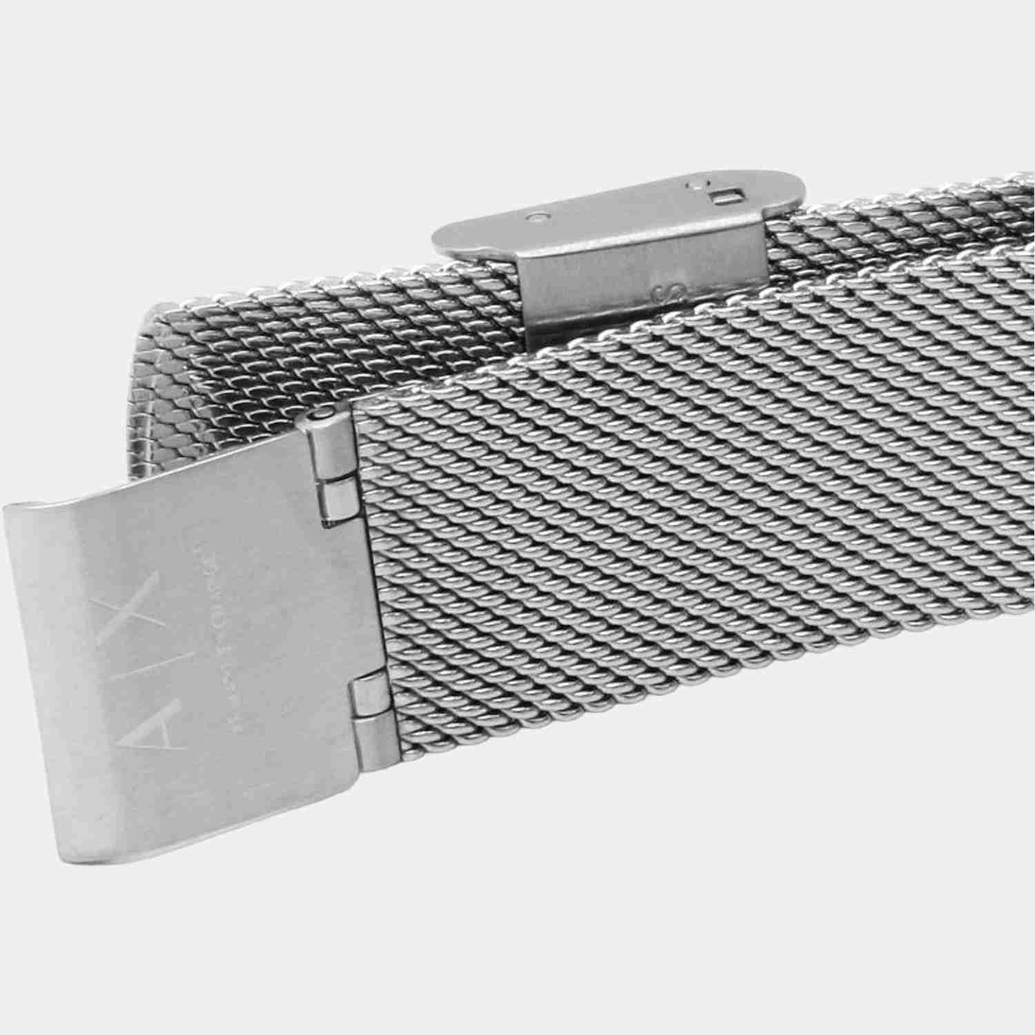 Armani Exchange's 36mm watch features a silver sunray dial, three-hand movement and stainless steel mesh strap.