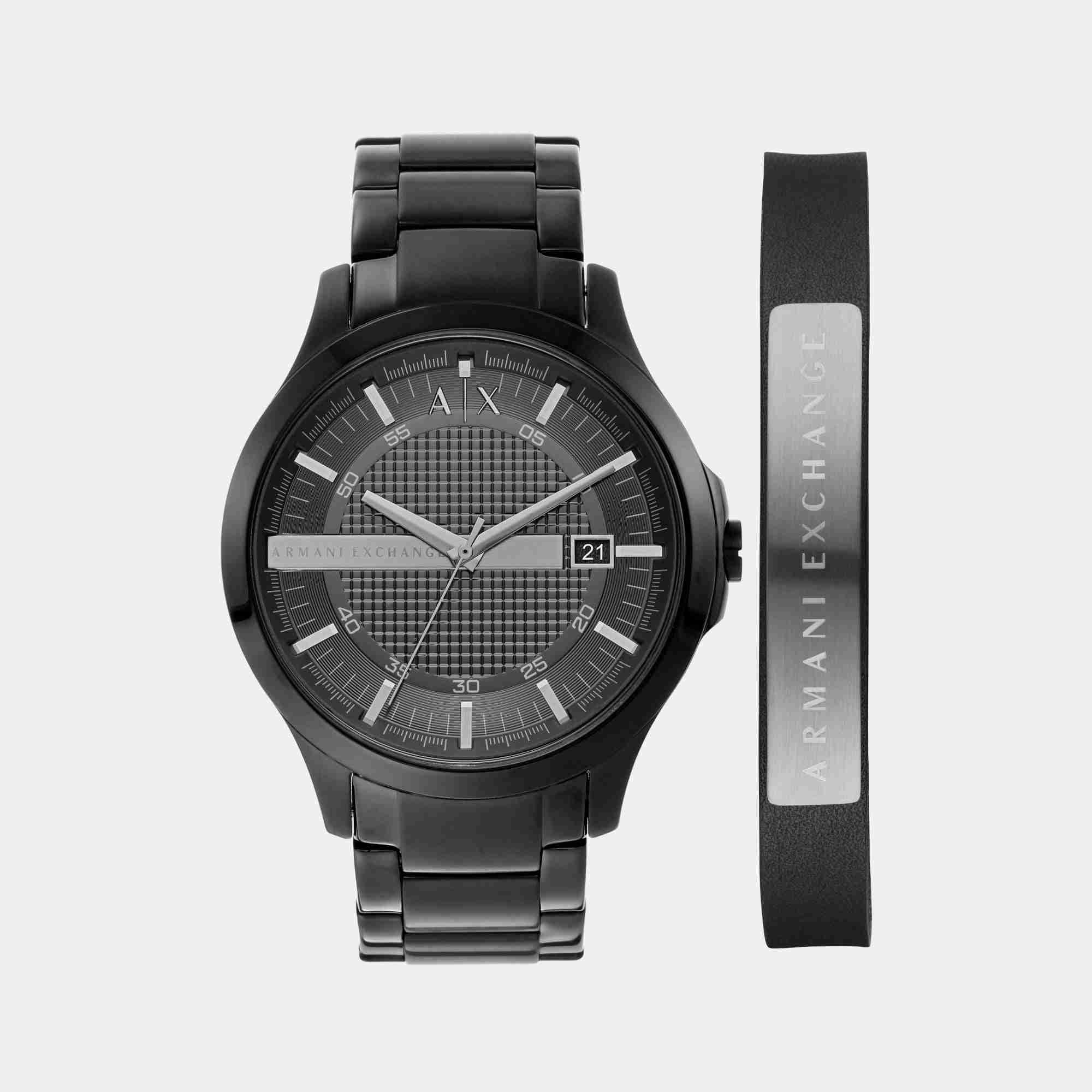 Armani Exchange's gift set includes a black leather cuff bracelet and a 46mm watch featuring a black textured dial, three-hand date movement and black stainless steel bracelet.