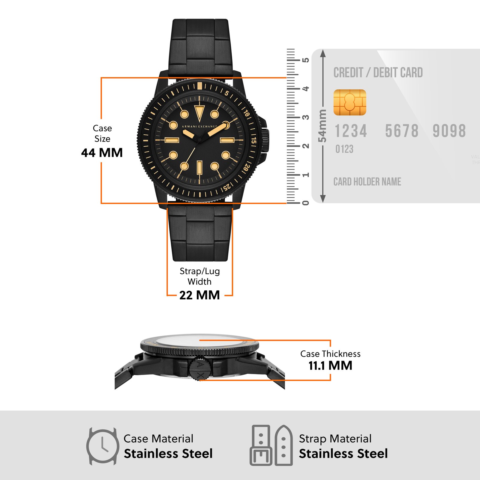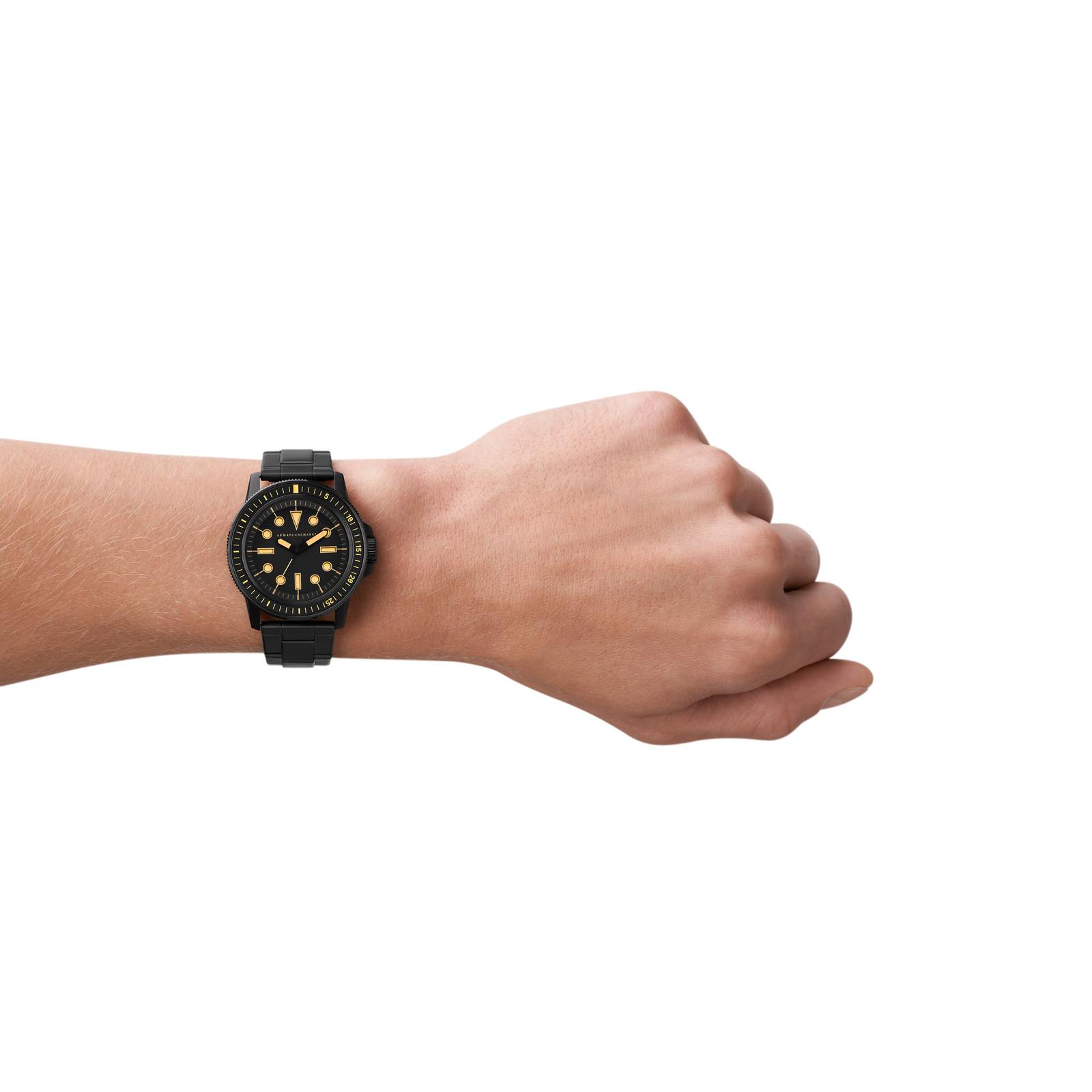 Armani Exchange's 44mm watch features a black matte dial with cut-out lumen indexes and lumen hands, three-hand movement and black-tone stainless steel bracelet.