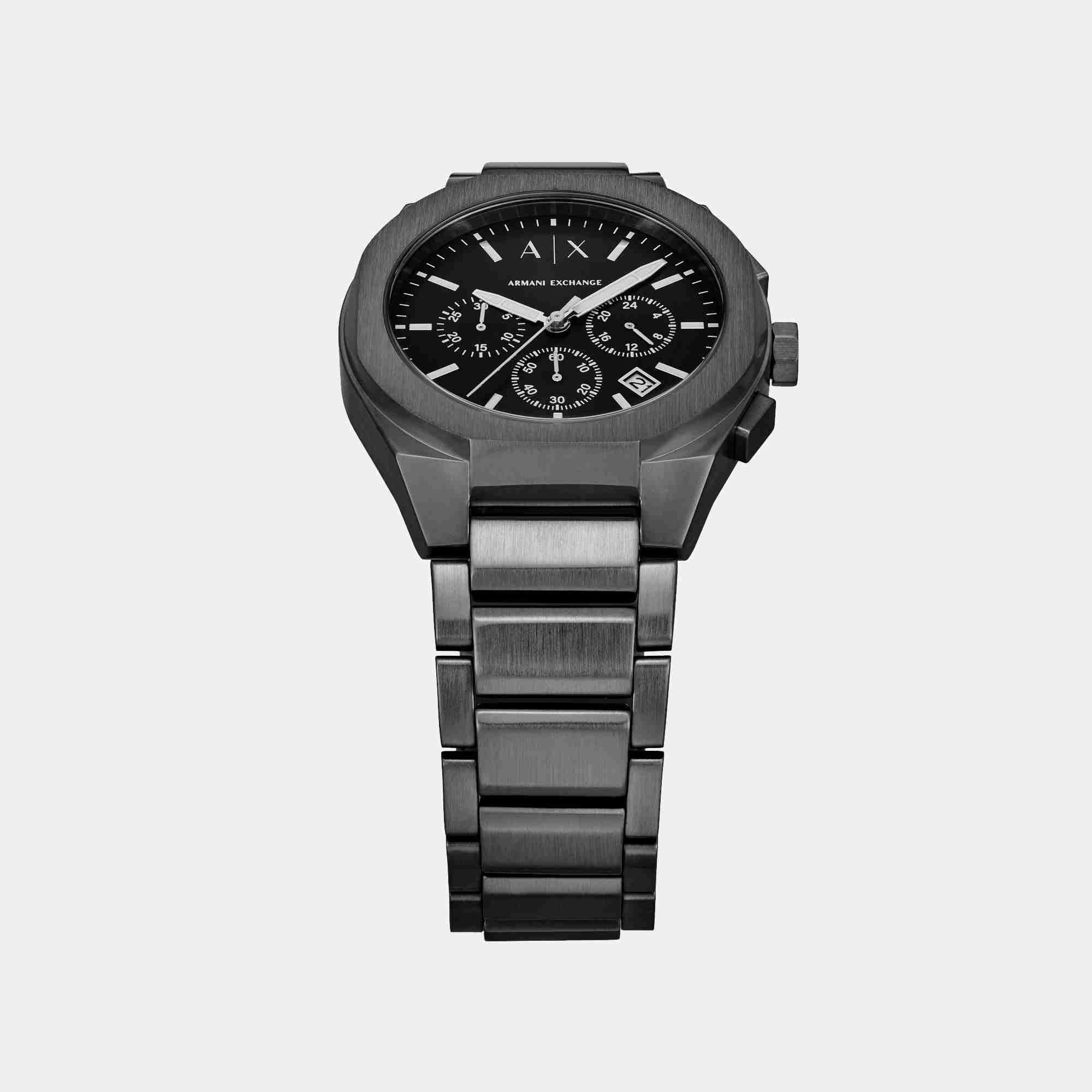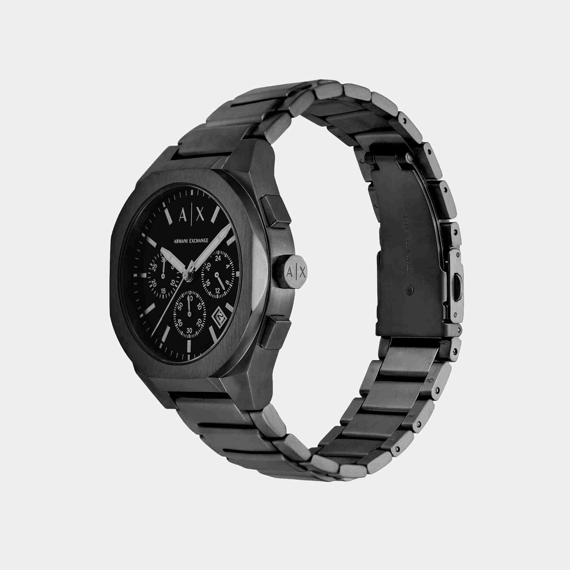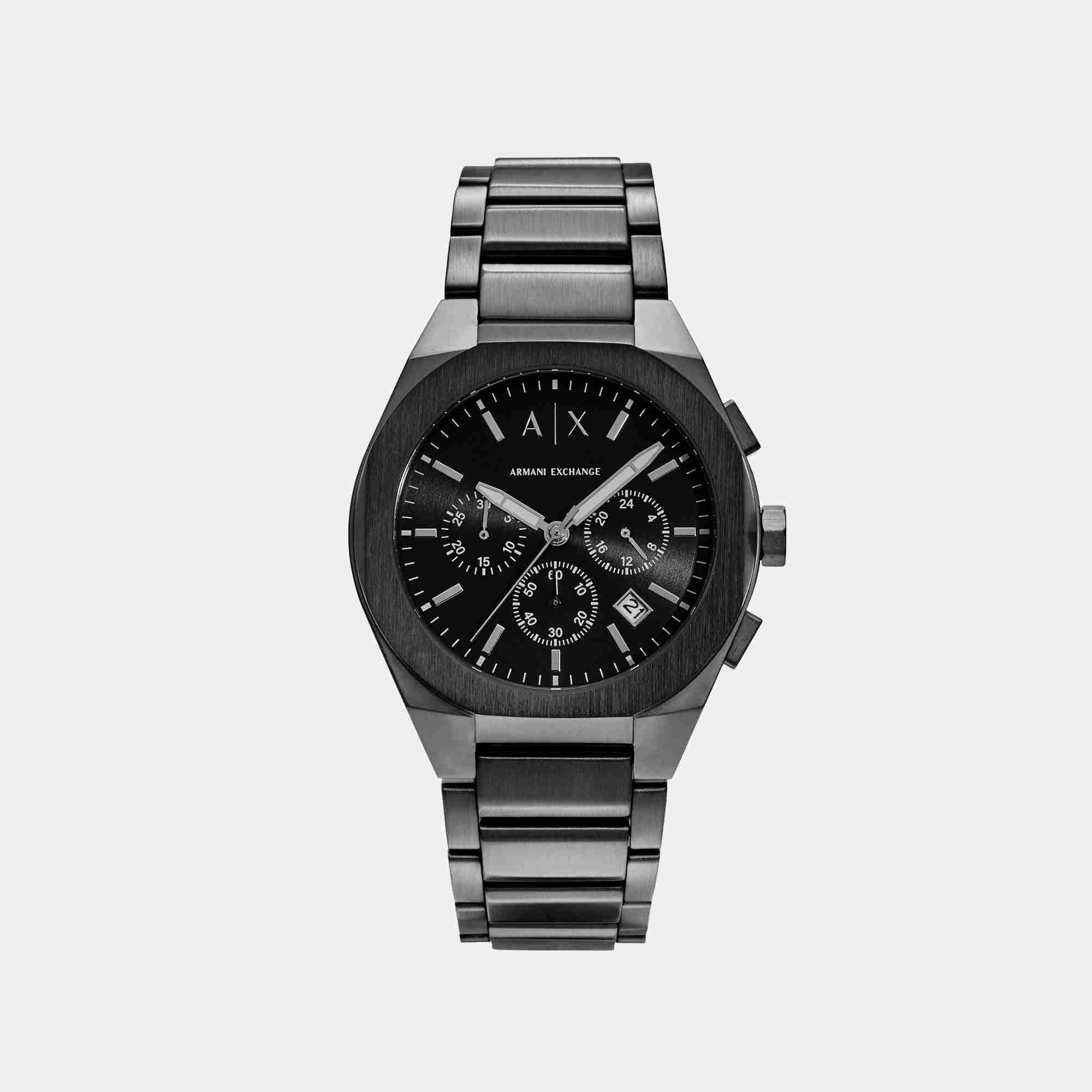 Armani Exchange's 42mm watch features a black sunray dial, chronograph movement and black stainless steel bracelet.