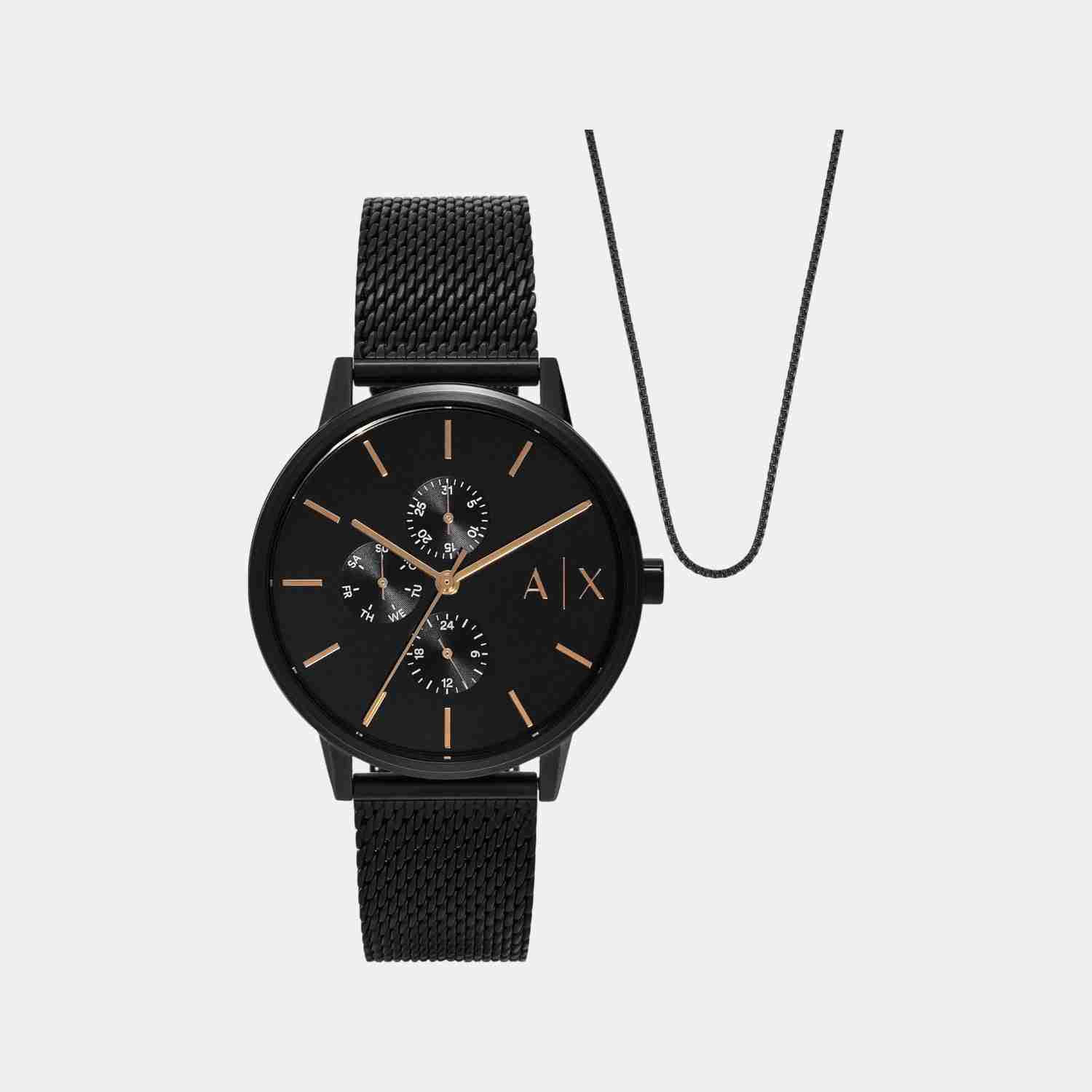 Armani Exchange's gift set includes a black stainless steel chain necklace and a 42mm watch featuring a black brushed dial, multifunction movement and black stainless steel bracelet.
