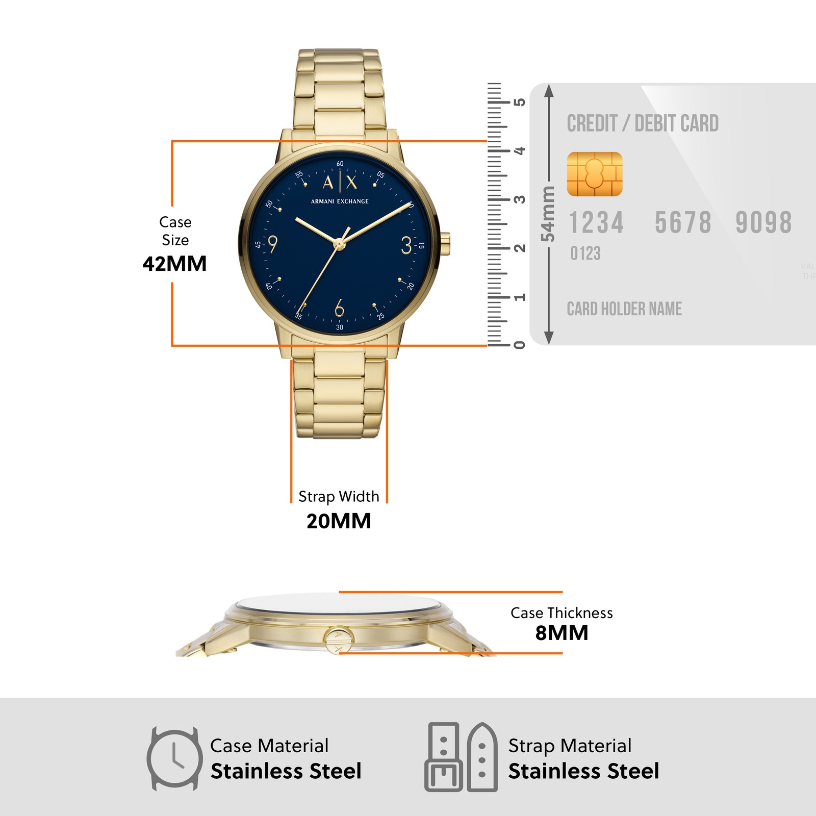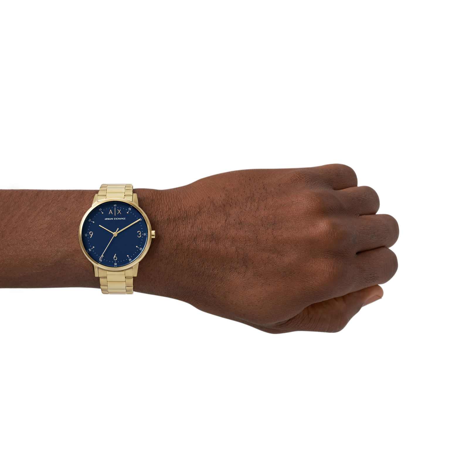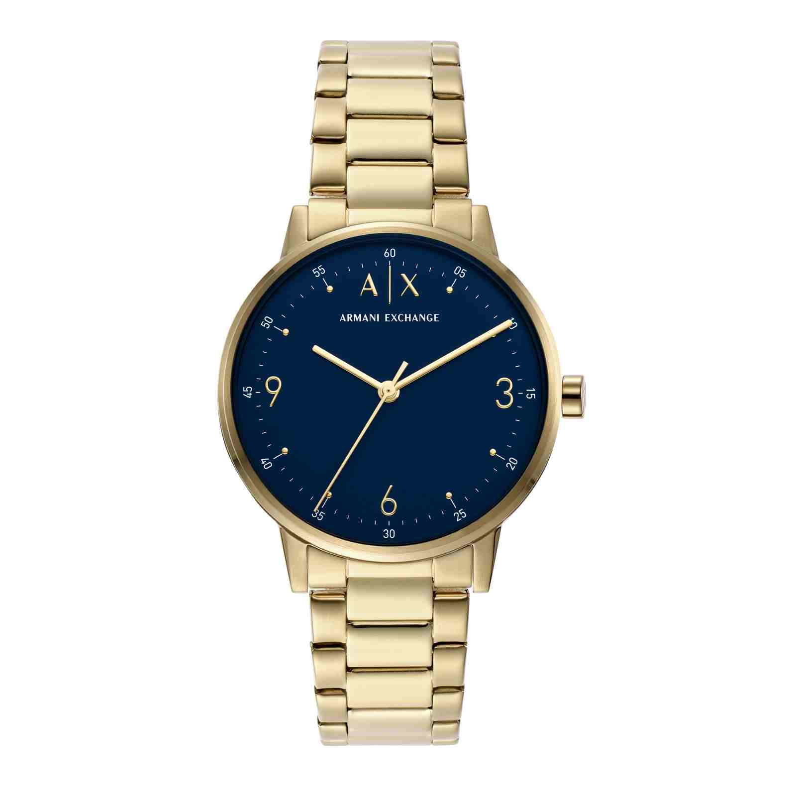 Armani Exchange's 42mm watch features a blue matte dial, at least 50% recycled stainless steel case, three-hand movement and gold-tone stainless steel bracelet.