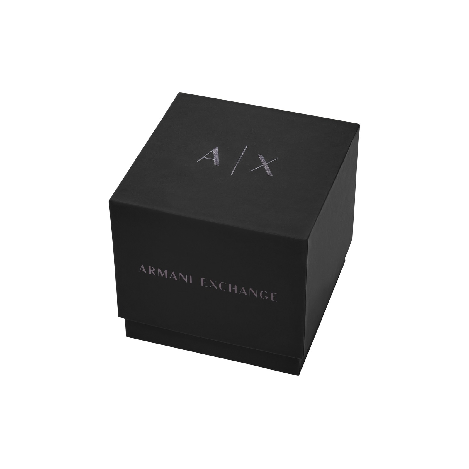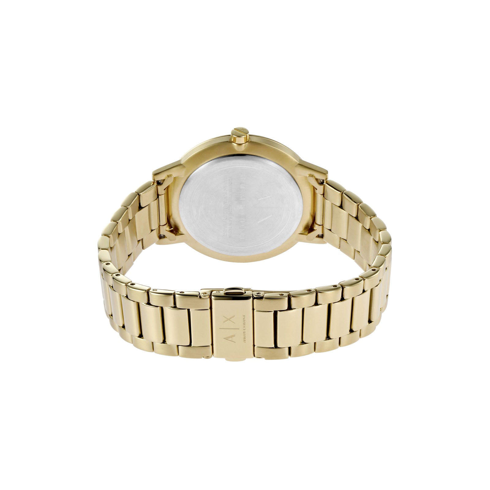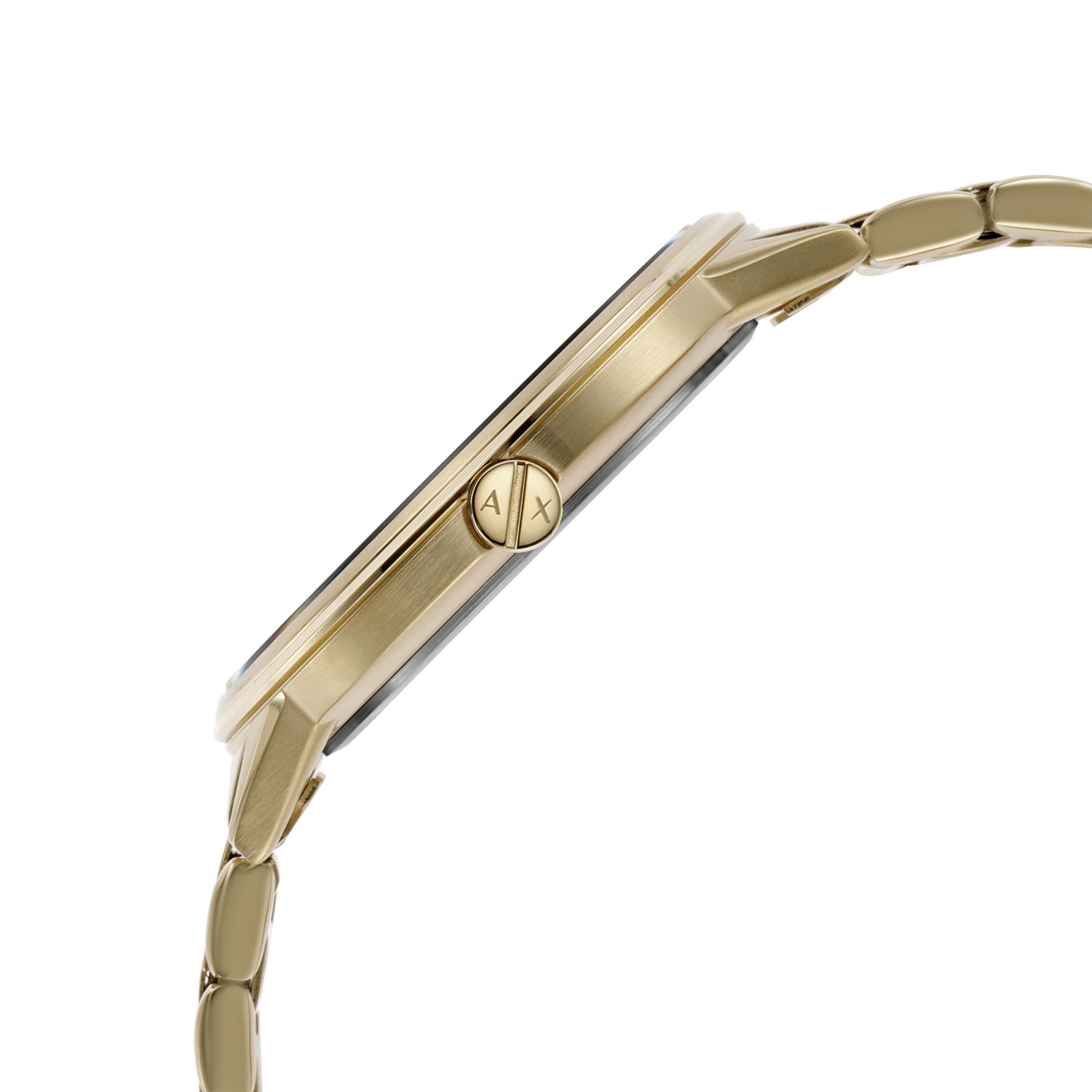 Armani Exchange's 42mm watch features a blue matte dial, at least 50% recycled stainless steel case, three-hand movement and gold-tone stainless steel bracelet.