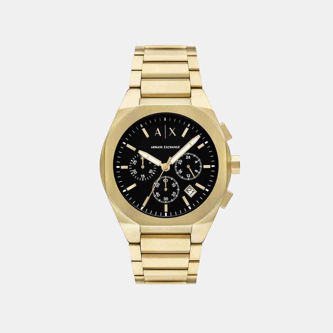 Armani Exchange's 42mm watch features a black sunray dial, chronograph movement and gold-tone stainless steel bracelet.