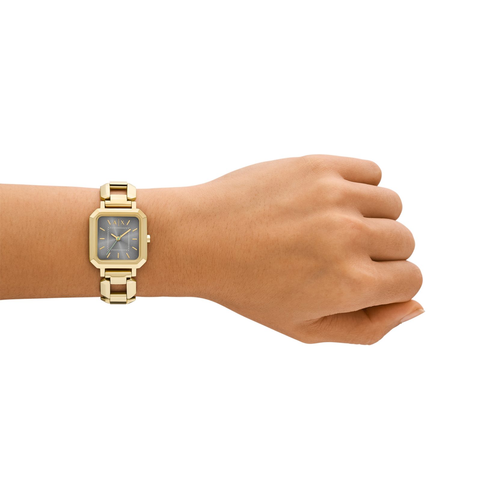 Armani Exchange's 27mm watch features a gray sunray dial, three-hand movement and gold-tone stainless steel bracelet.