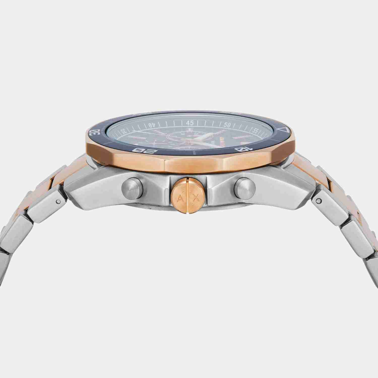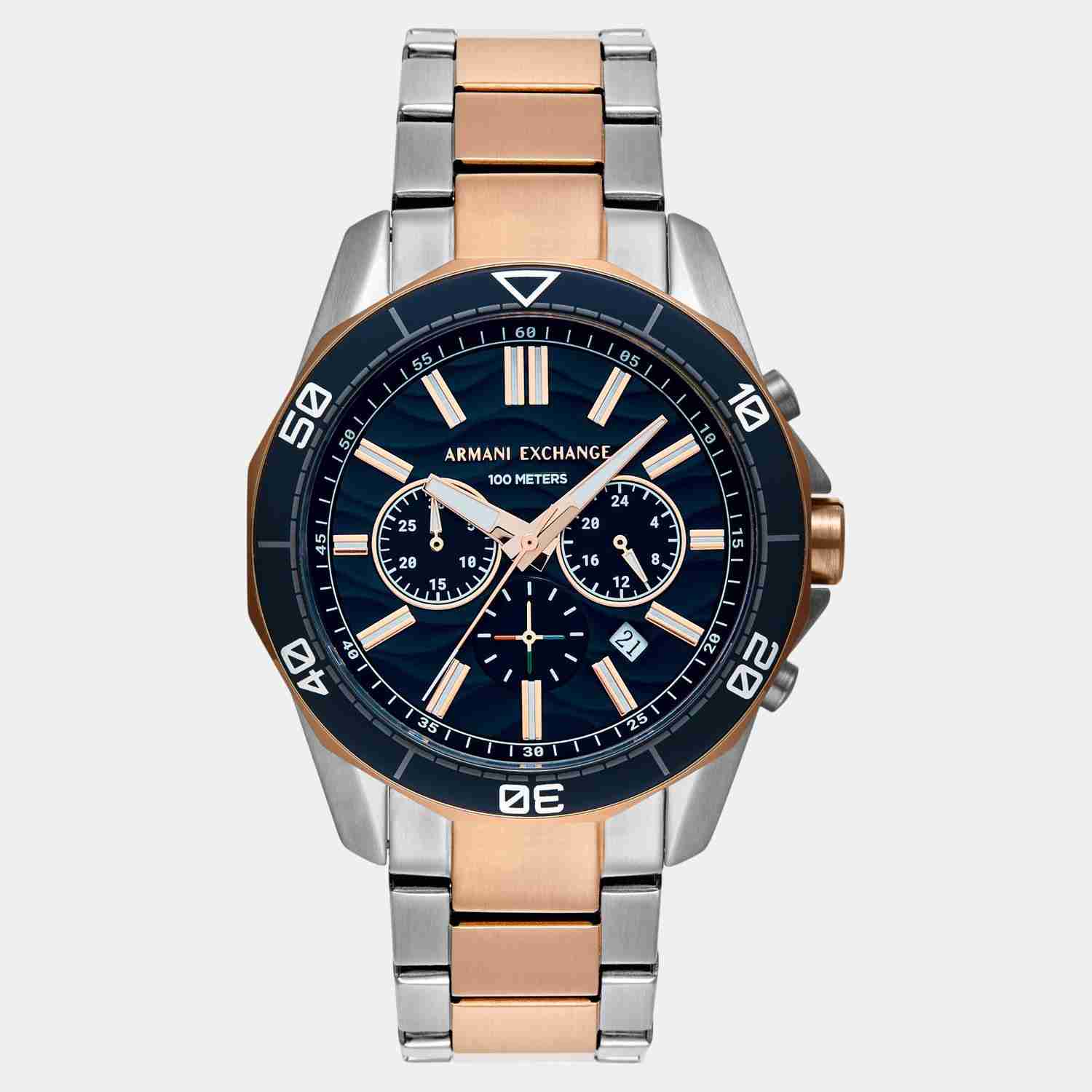 Armani Exchange's 44mm watch features a blue textured dial, chronograph movement and two-tone rose gold and stainless steel bracelet.