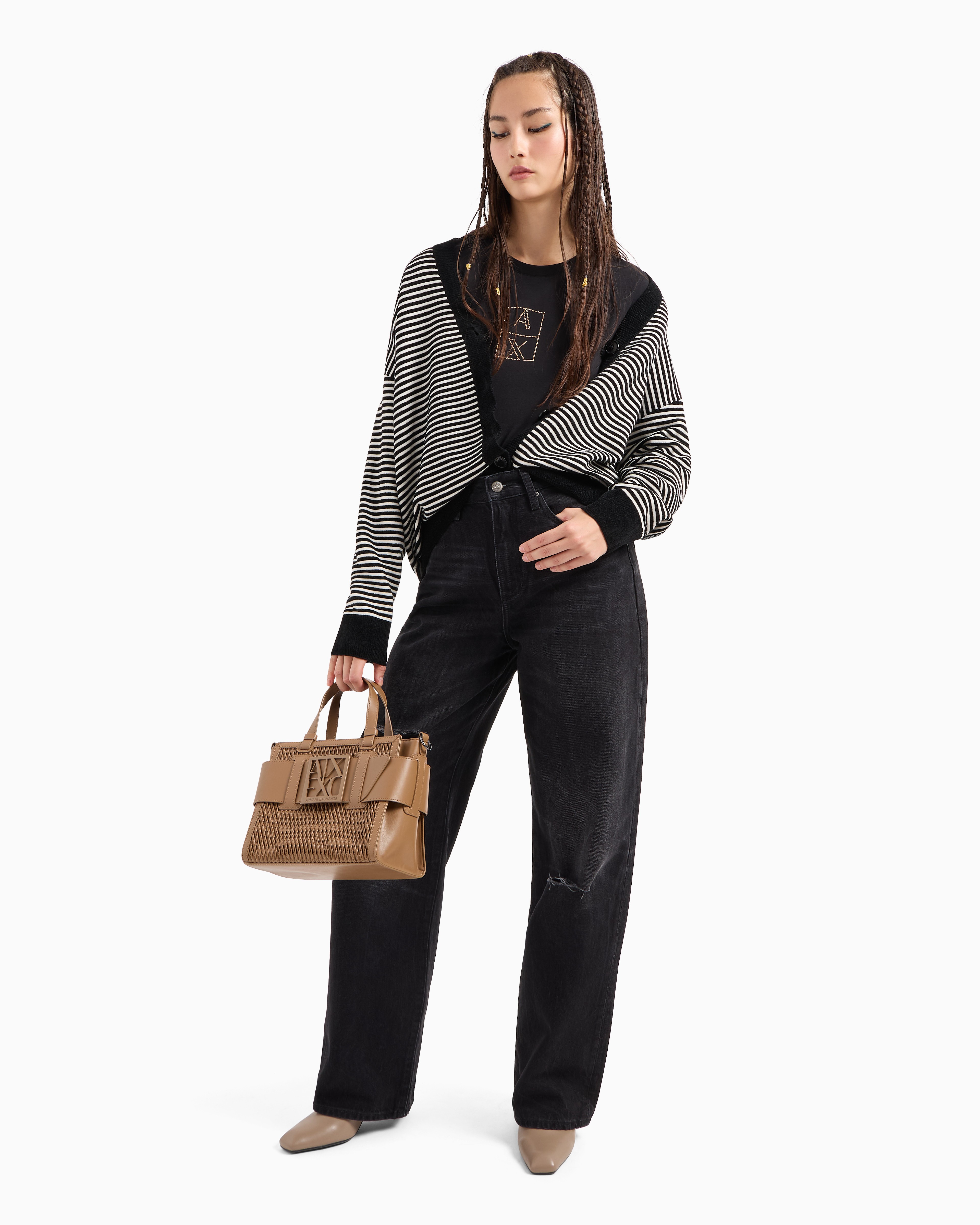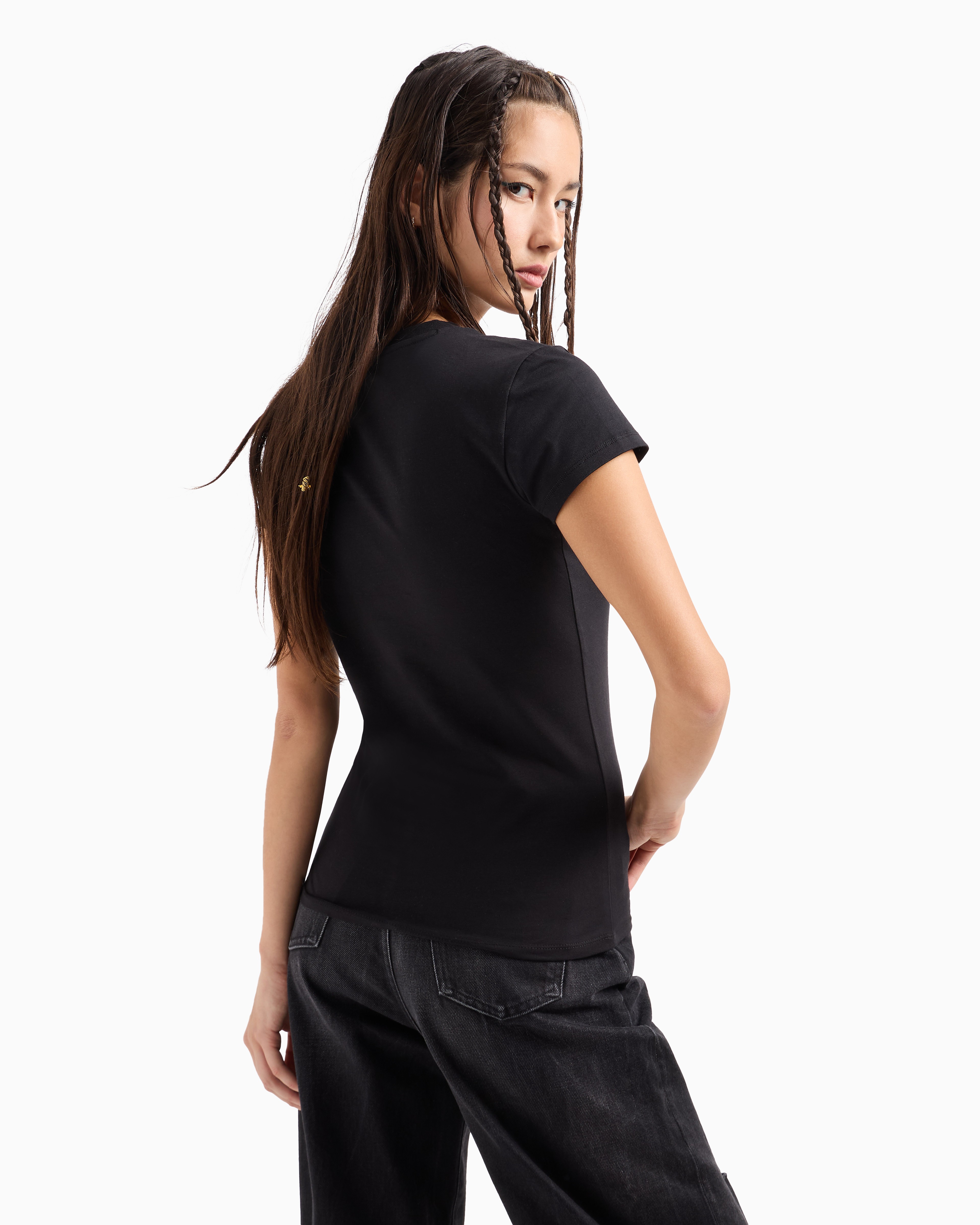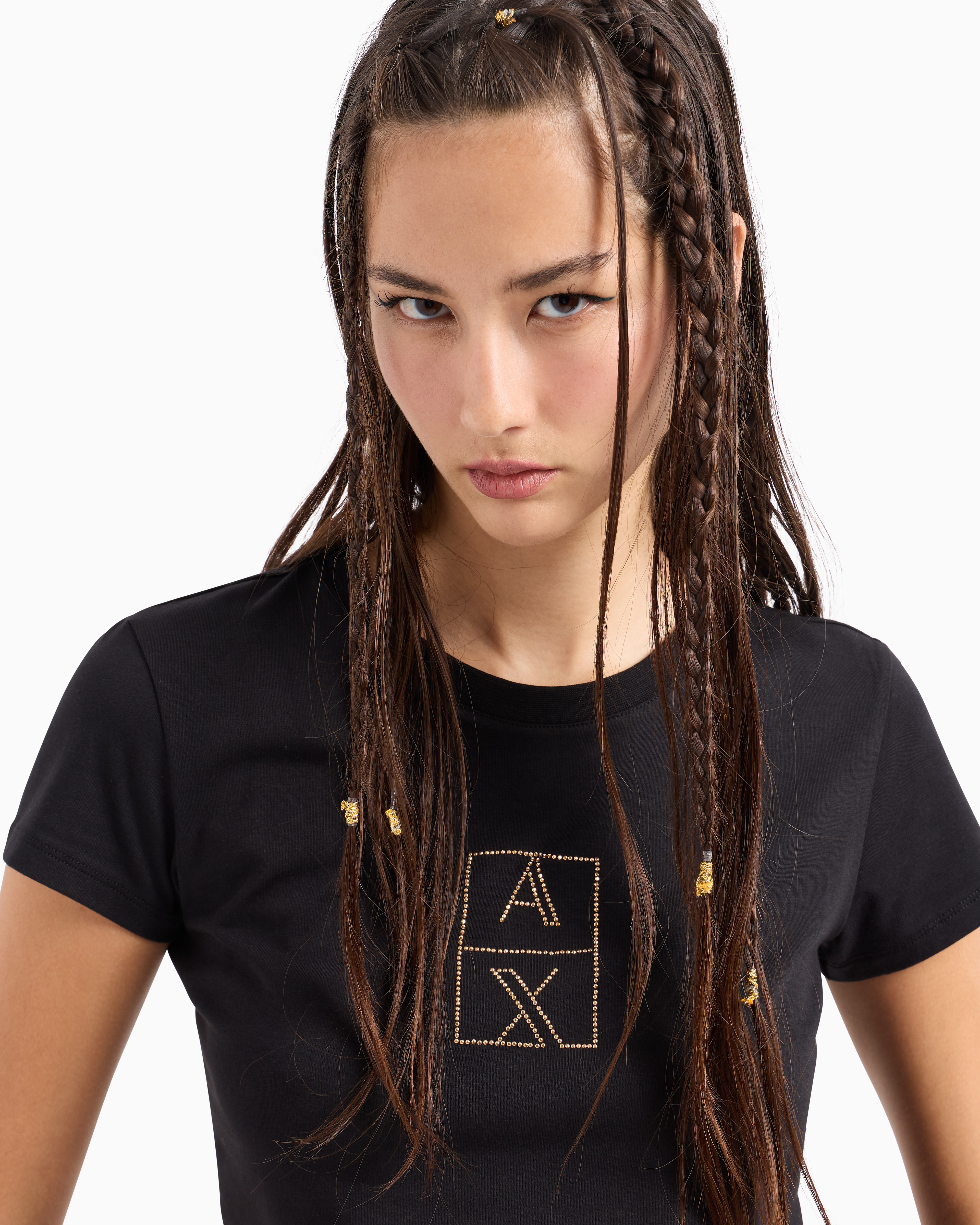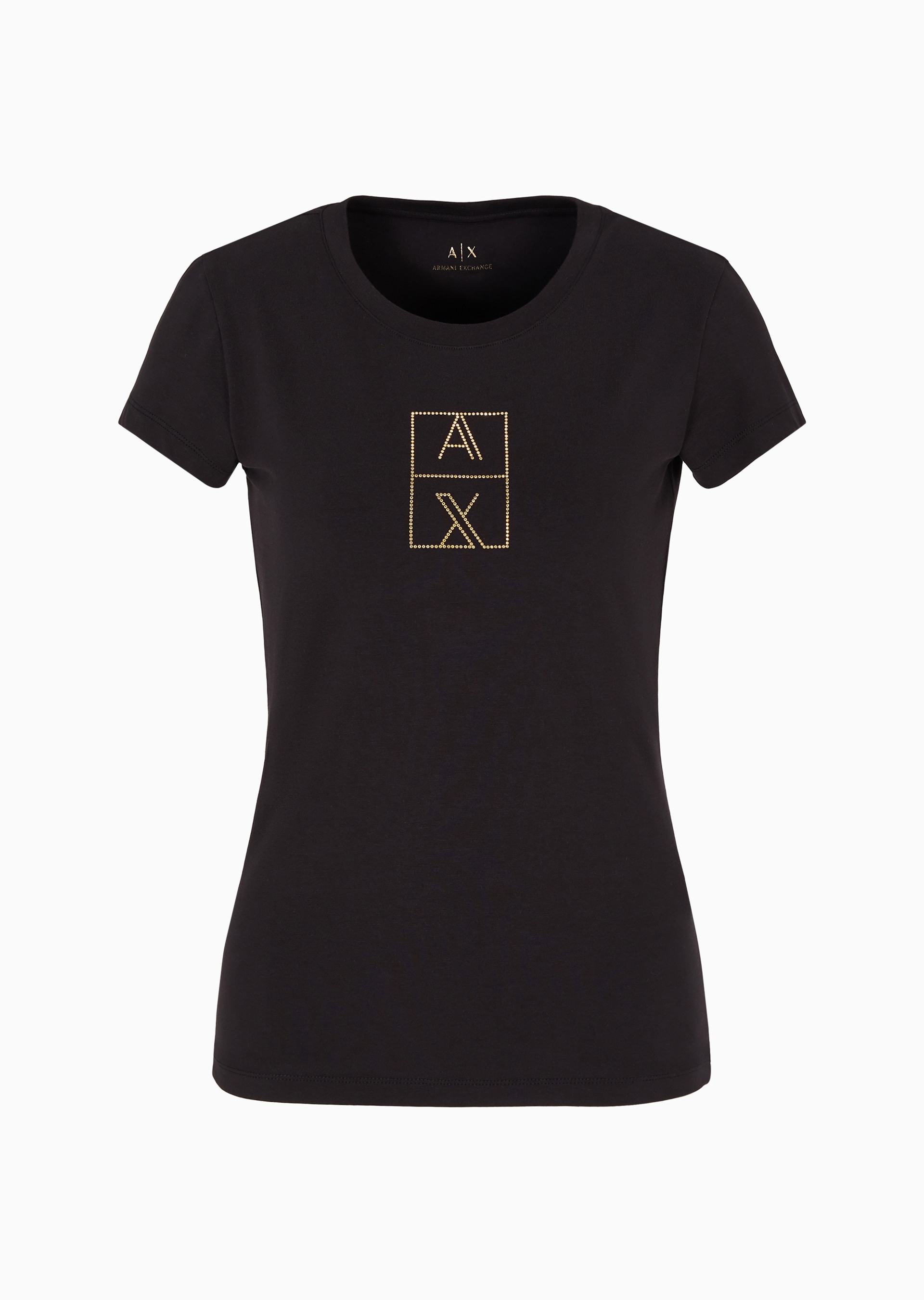 The Armani Tees T-shirt by Armani Exchange is crafted from cotton stretch jersey for a comfortable, flexible fit. The standout feature is the studded logo in the center, adding a touch of edgy sophistication to this classic piece. Perfect for adding a stylish edge to your everyday look