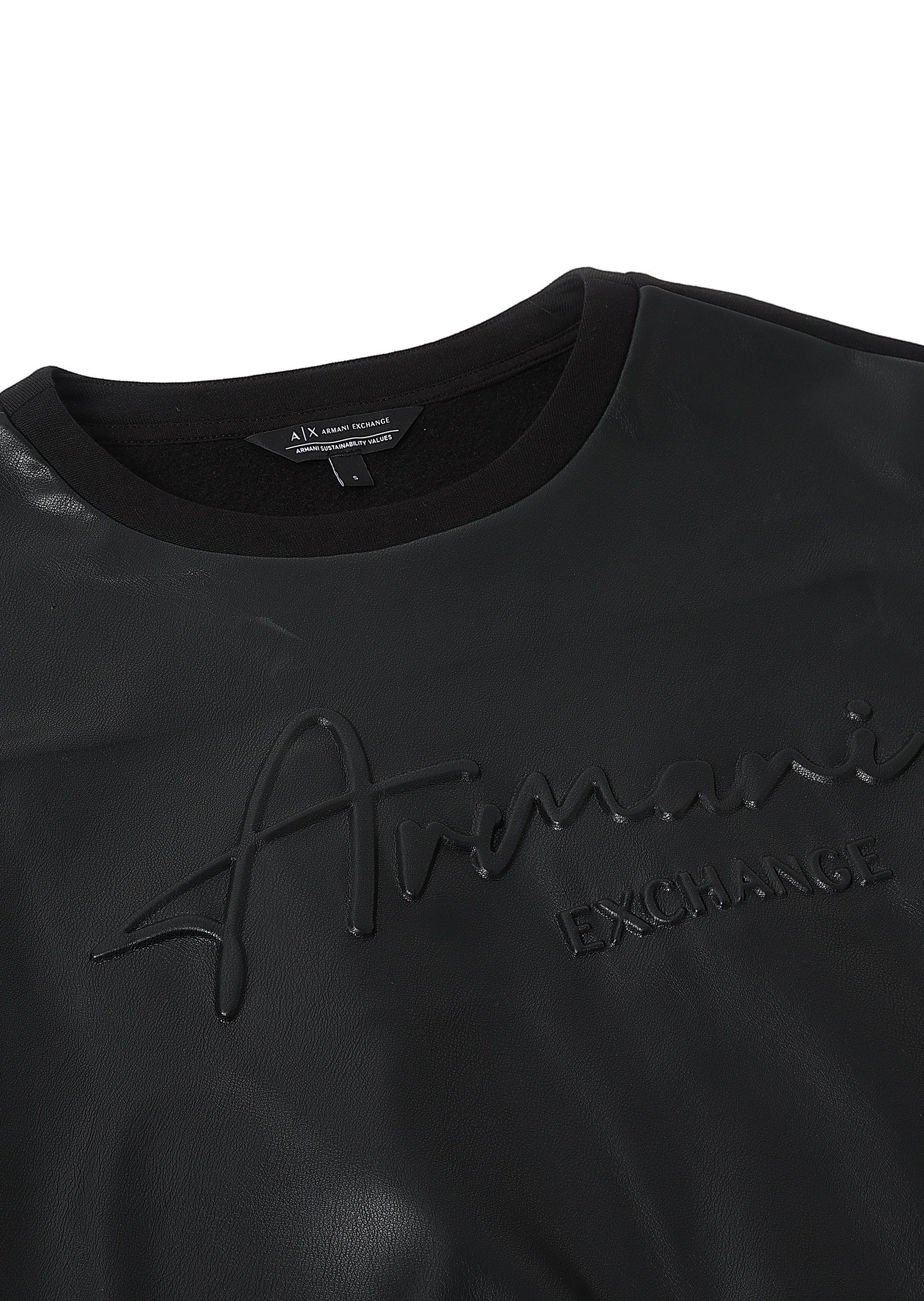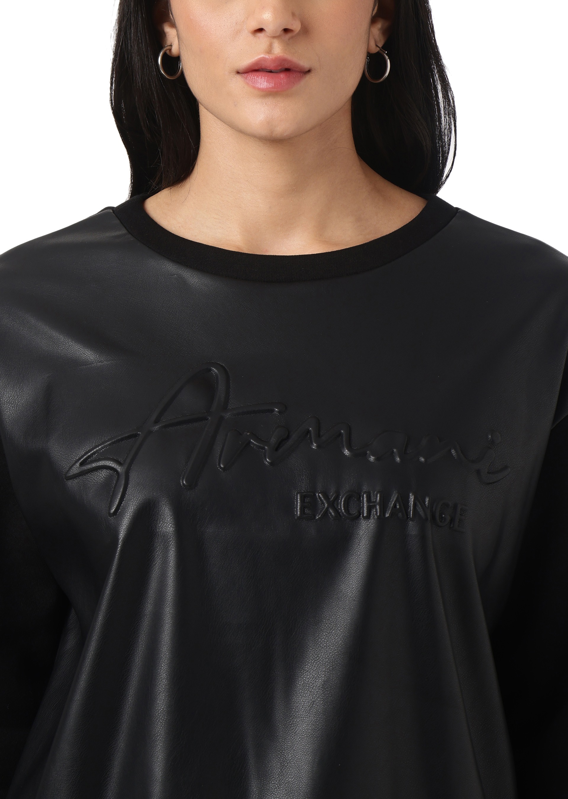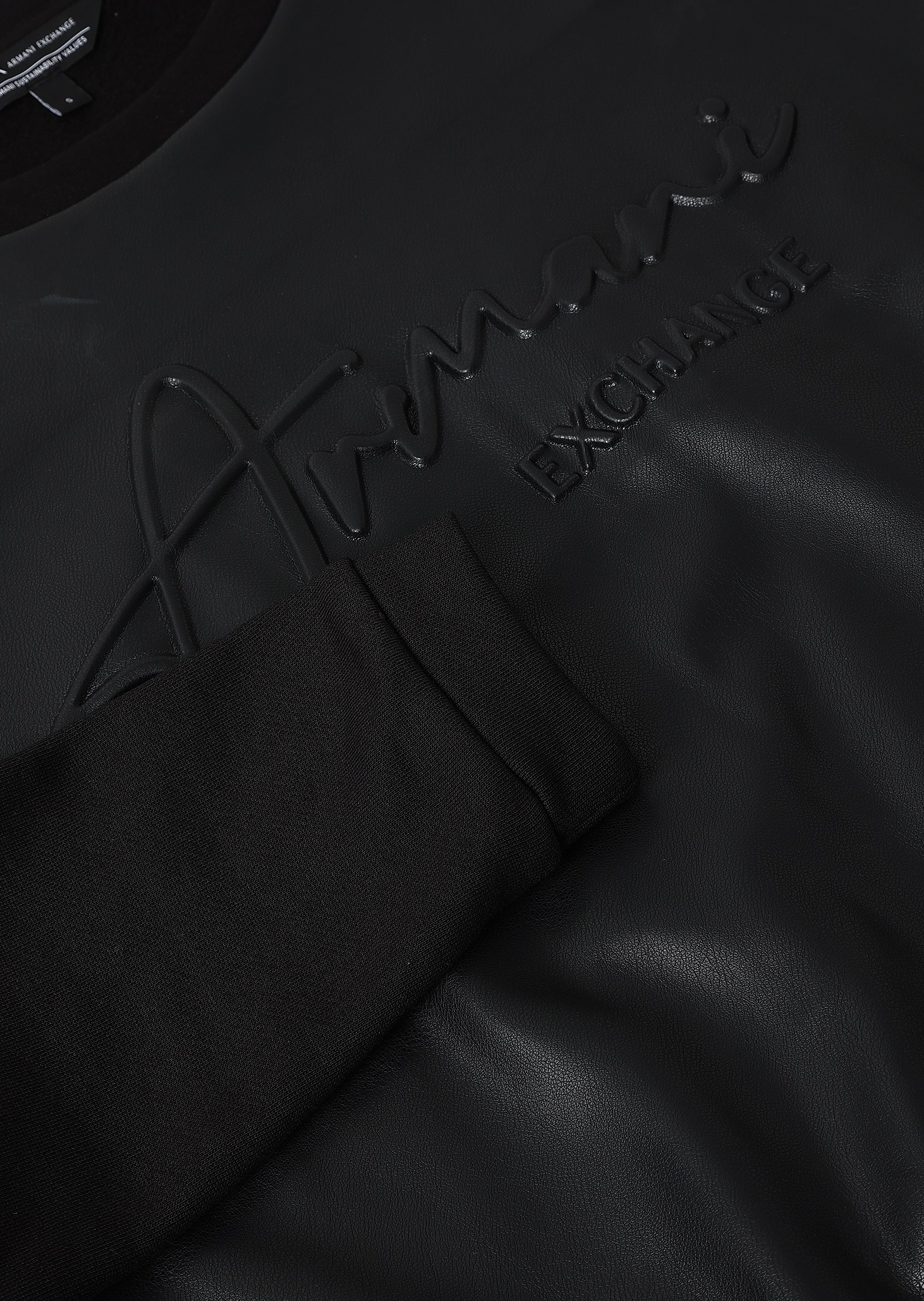 The Eco Leather sweatshirt by Armani Exchange offers a chic, cropped design with dropped shoulders. The front panel is crafted from sleek PU leather, while the sleeves and back are made from soft fleece. An embossed tonal logo signature adds a refined touch, making this sweatshirt a stylish blend of modern edge and comfort