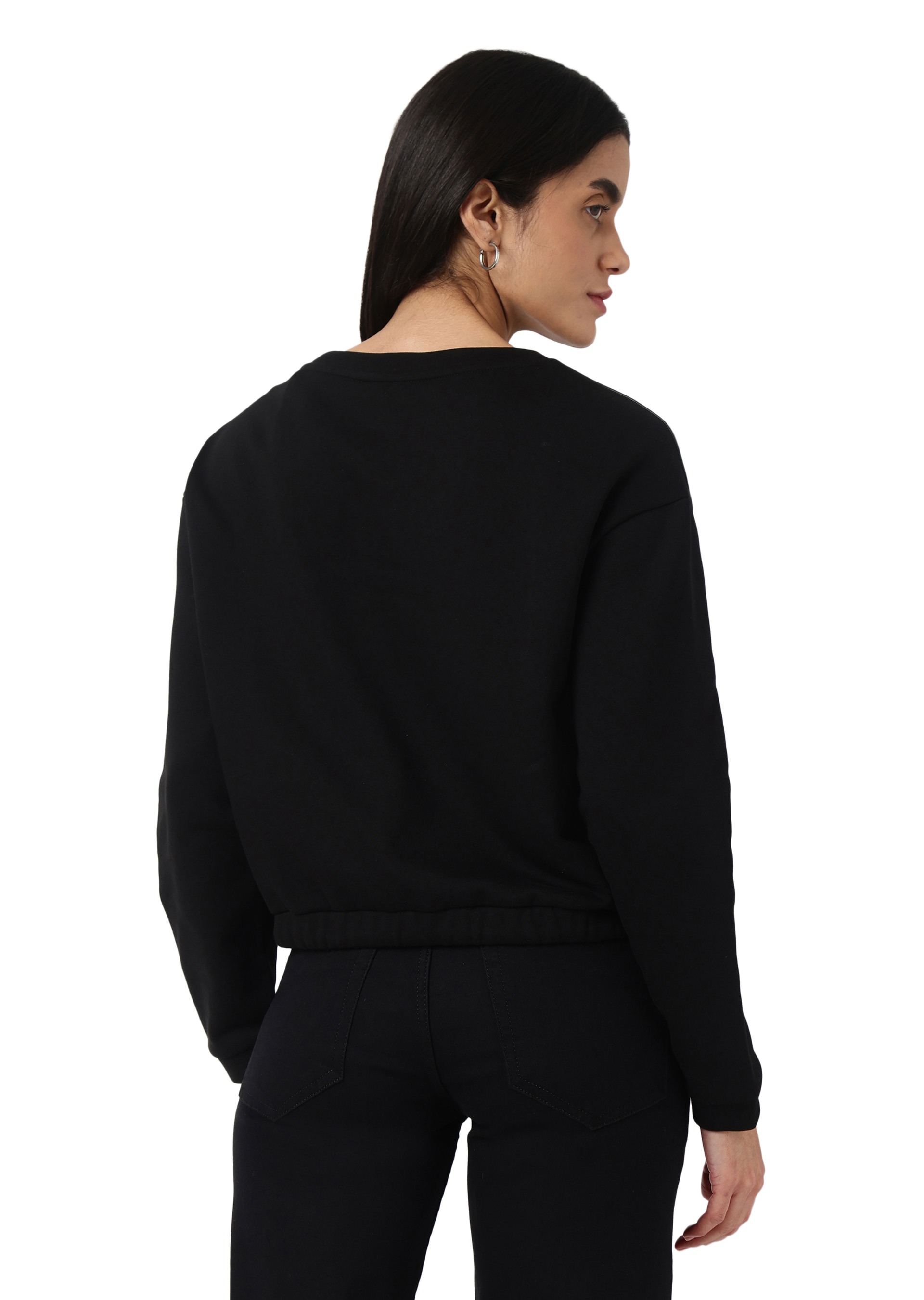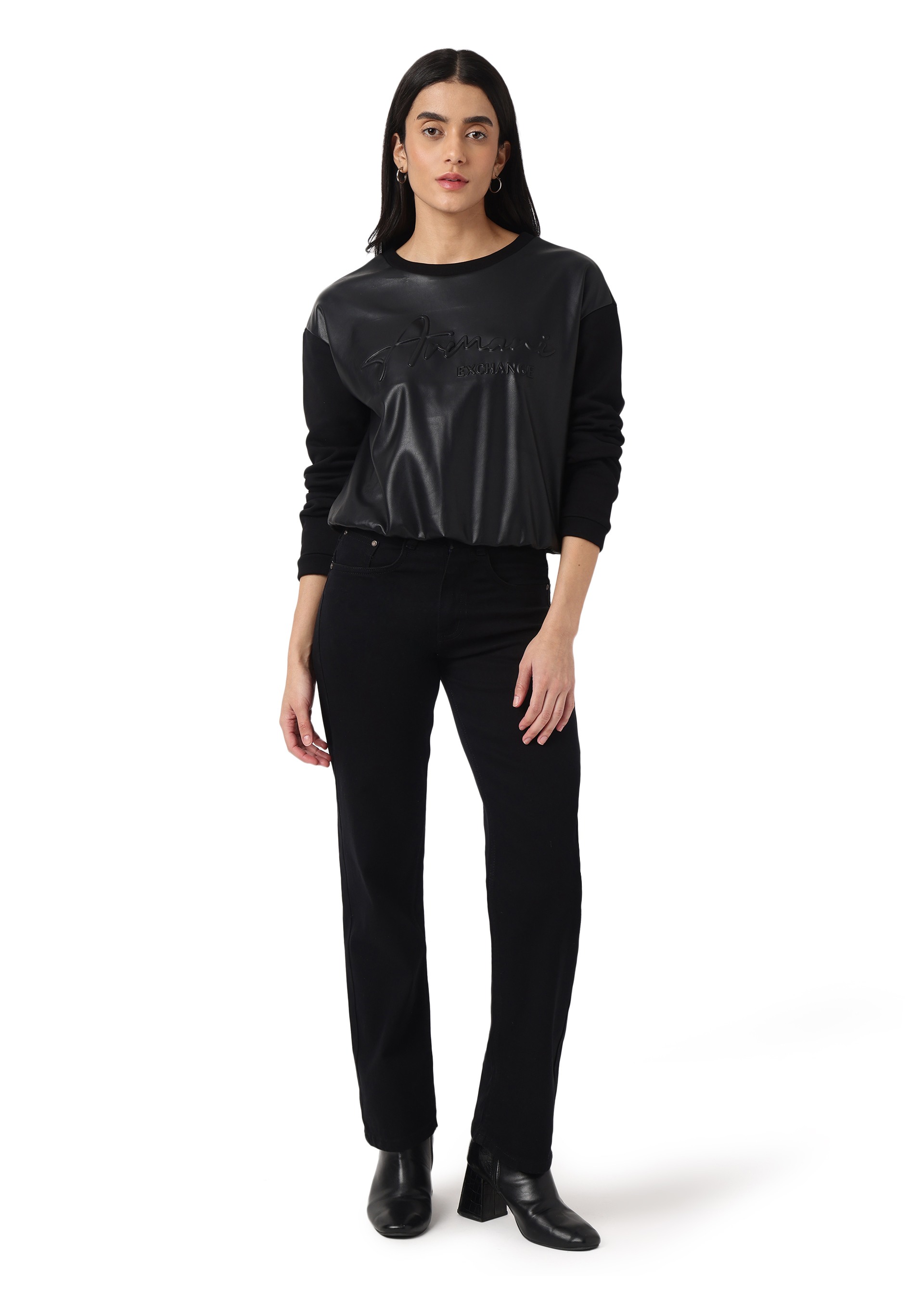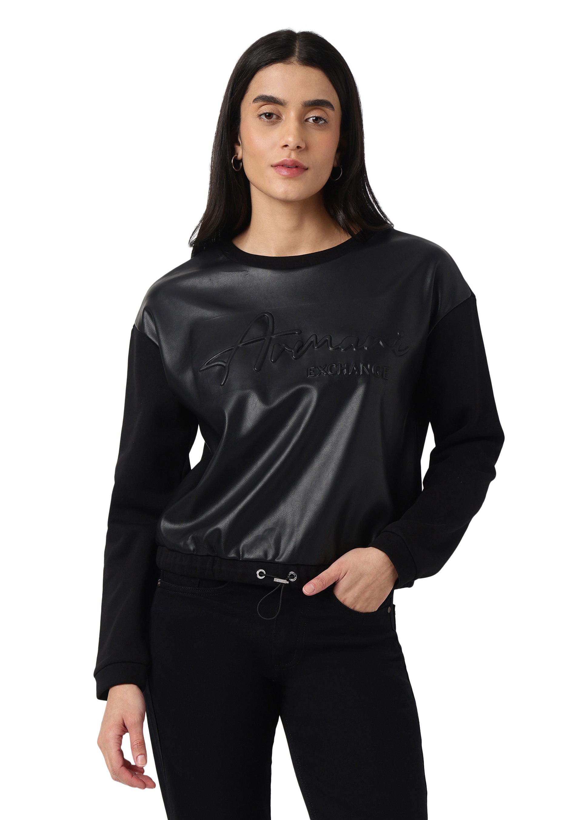 The Eco Leather sweatshirt by Armani Exchange offers a chic, cropped design with dropped shoulders. The front panel is crafted from sleek PU leather, while the sleeves and back are made from soft fleece. An embossed tonal logo signature adds a refined touch, making this sweatshirt a stylish blend of modern edge and comfort
