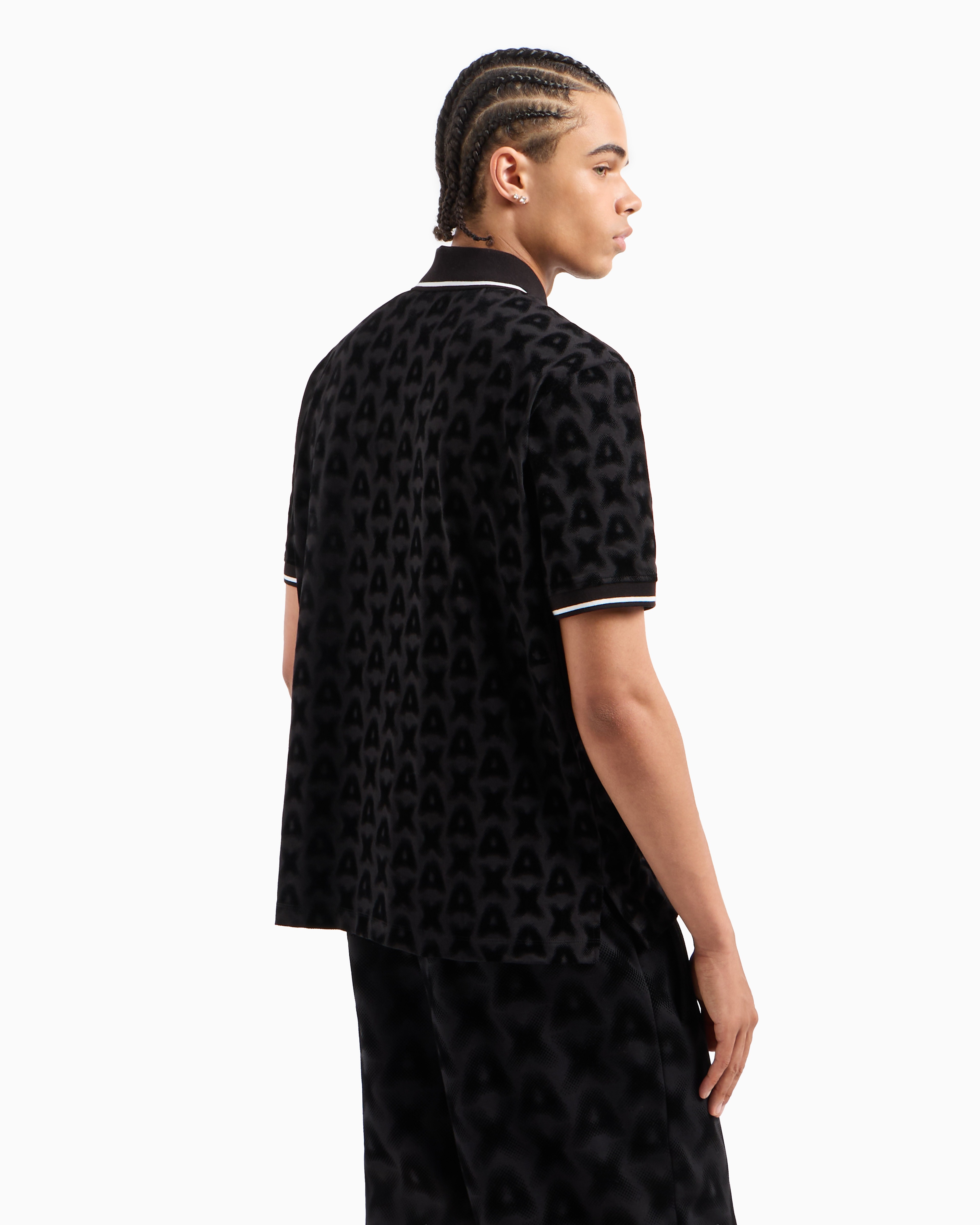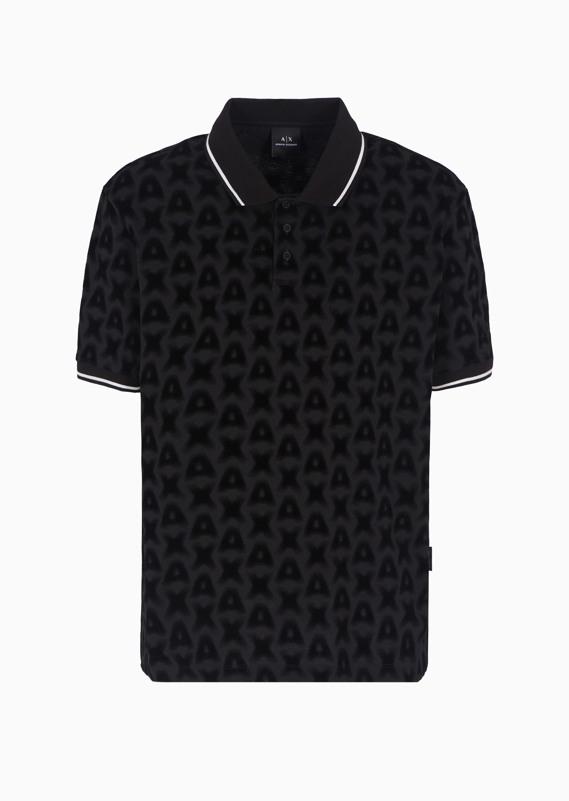 Make a bold statement with this polo from the Flock Allover Collection. Crafted from heavy cotton jersey, it features contrast tipping on the collars and sleeves, with an allover flock logo design, offering a perfect blend of modern style and comfort.