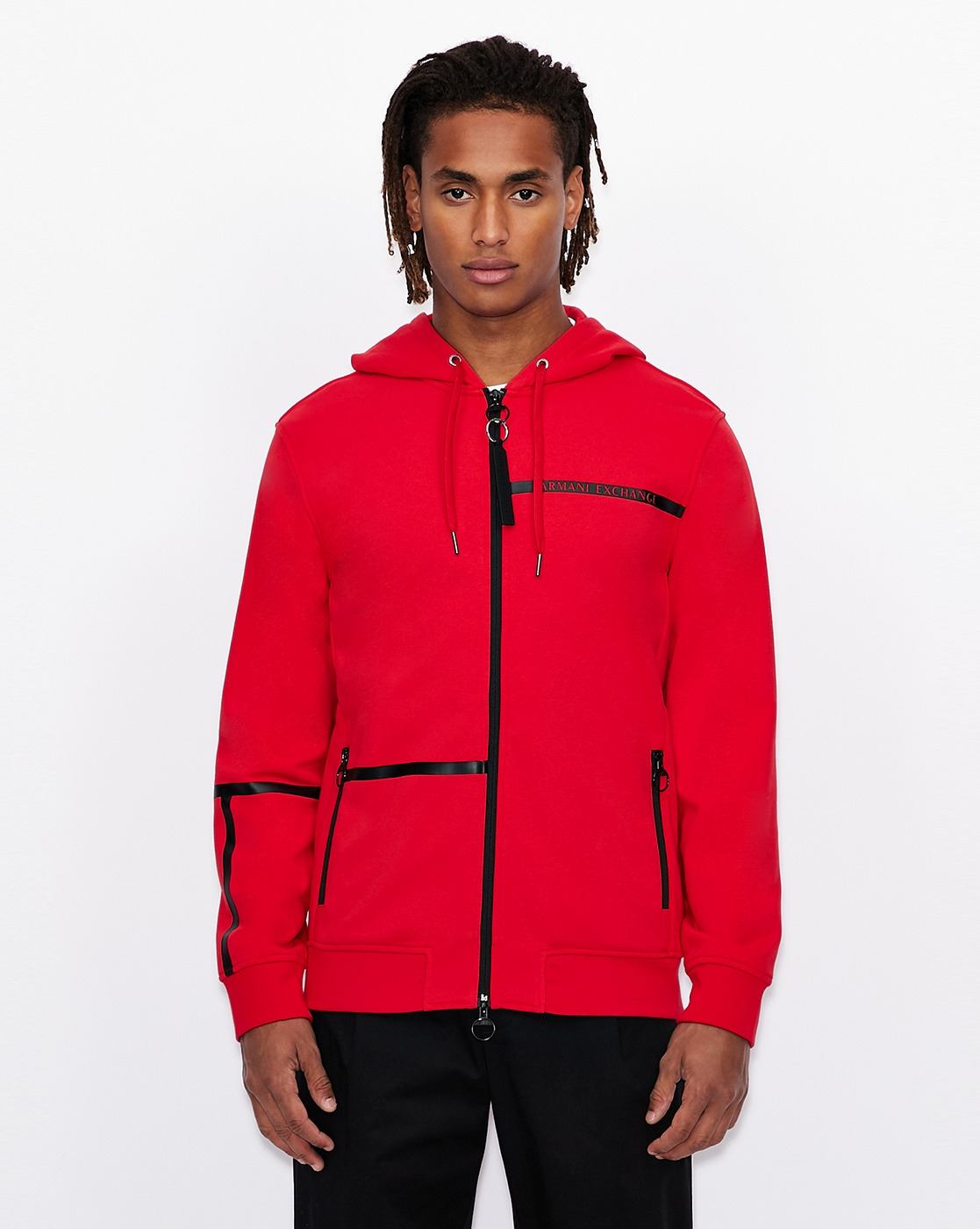 If you had to make a list of the essential attributes of a leisure-time sweatshirt, they would be a hood, logo, and pouch pocket. Armani Exchange ticks off every item on the list to score the winning goal.