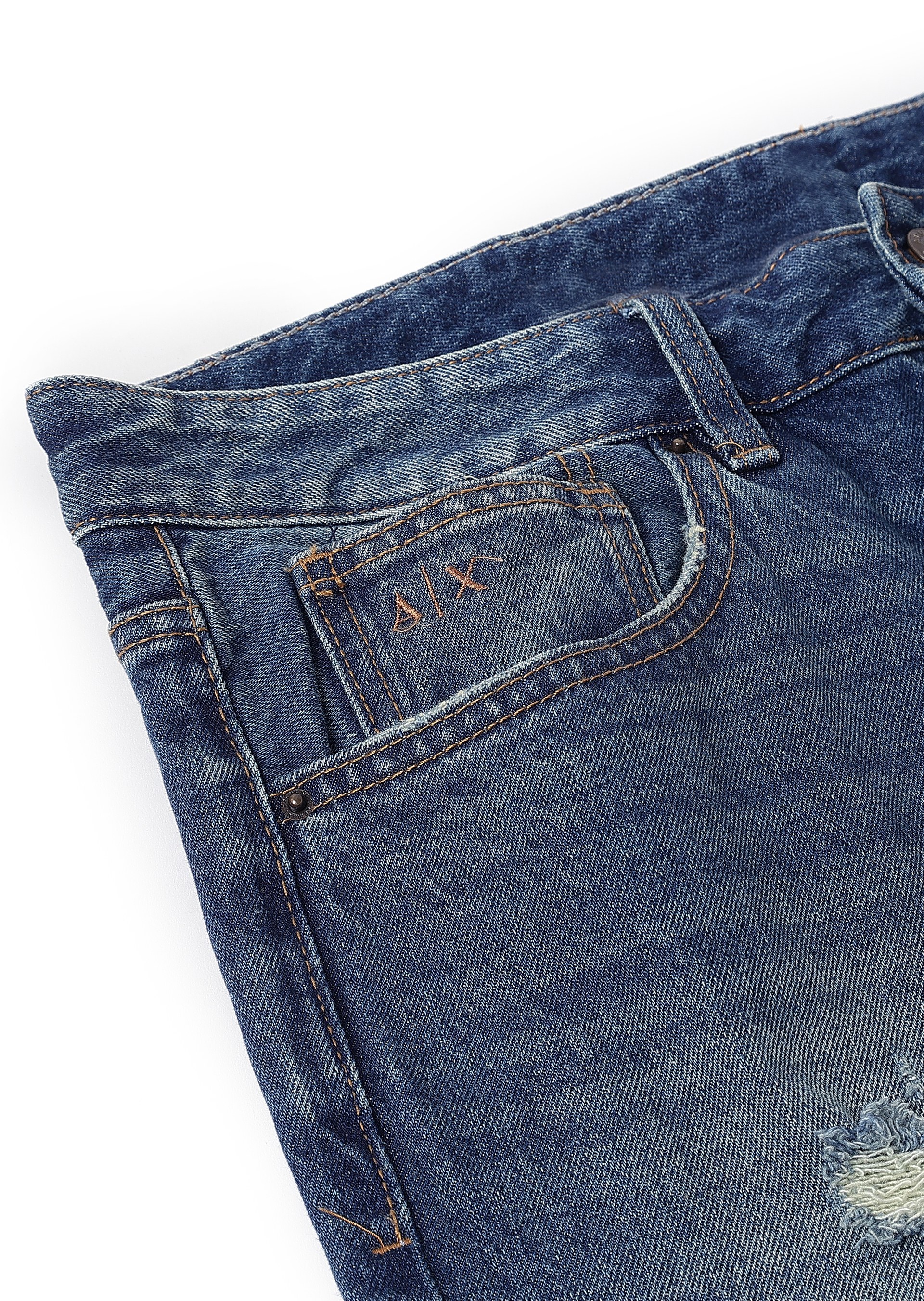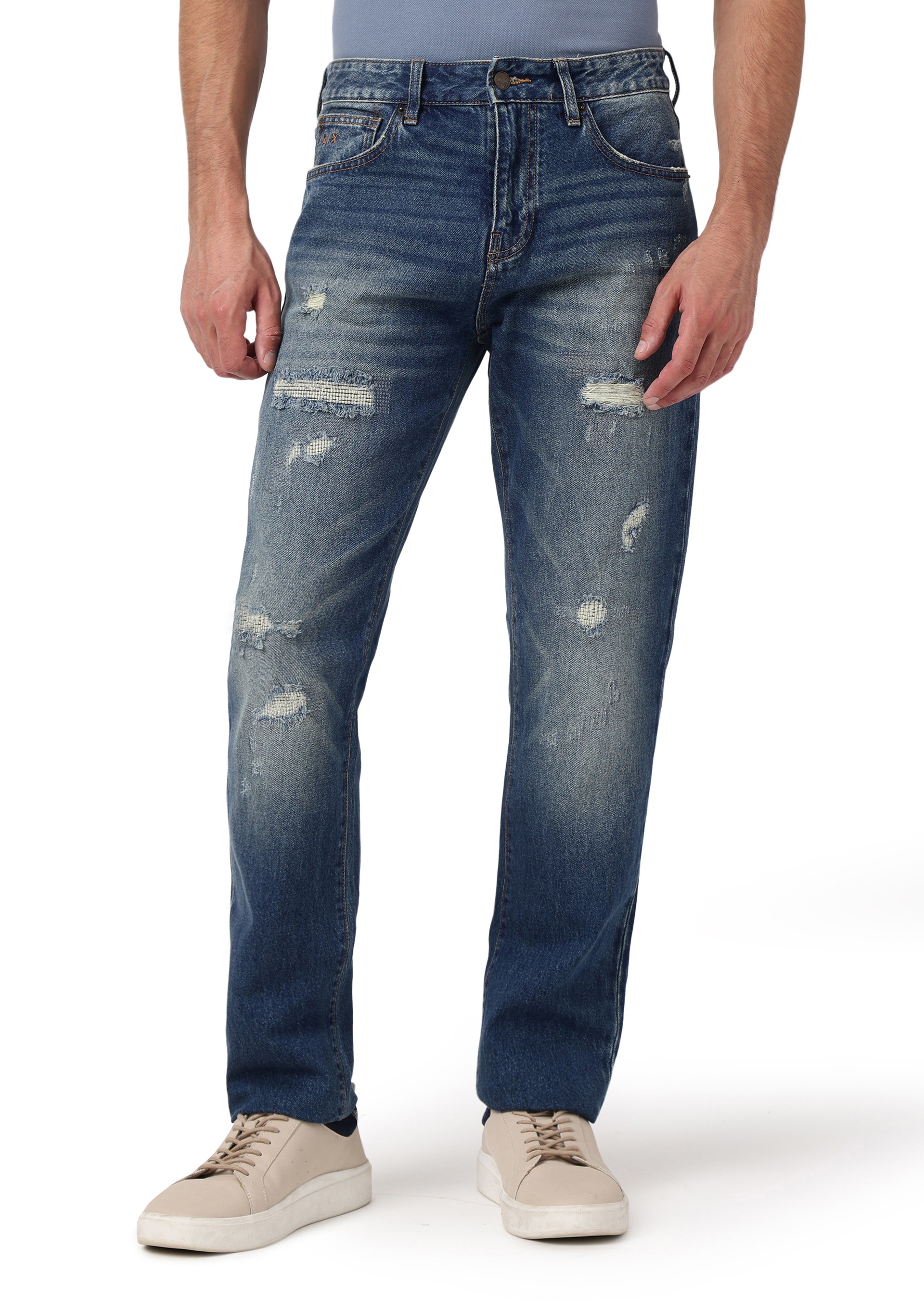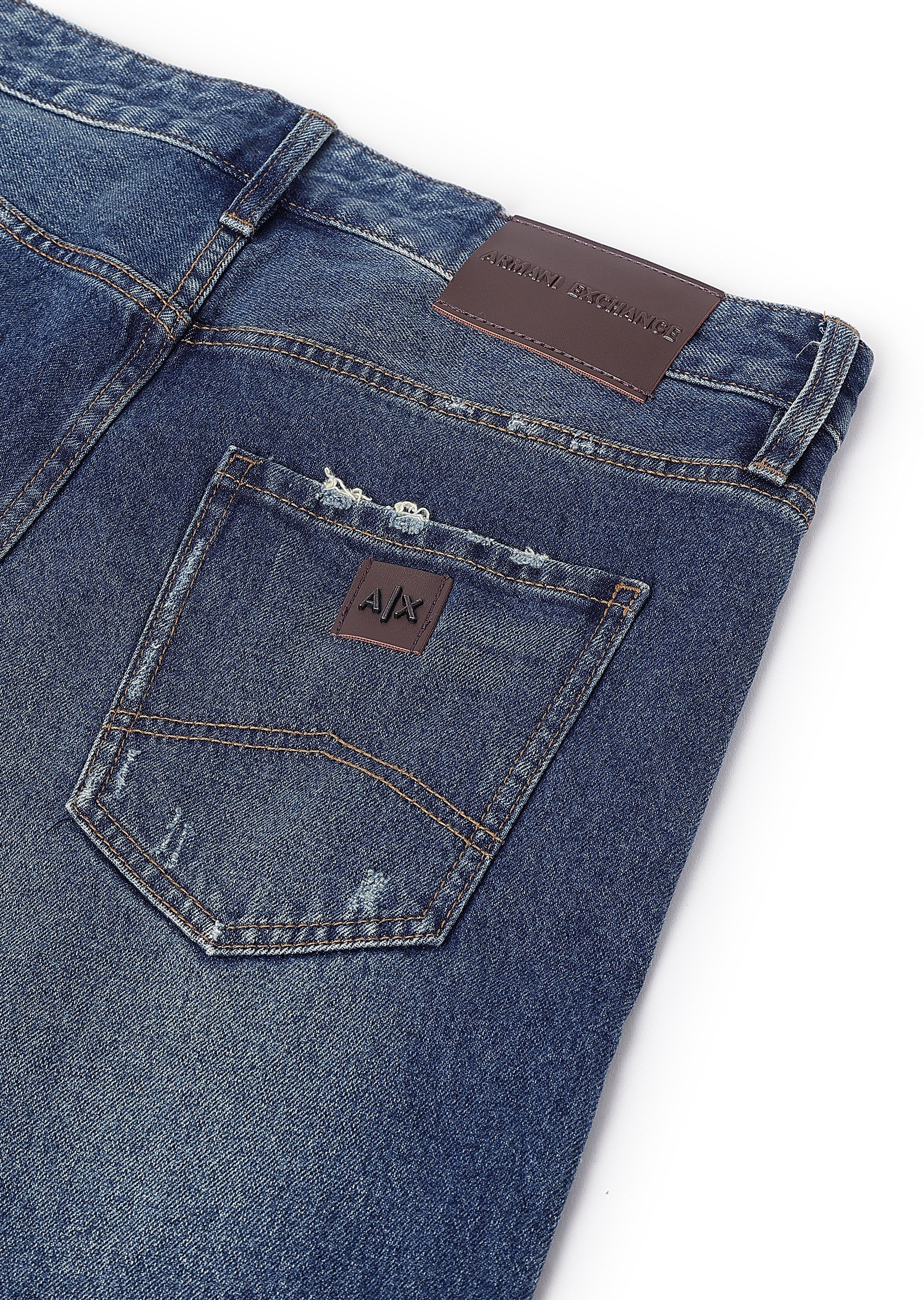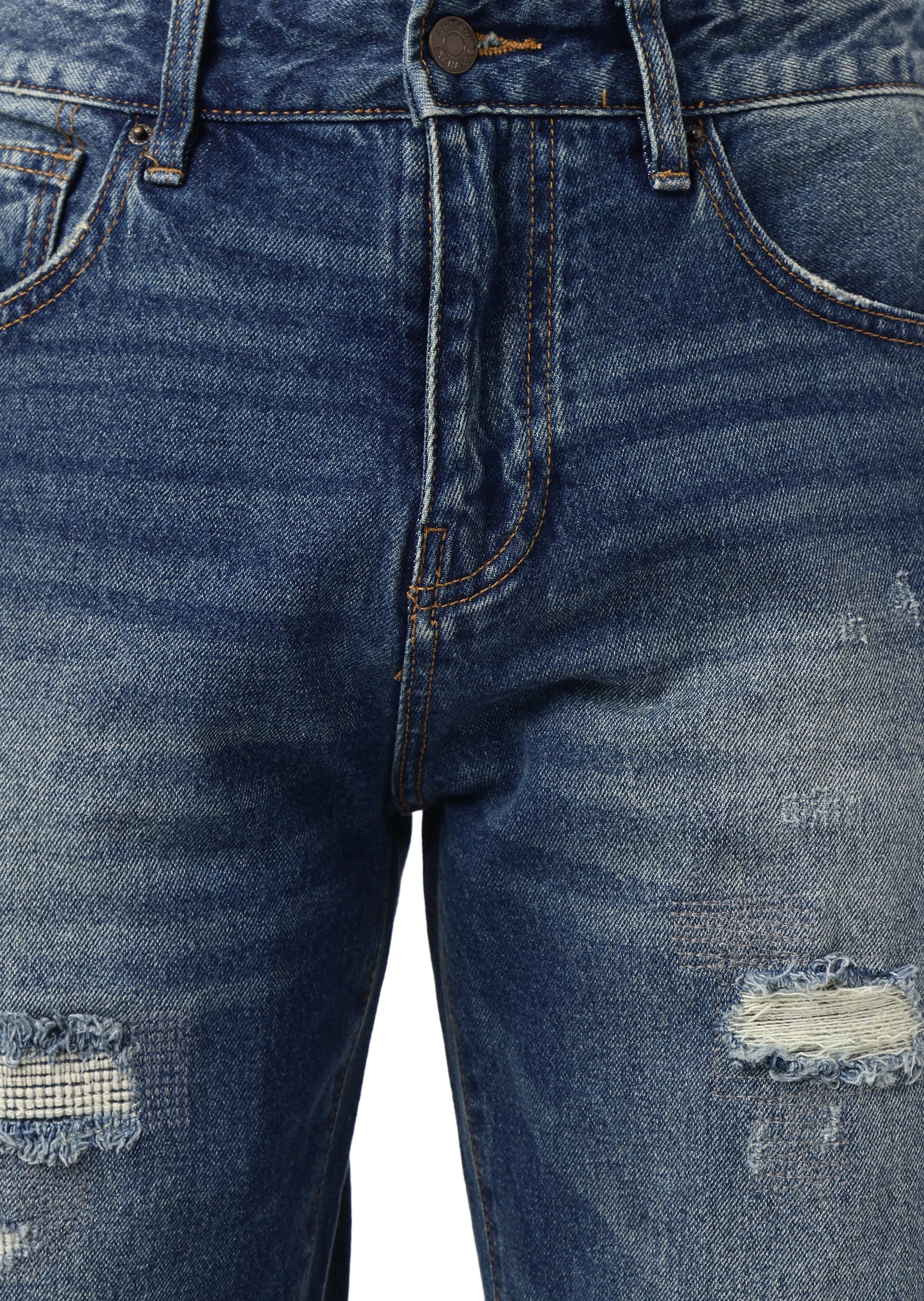 Step up your denim style with these special wash jeans, crafted from comfort cotton denim. Featuring a scraped effect with whiskers on the top block, they showcase destroyed details, abrasions, and breakages, enhanced by patched and repaired accents. Shiny brass trims, tobacco stitching, and a leather patch on the back complete the look with a rugged, vintage-inspired finish.