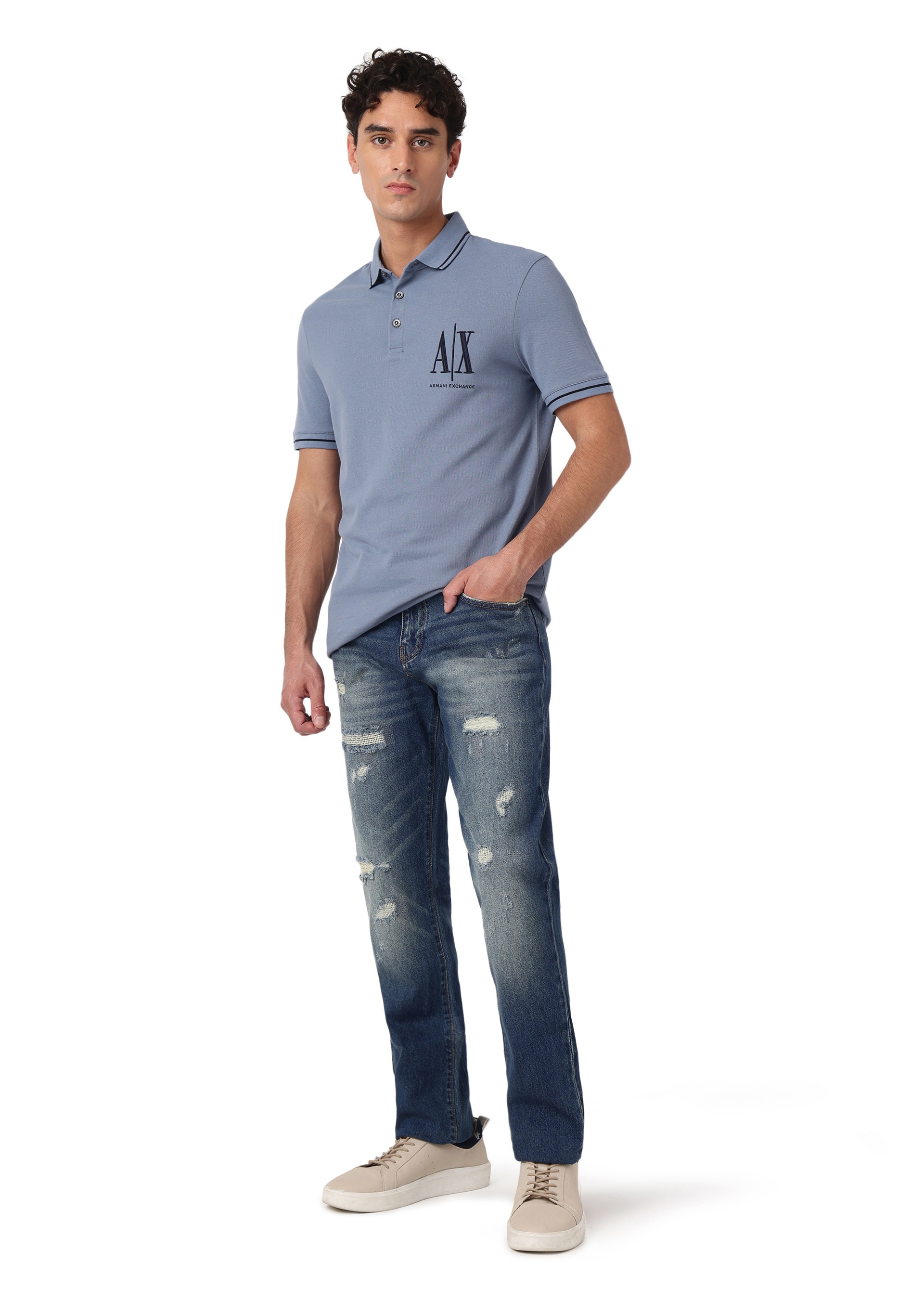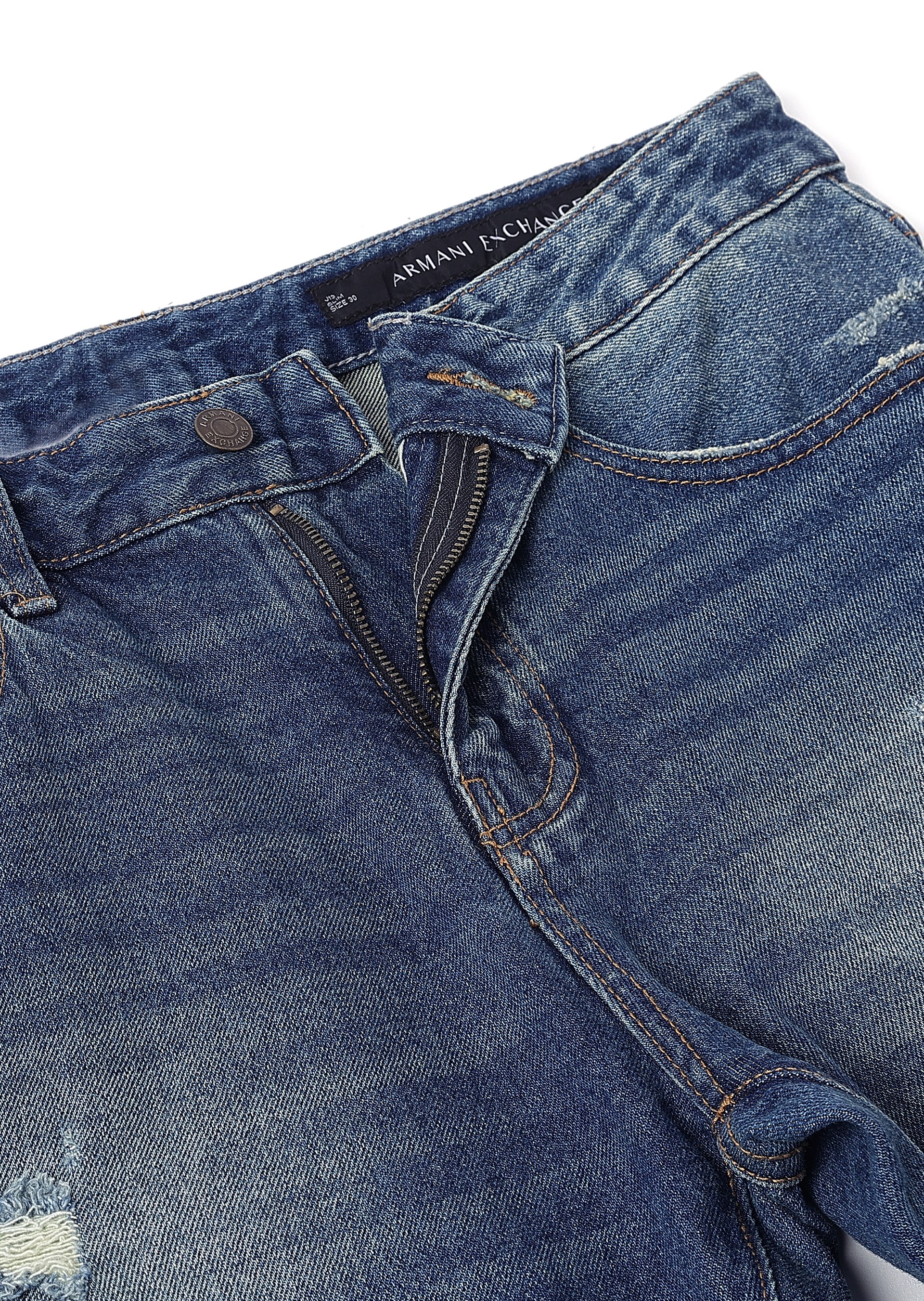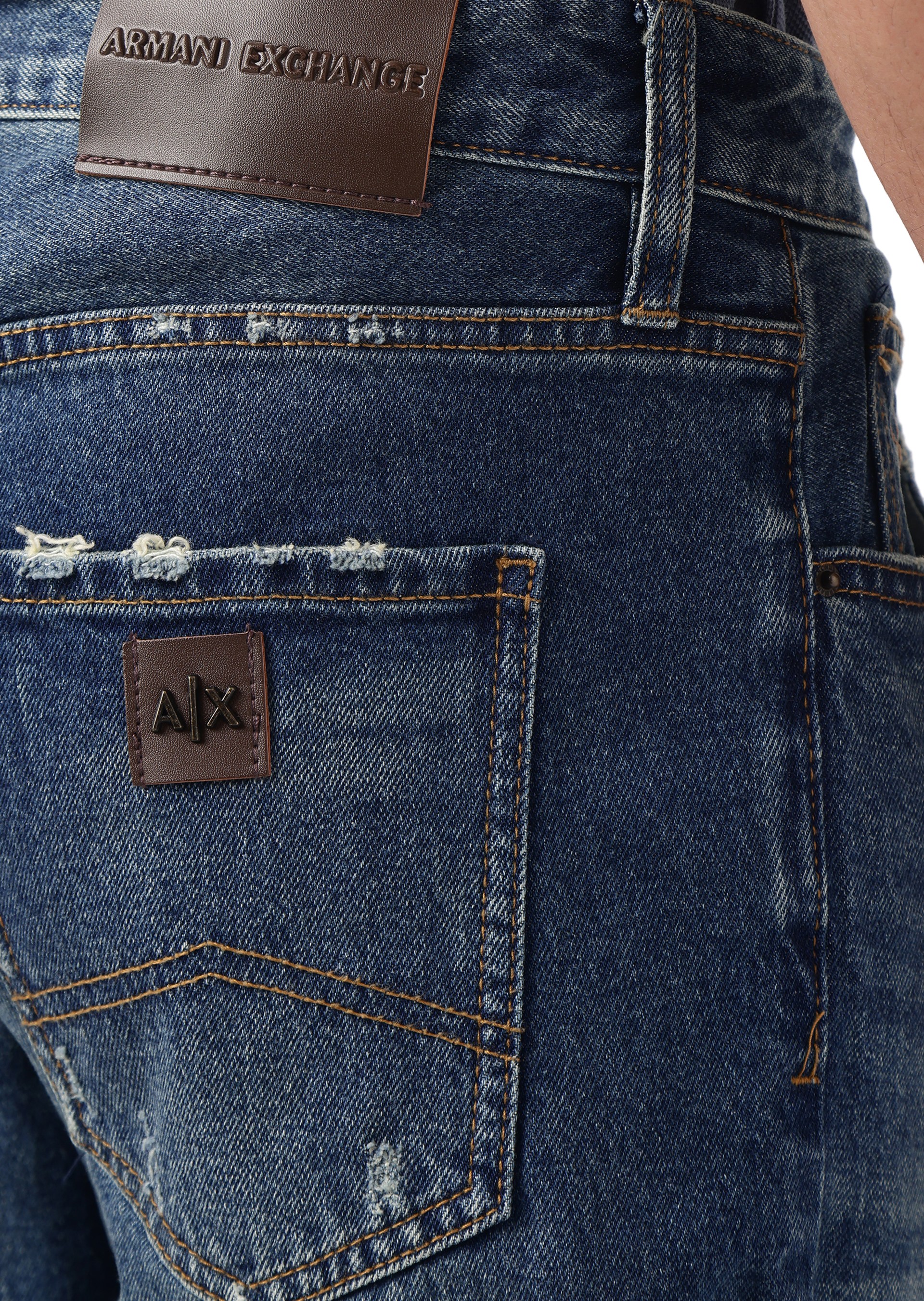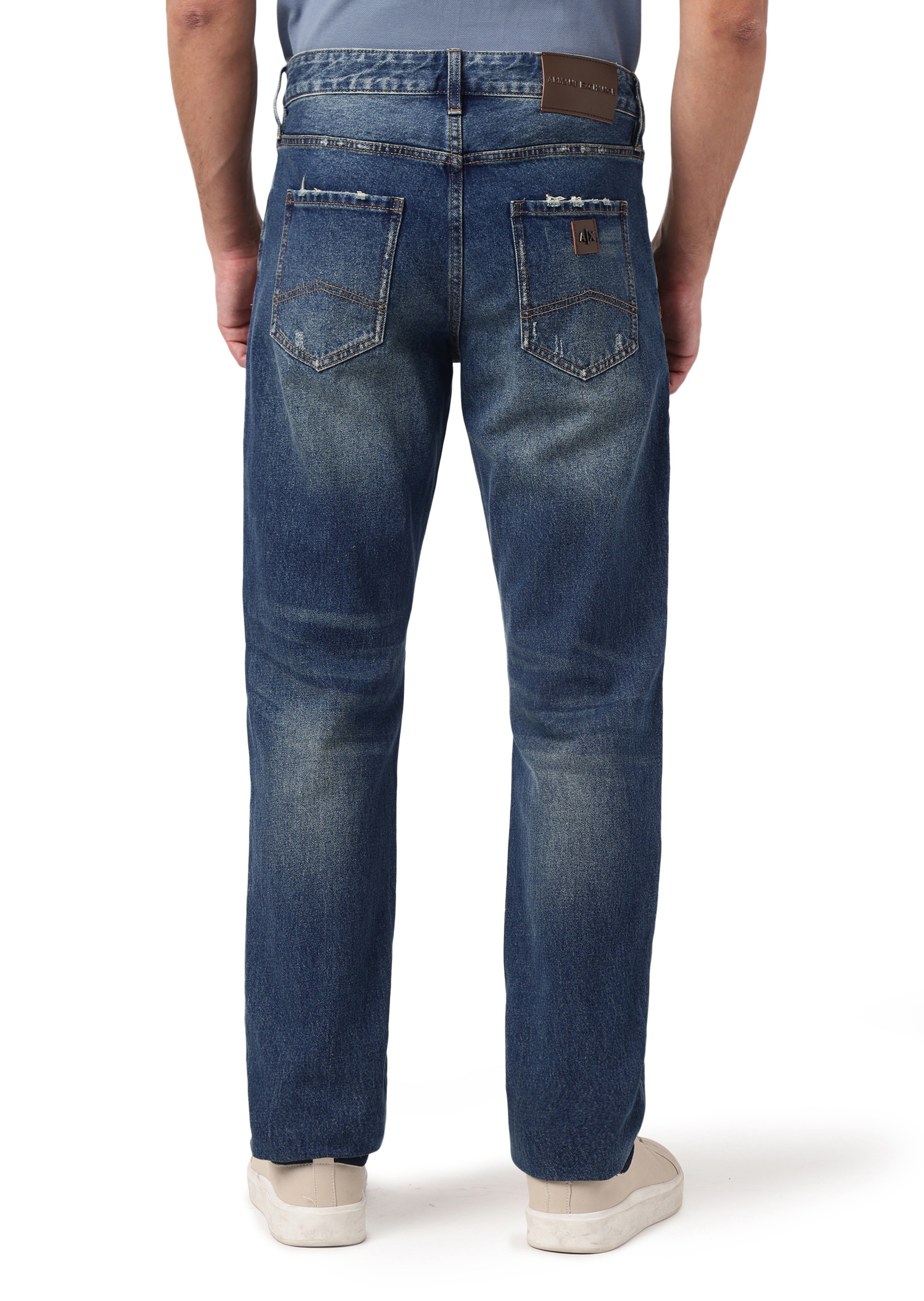 Step up your denim style with these special wash jeans, crafted from comfort cotton denim. Featuring a scraped effect with whiskers on the top block, they showcase destroyed details, abrasions, and breakages, enhanced by patched and repaired accents. Shiny brass trims, tobacco stitching, and a leather patch on the back complete the look with a rugged, vintage-inspired finish.