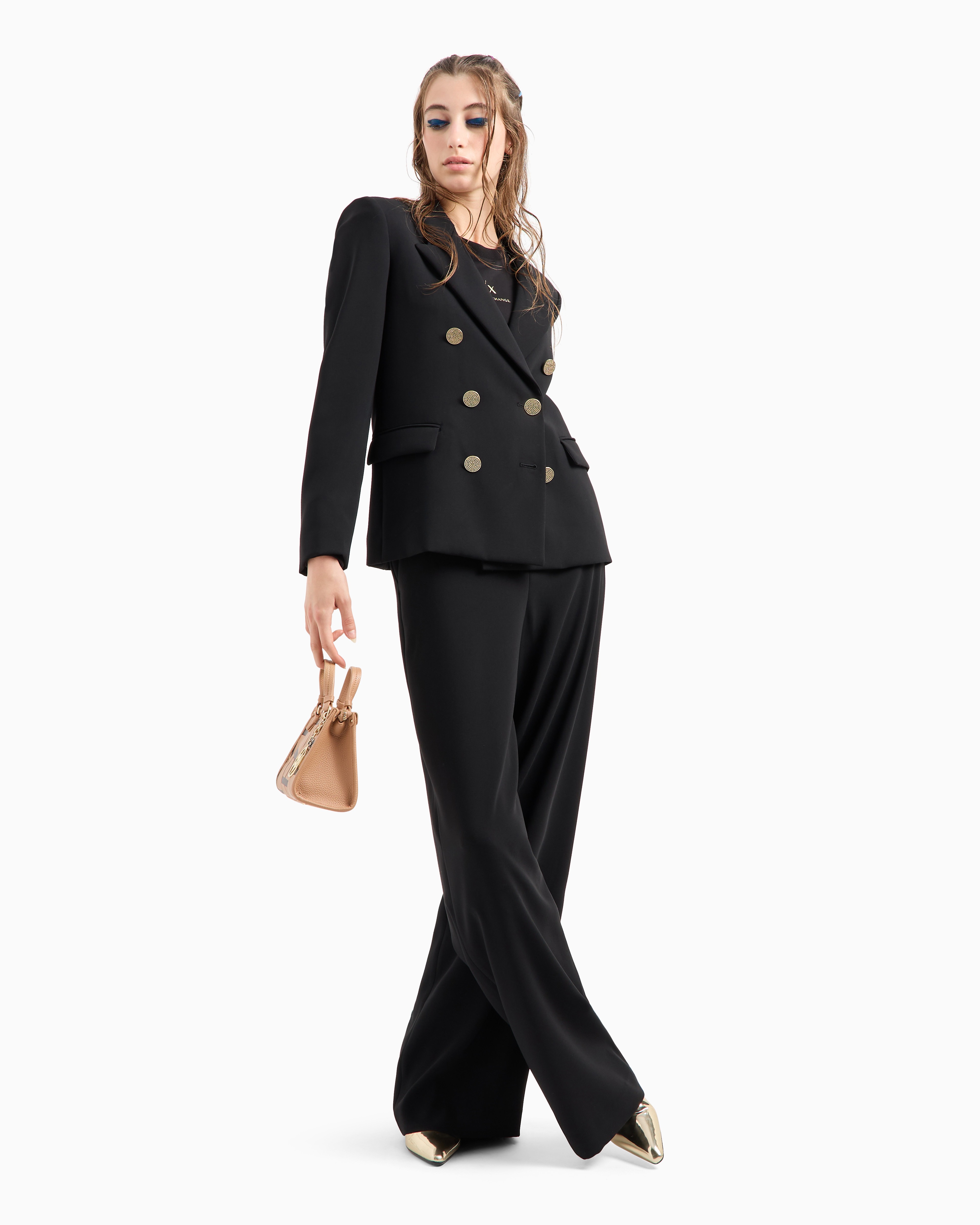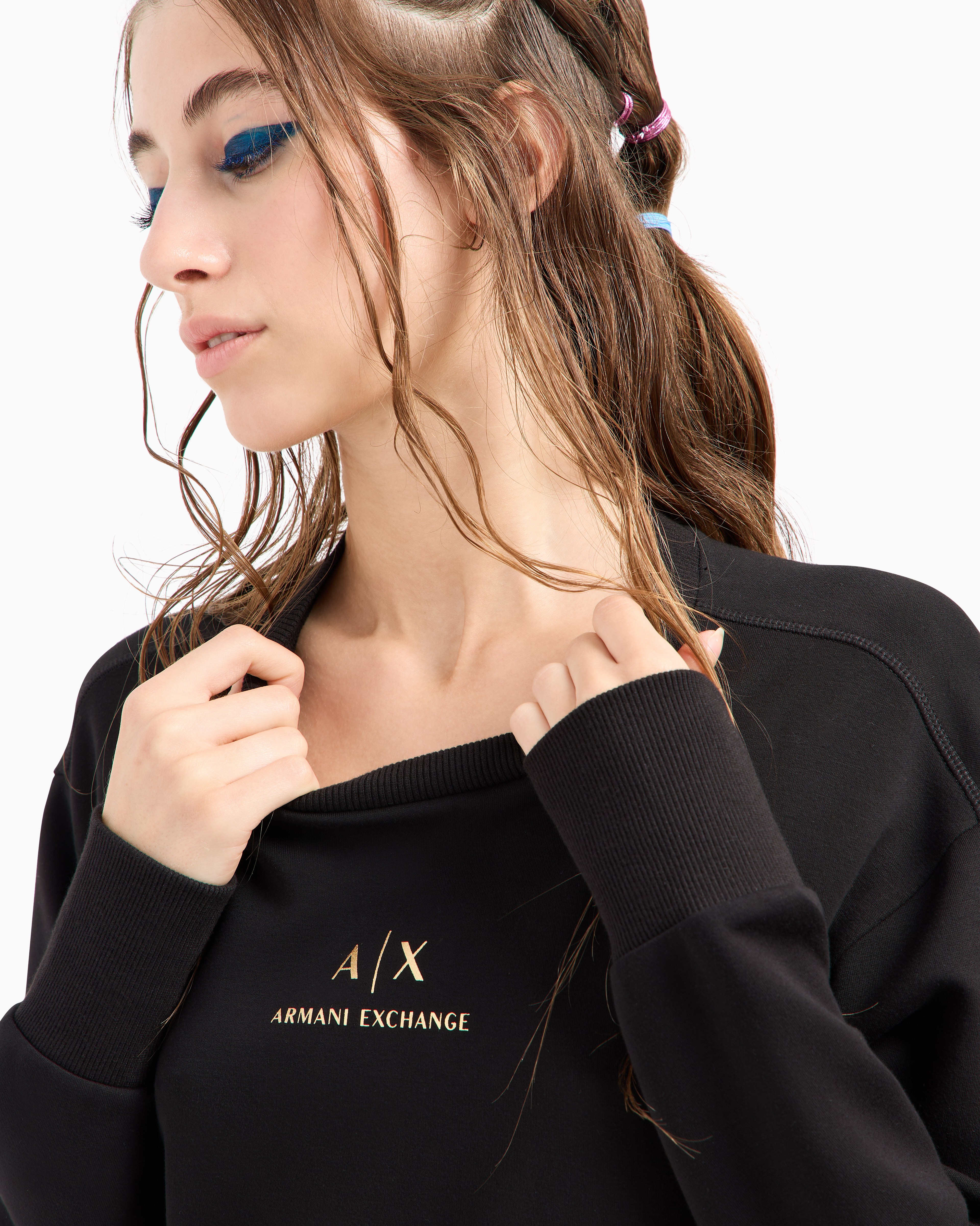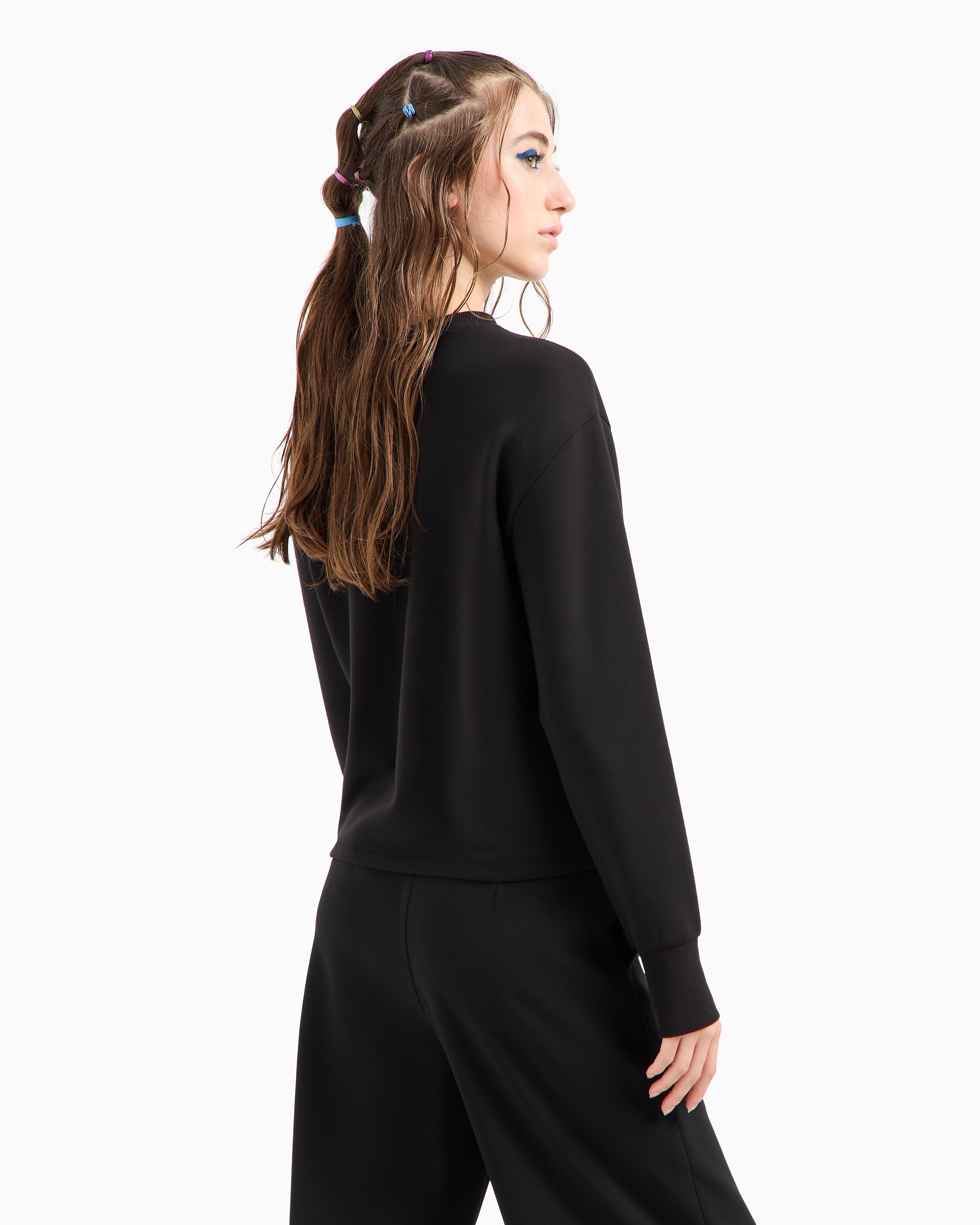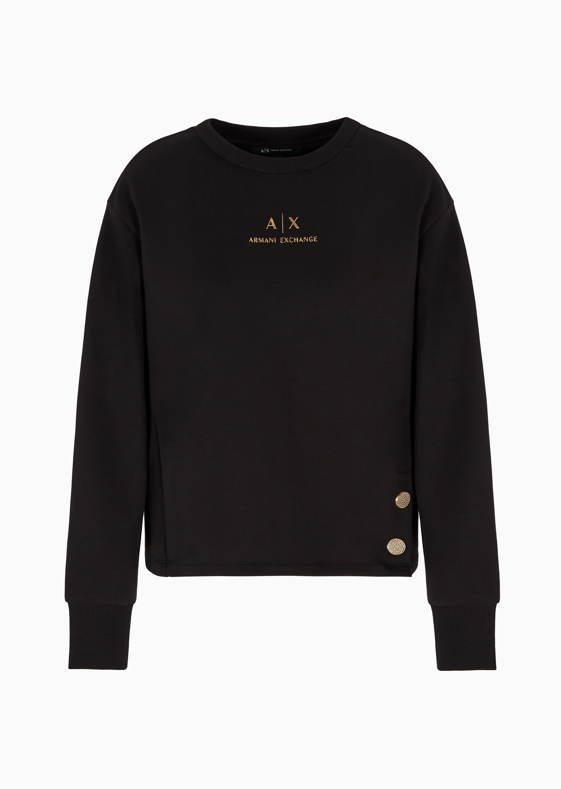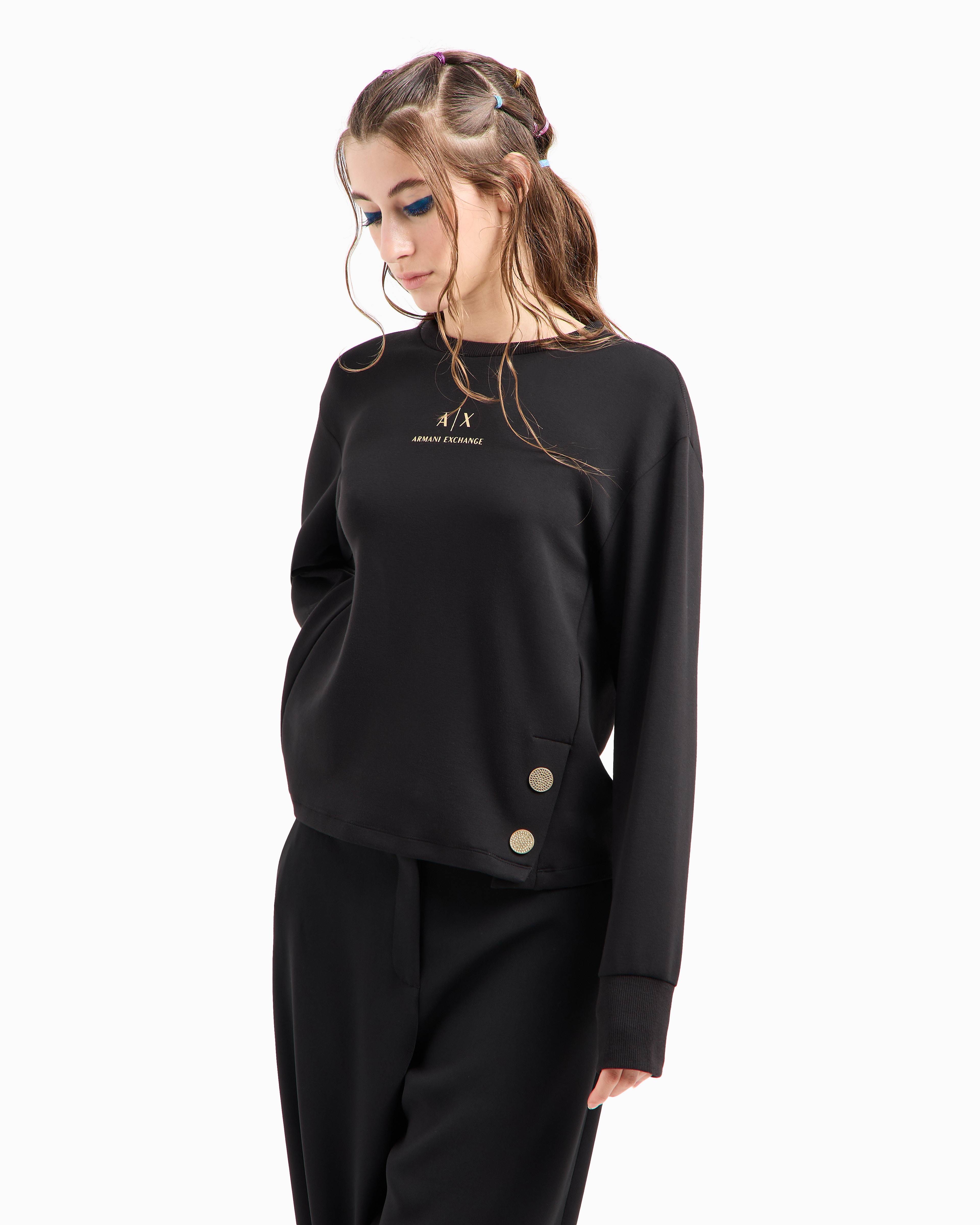 The Jewel Buttons sweatshirt by Armani Exchange, from the Early Holiday collection, features dropped shoulders and ergonomic cuts for a flattering fit. Made from viscose poly stretch scuba, it showcases two jewel buttons in the front and a foil logo in the center, adding a touch of festive elegance to a comfortable, stylish design.