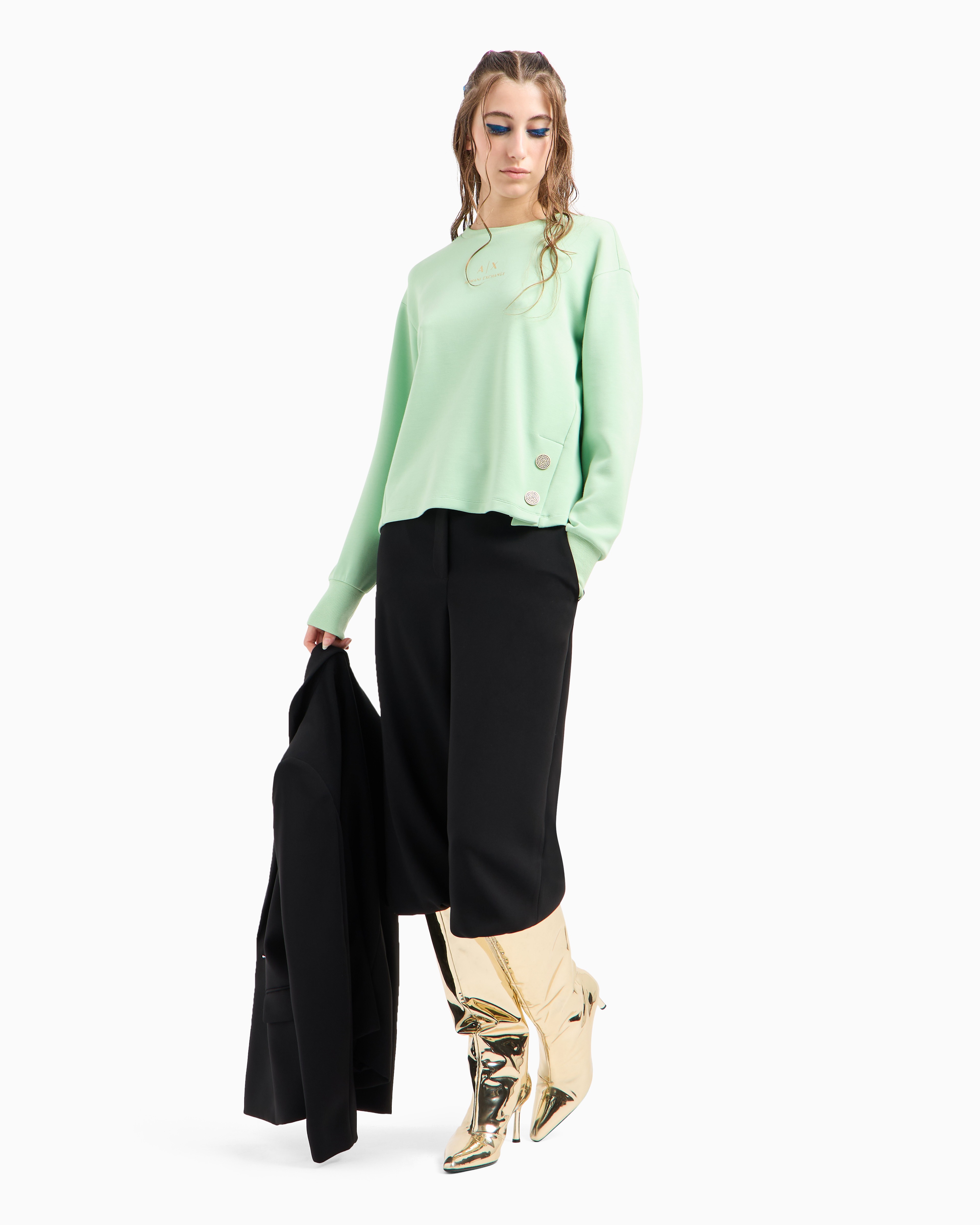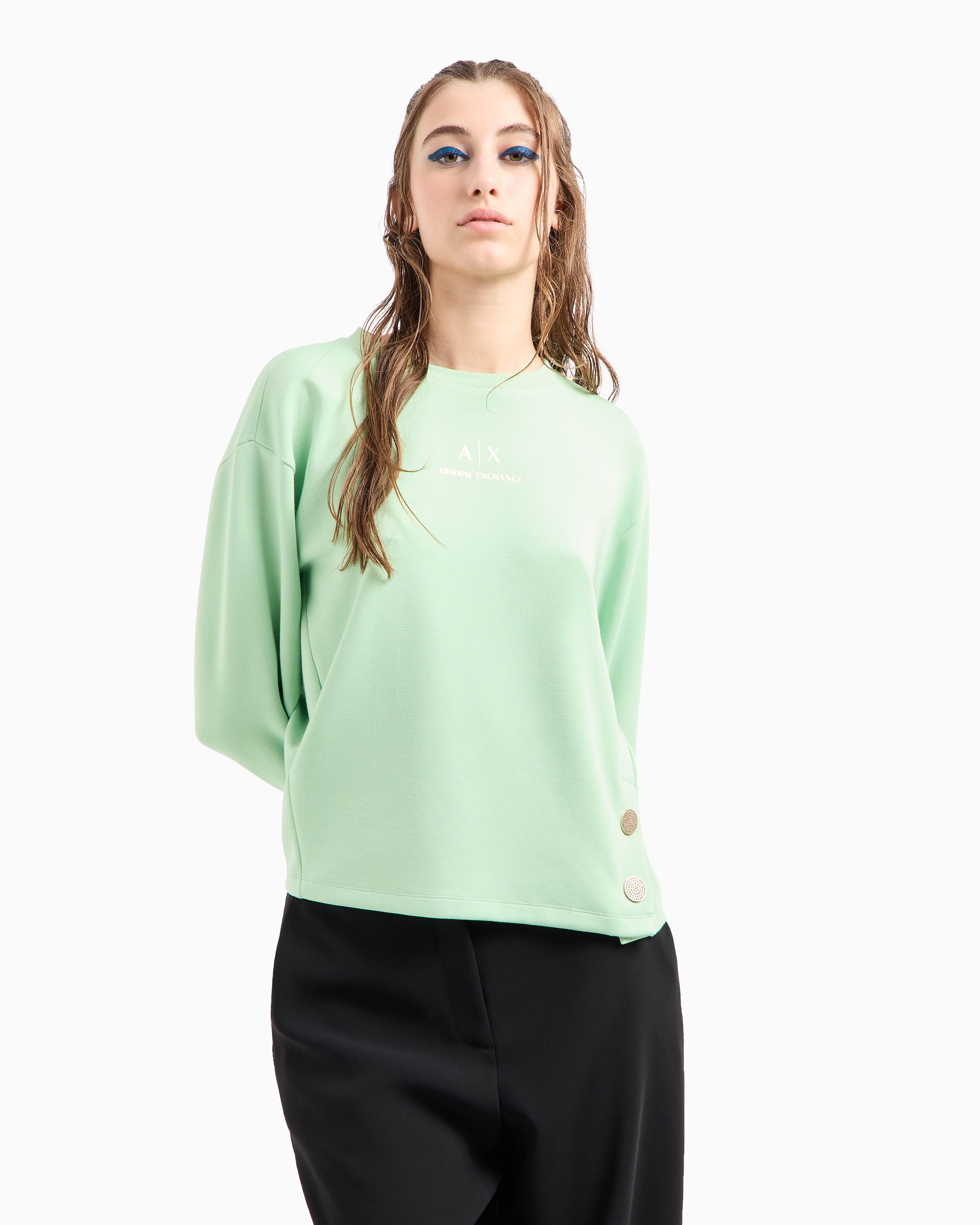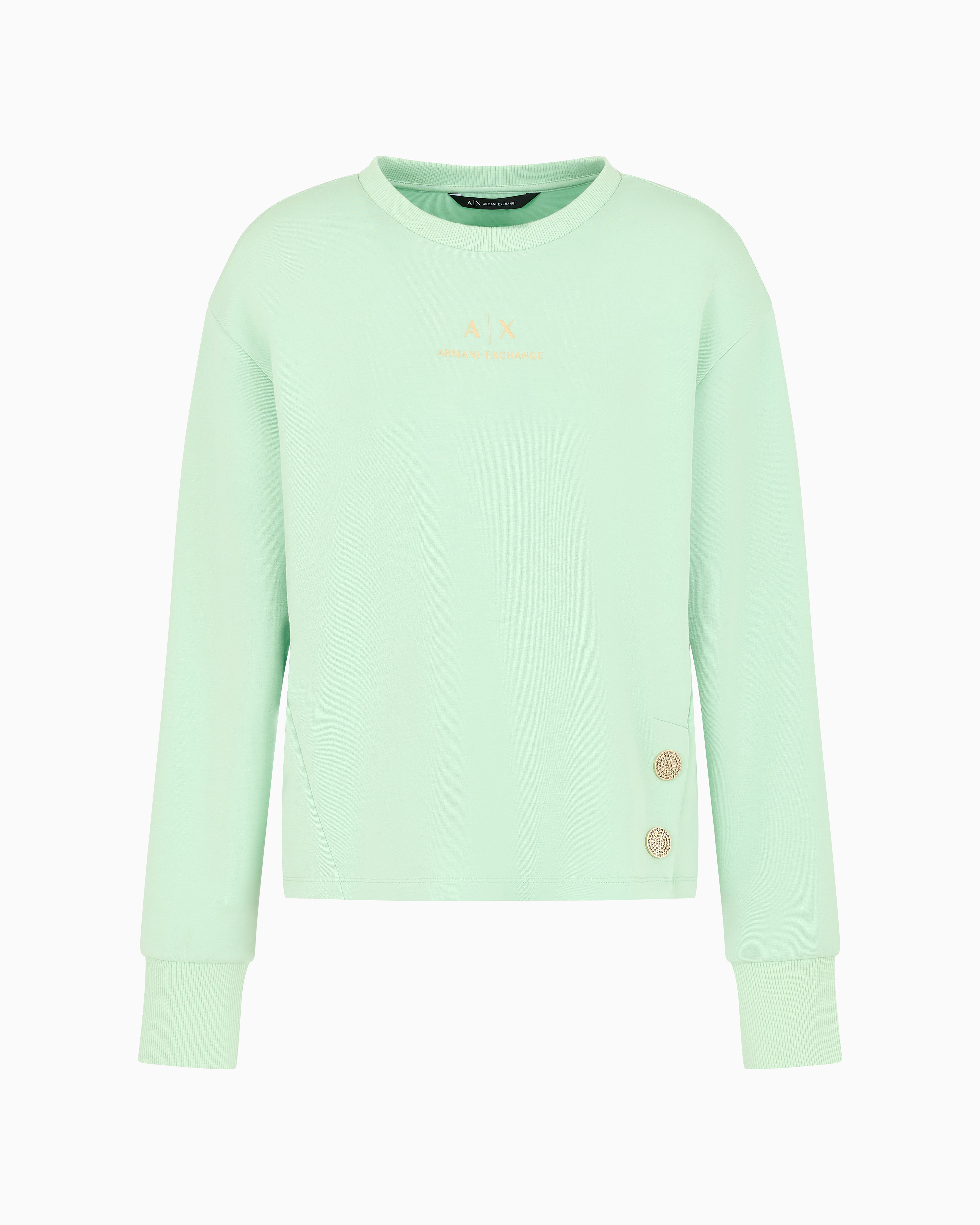 The Jewel Buttons sweatshirt by Armani Exchange, from the Early Holiday collection, features dropped shoulders and ergonomic cuts for a flattering fit. Made from viscose poly stretch scuba, it showcases two jewel buttons in the front and a foil logo in the center, adding a touch of festive elegance to a comfortable, stylish design.