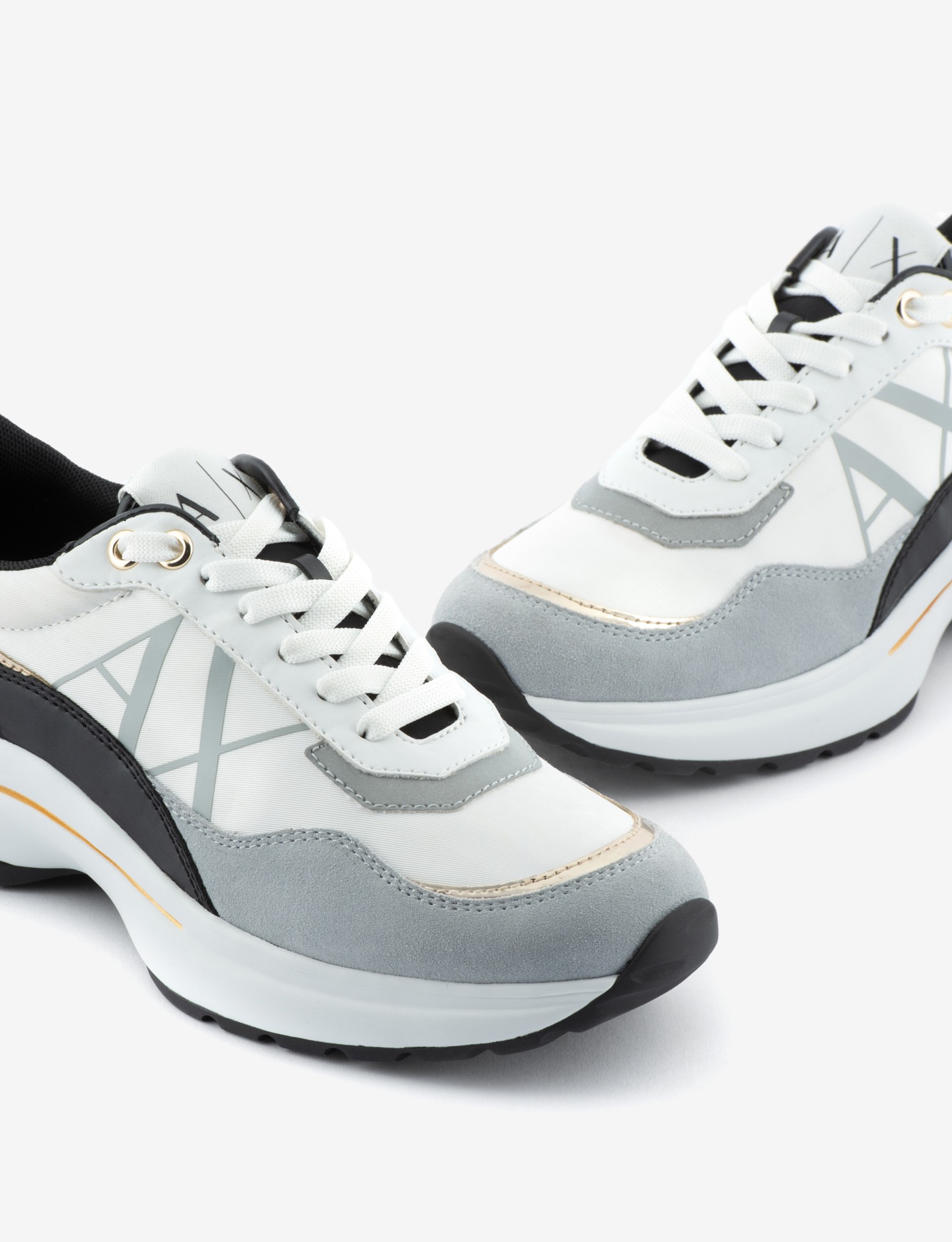 Metallic flashes light up these multi-material sneakers with suede inserts and mirrored details for a reflection-like effect. The model, with a hi-tech construction, is defined by the sinuous two-tone sole, with embossed rear logo.