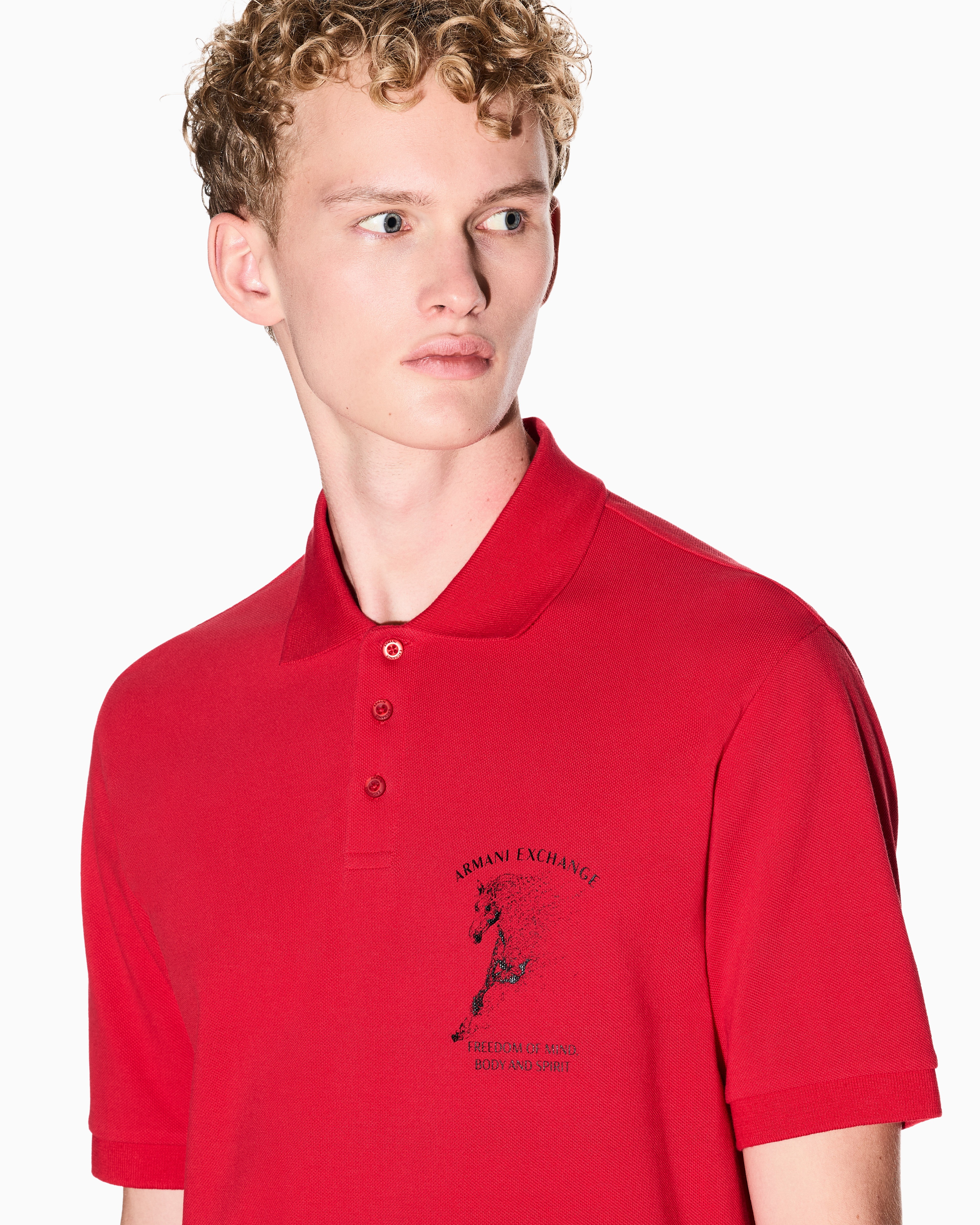 - Cotton piquet, three logoed buttons on placket, left chest with gold graphic and logo lettering