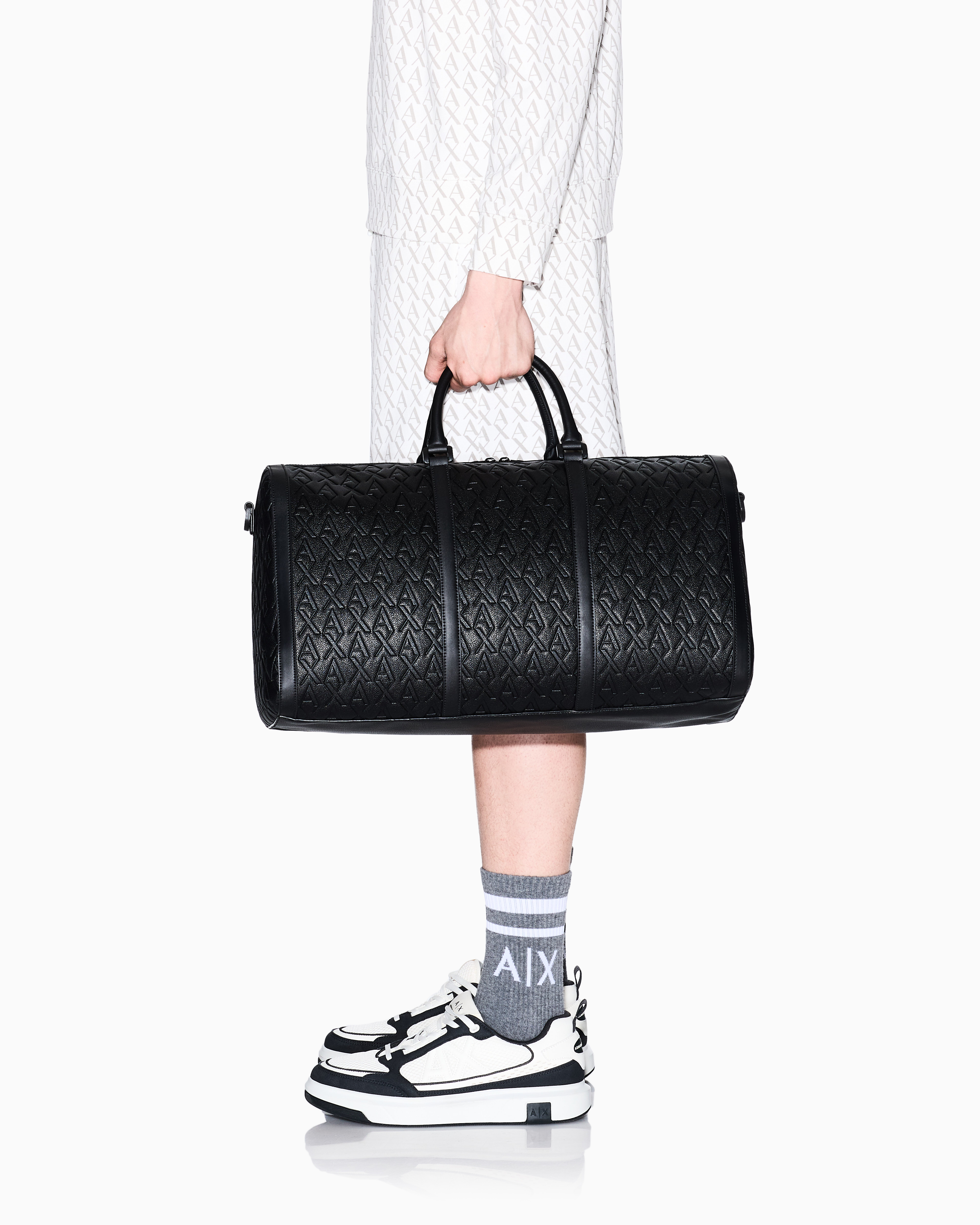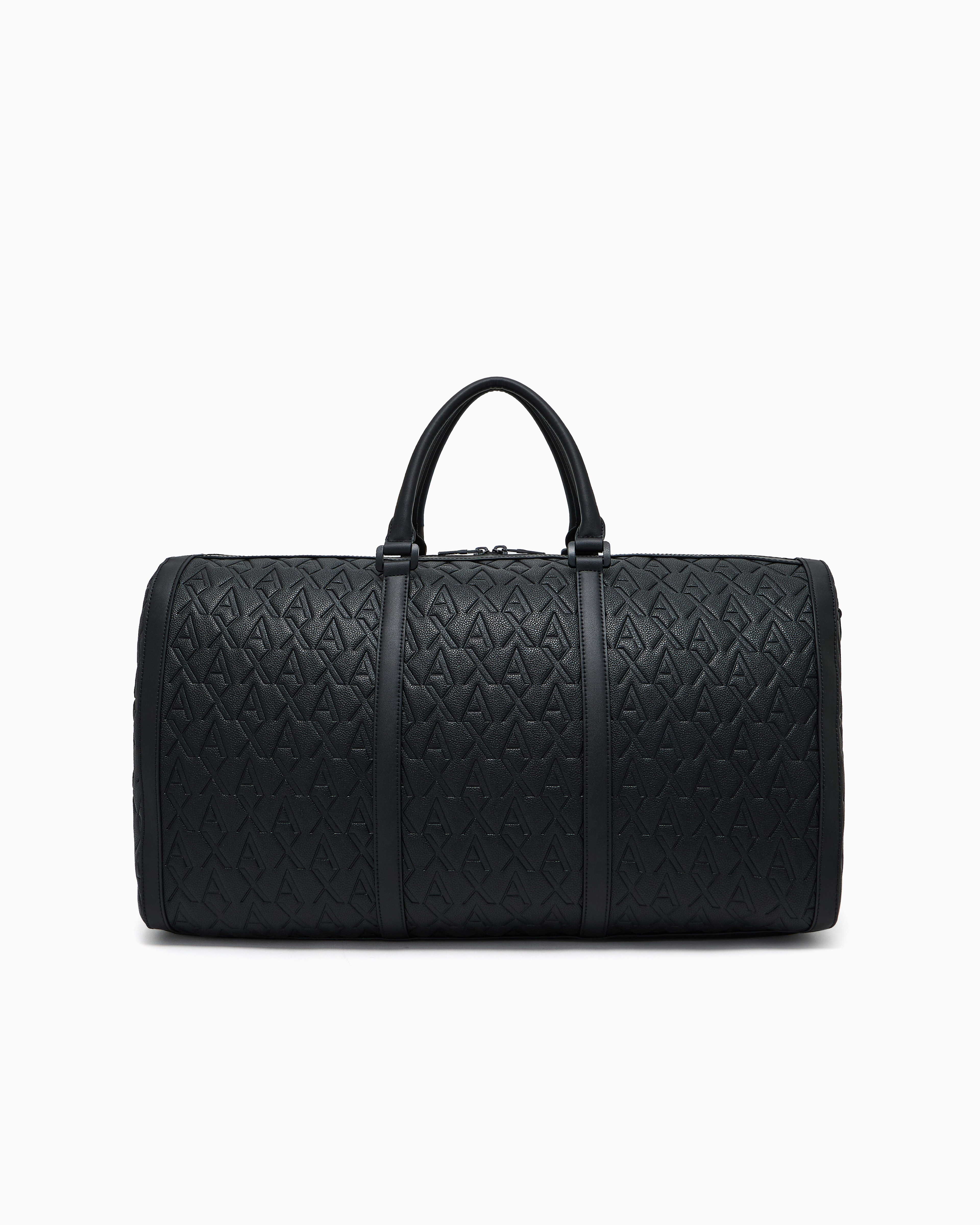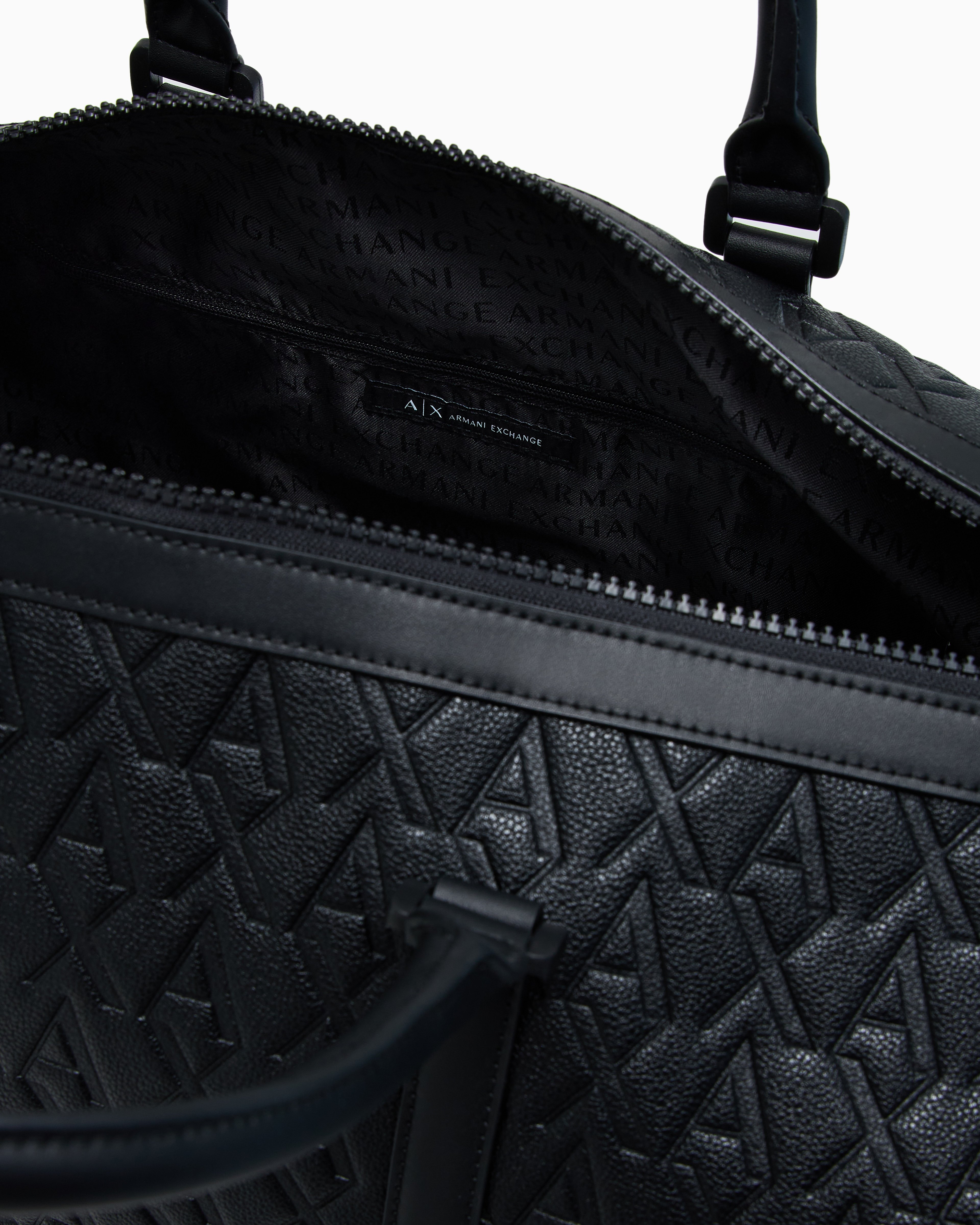 - Emblematic AX pattern in a maxi version with allover embossed logo, discreet yet striking effect, rugged looking hardwearing faux leather. Perfect combination of practicality and style, can be co-ordinated with all styles. Deerskin effect faux leather.