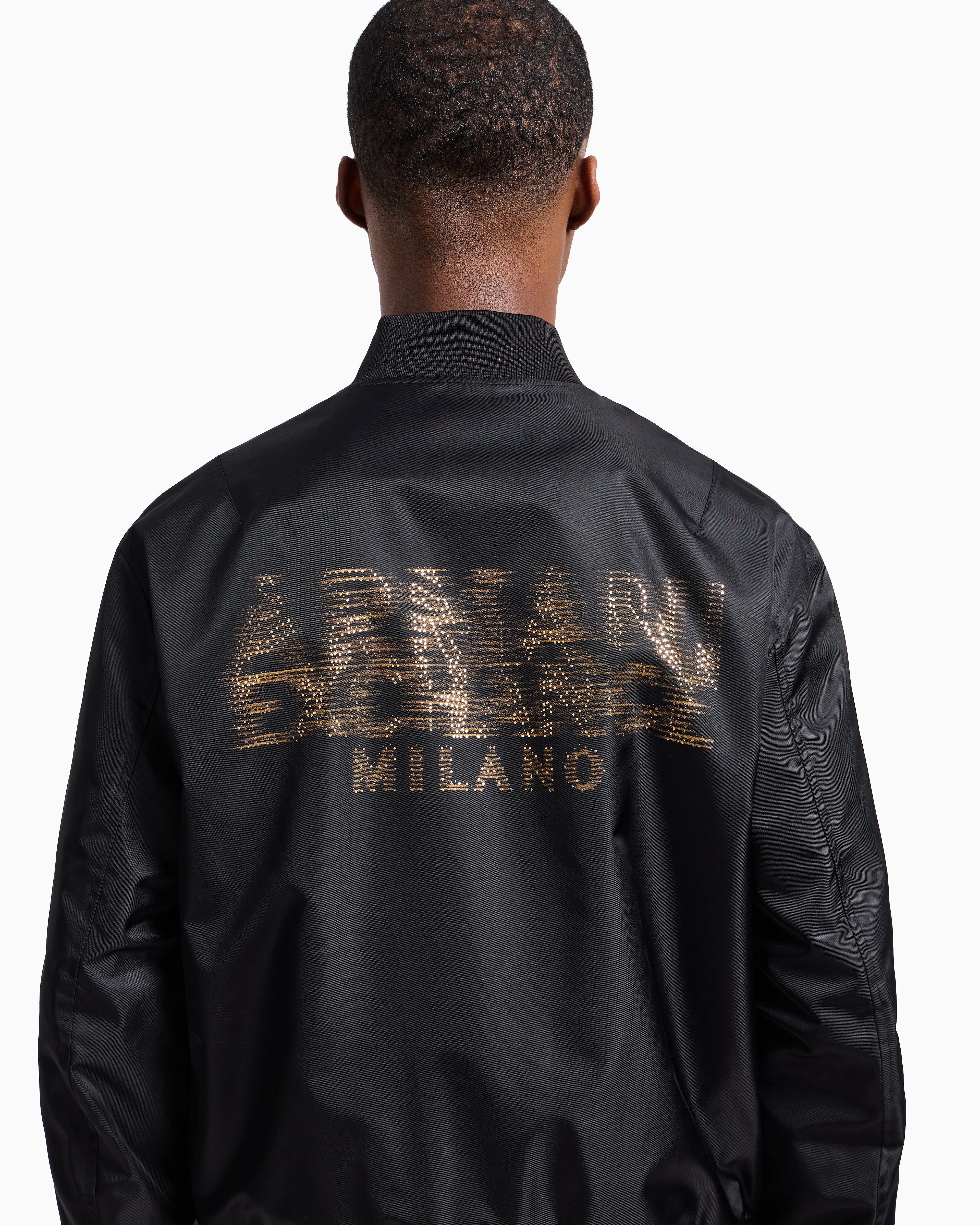 Elevate your style with the A|X Black & Gold Collection Jacket. Crafted from sleek nylon, it features a full zip, zipped pockets, and a striking golden macro AX logo on the back. A perfect fusion of luxury and modern design for a bold statement look.