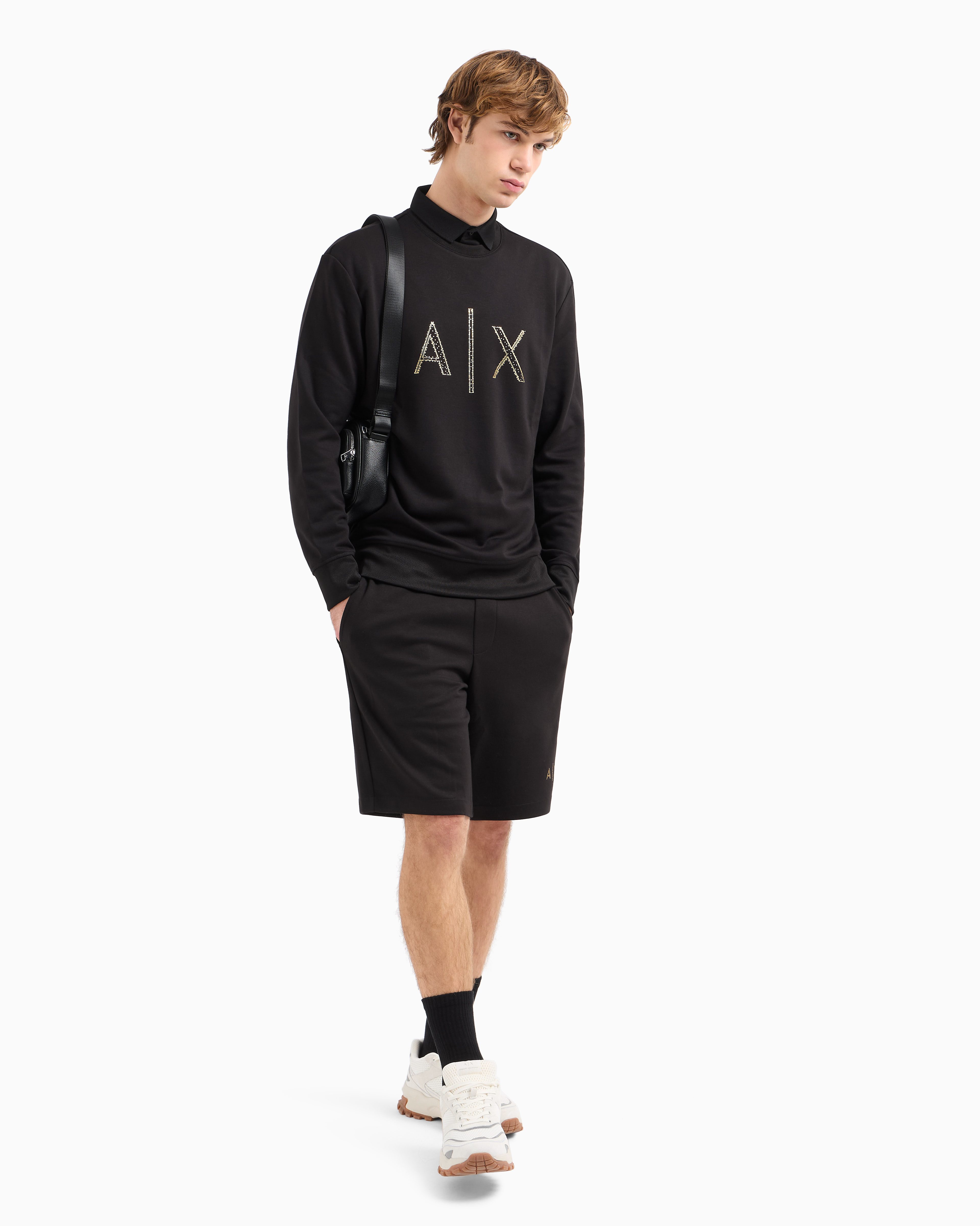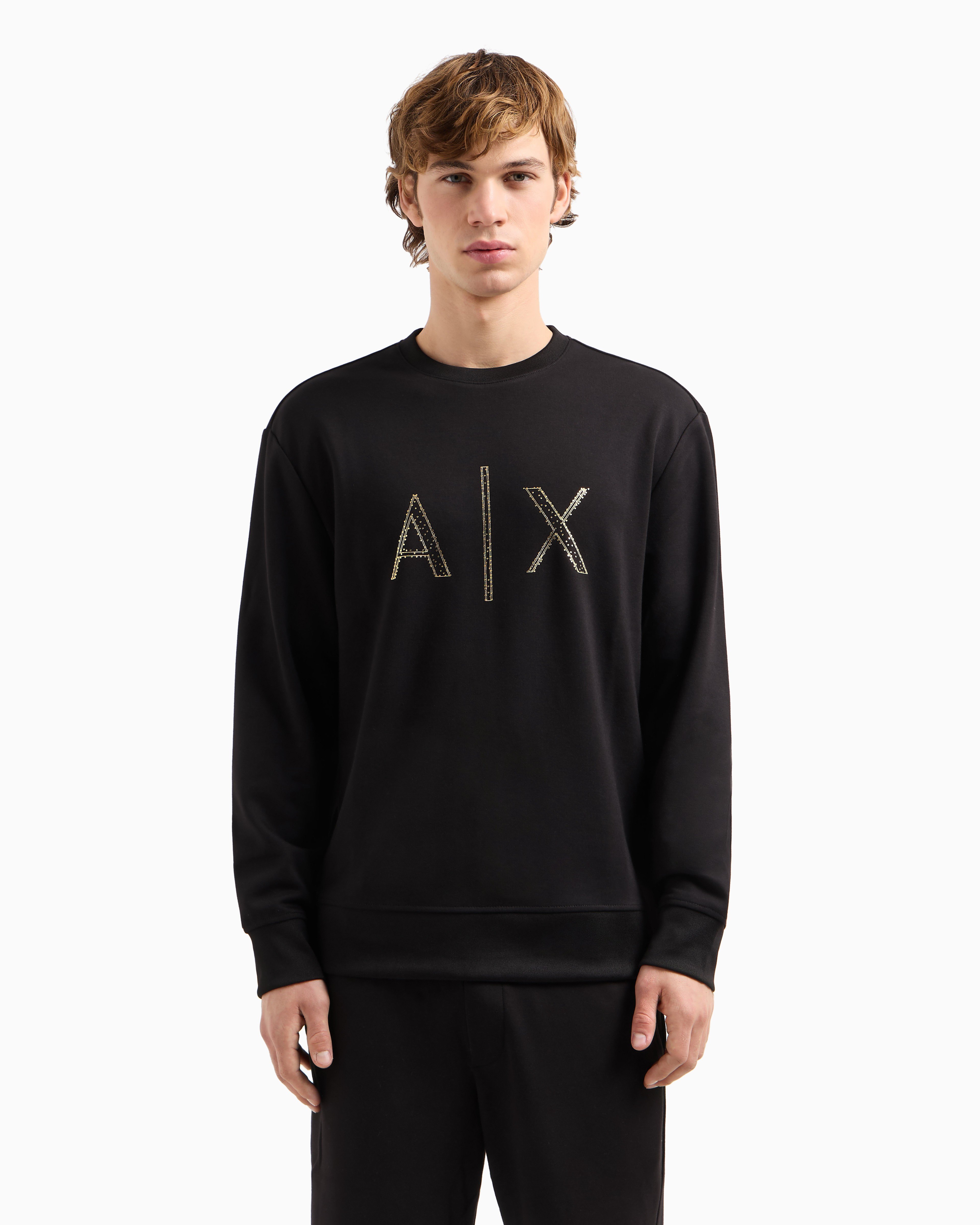 Elevate your athleisure with this men’s sweatshirt from the Black and Gold capsule collection. Crafted from stretch poly viscose interlock jersey, it combines luxurious comfort with a sleek, modern silhouette. Featuring a bold maxi logo in signature black and gold, this piece embodies statement style with a refined edge.