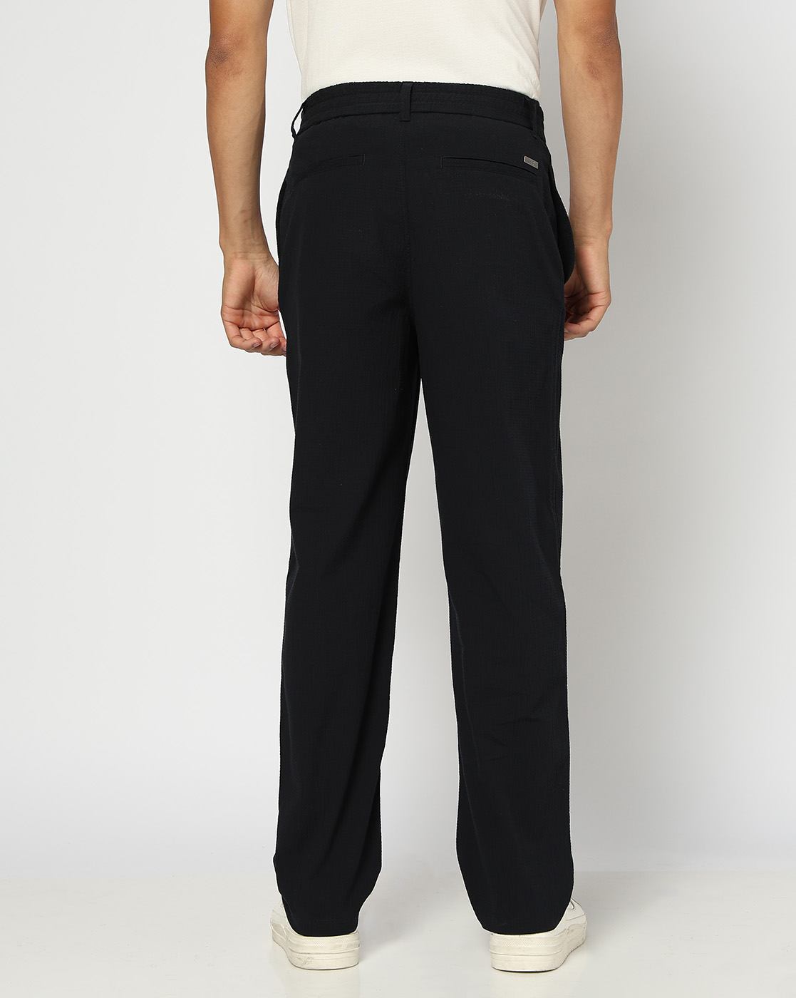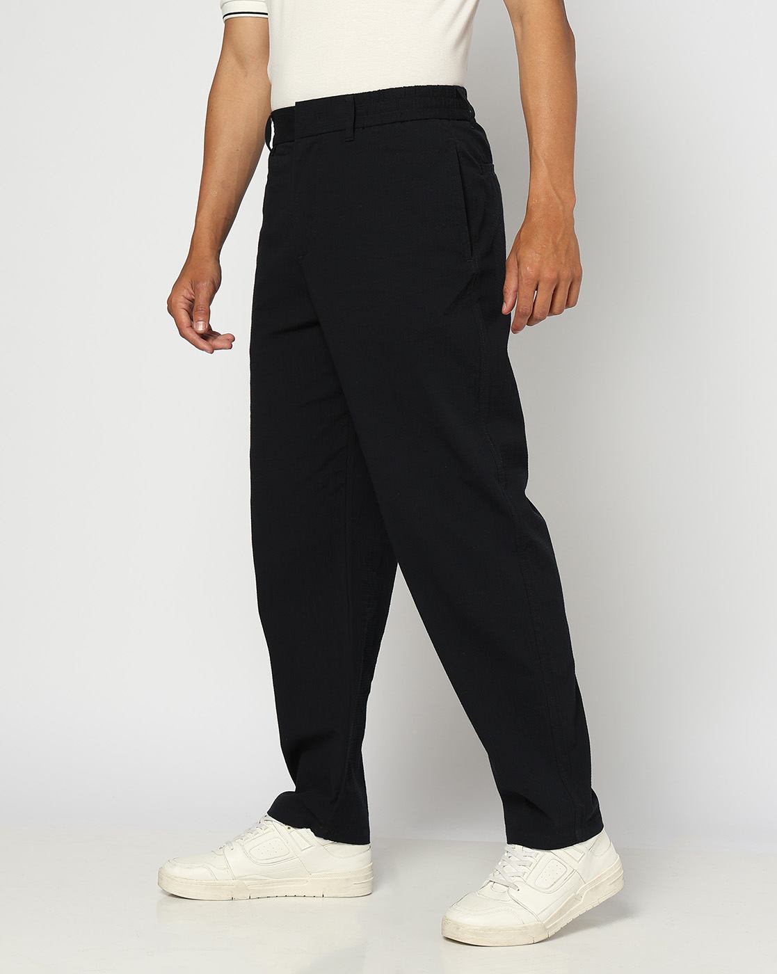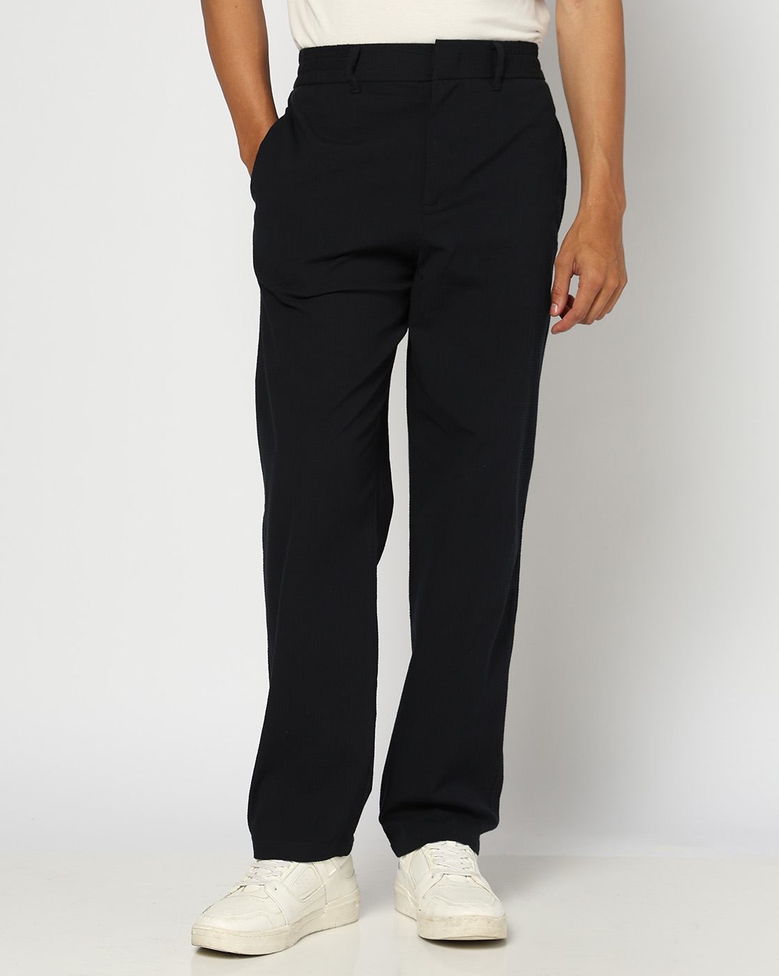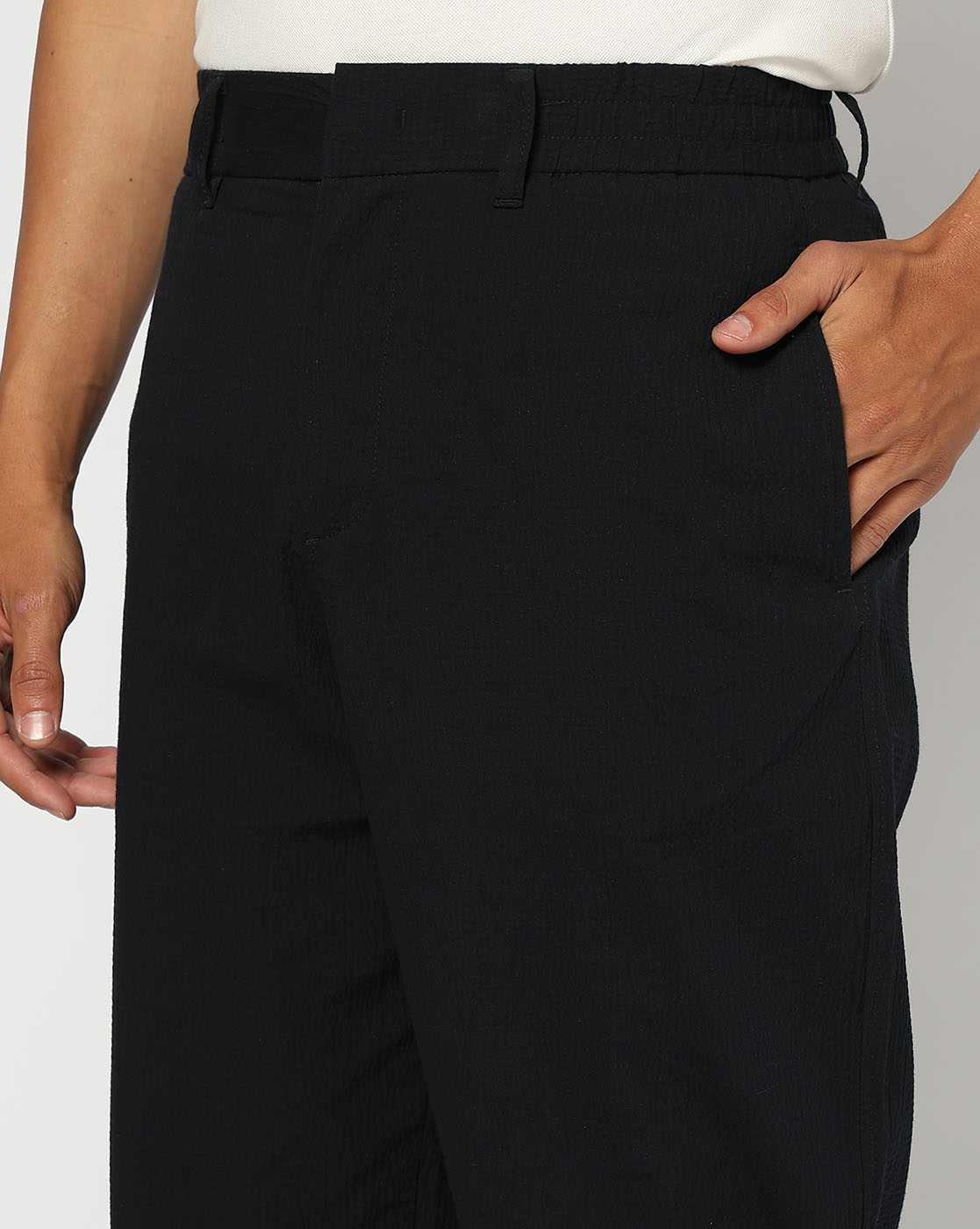 - chino pants in stretch cotton seersucker, elastic waistband, central ribs, metal logo plate