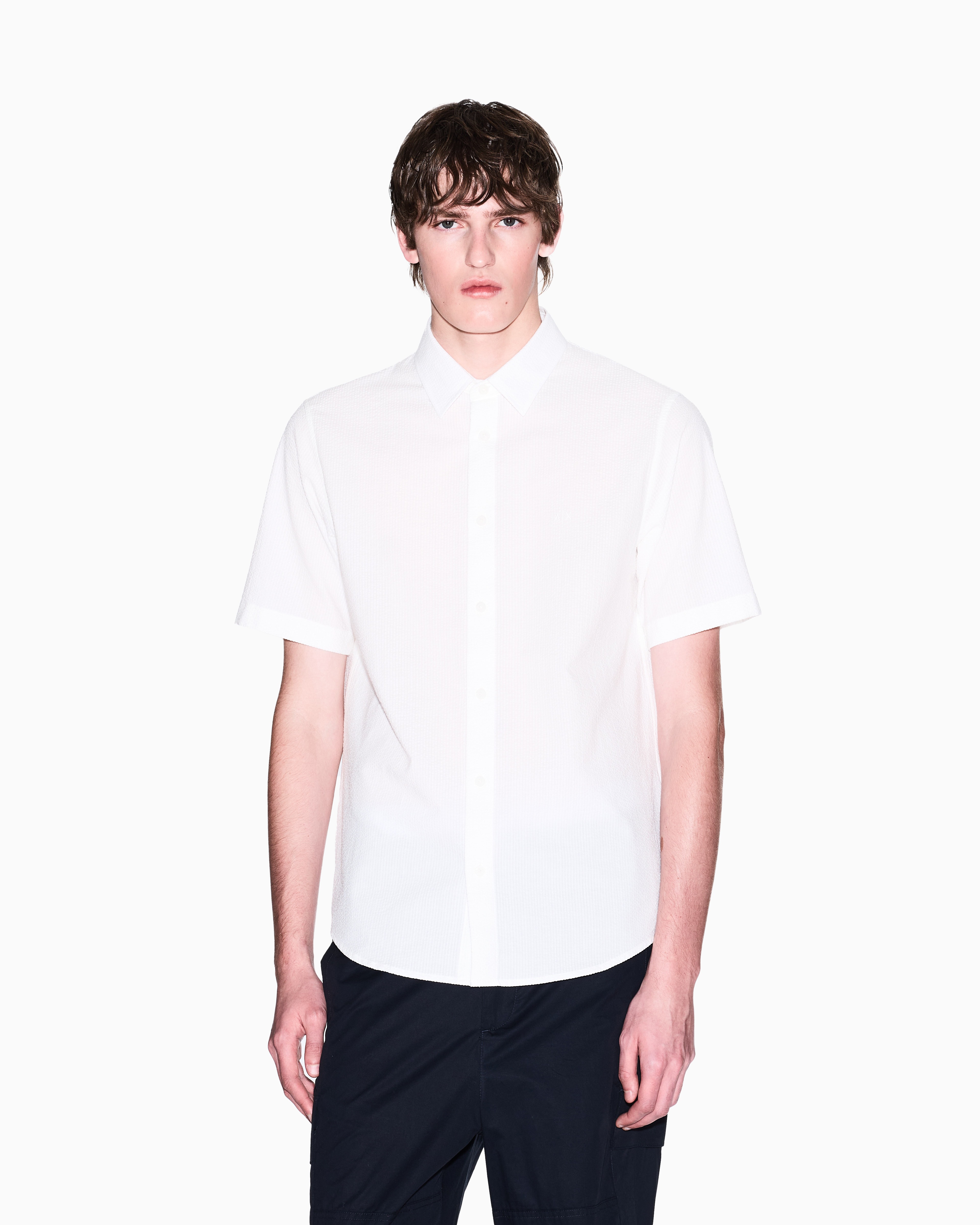 - Yarn dyed cotton seersucker, embroidered logo on chest