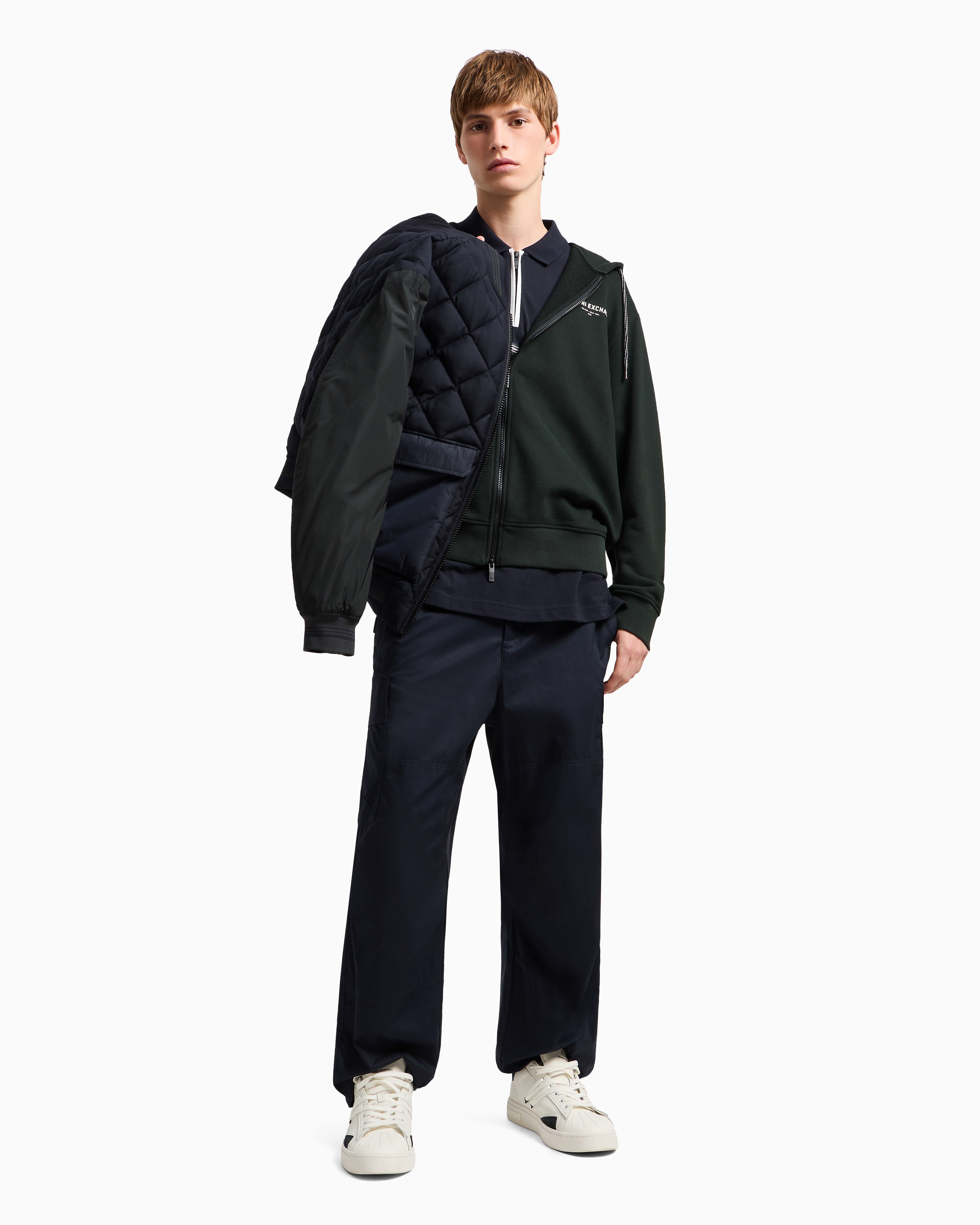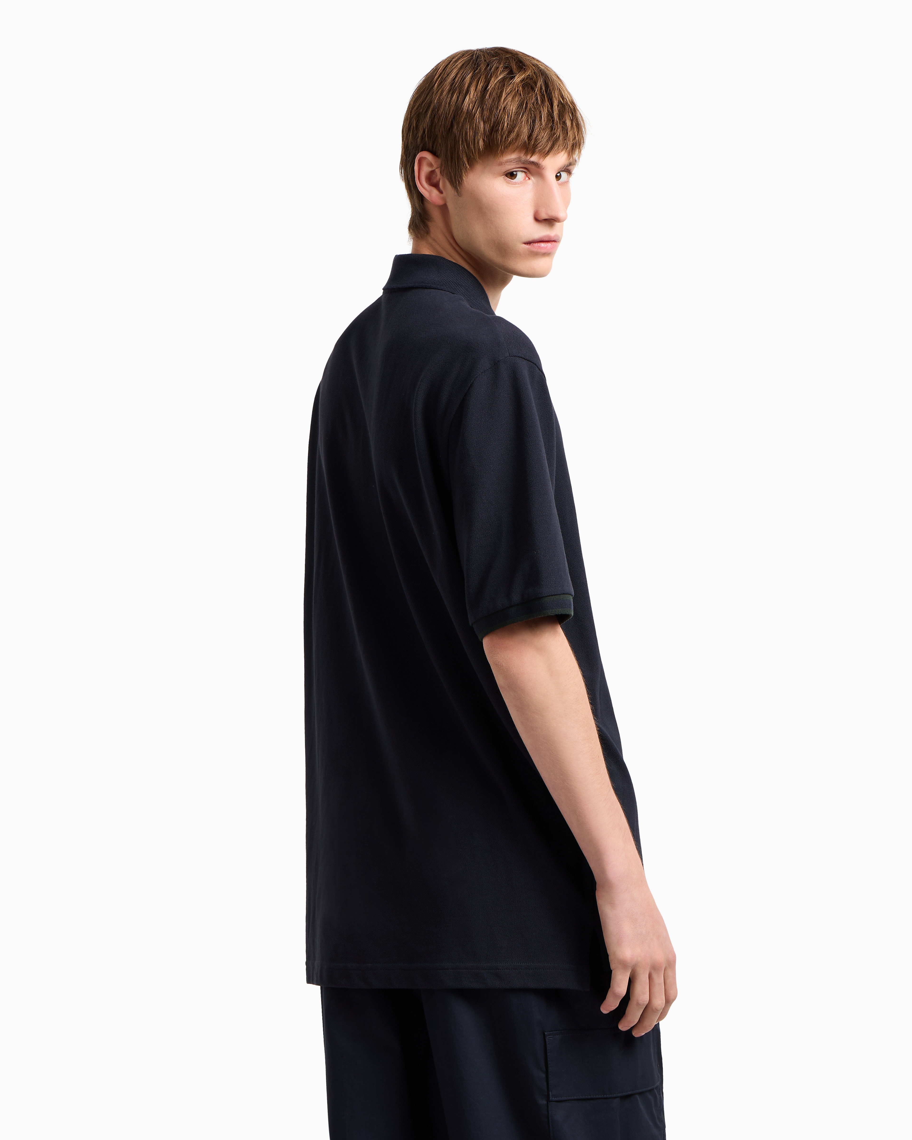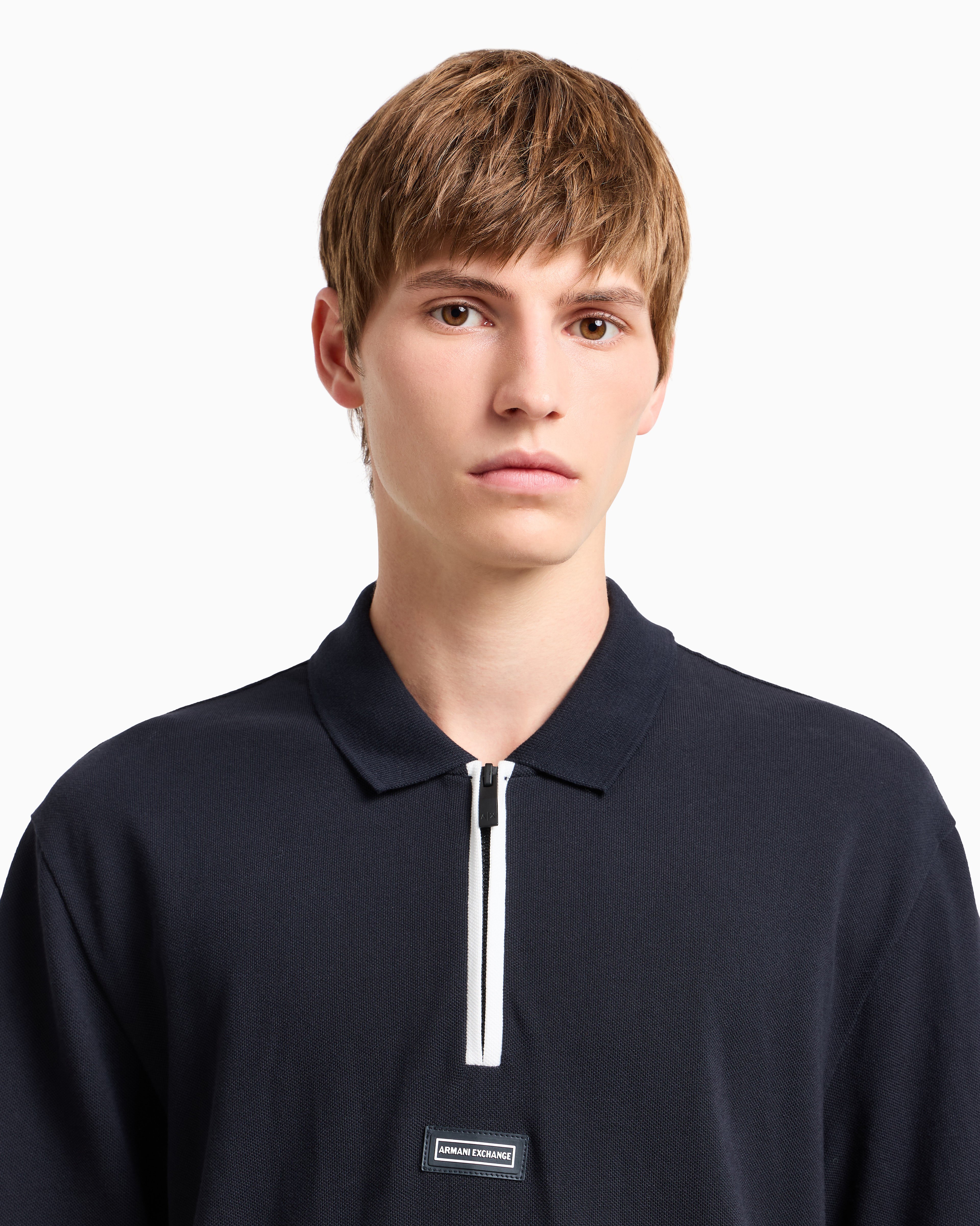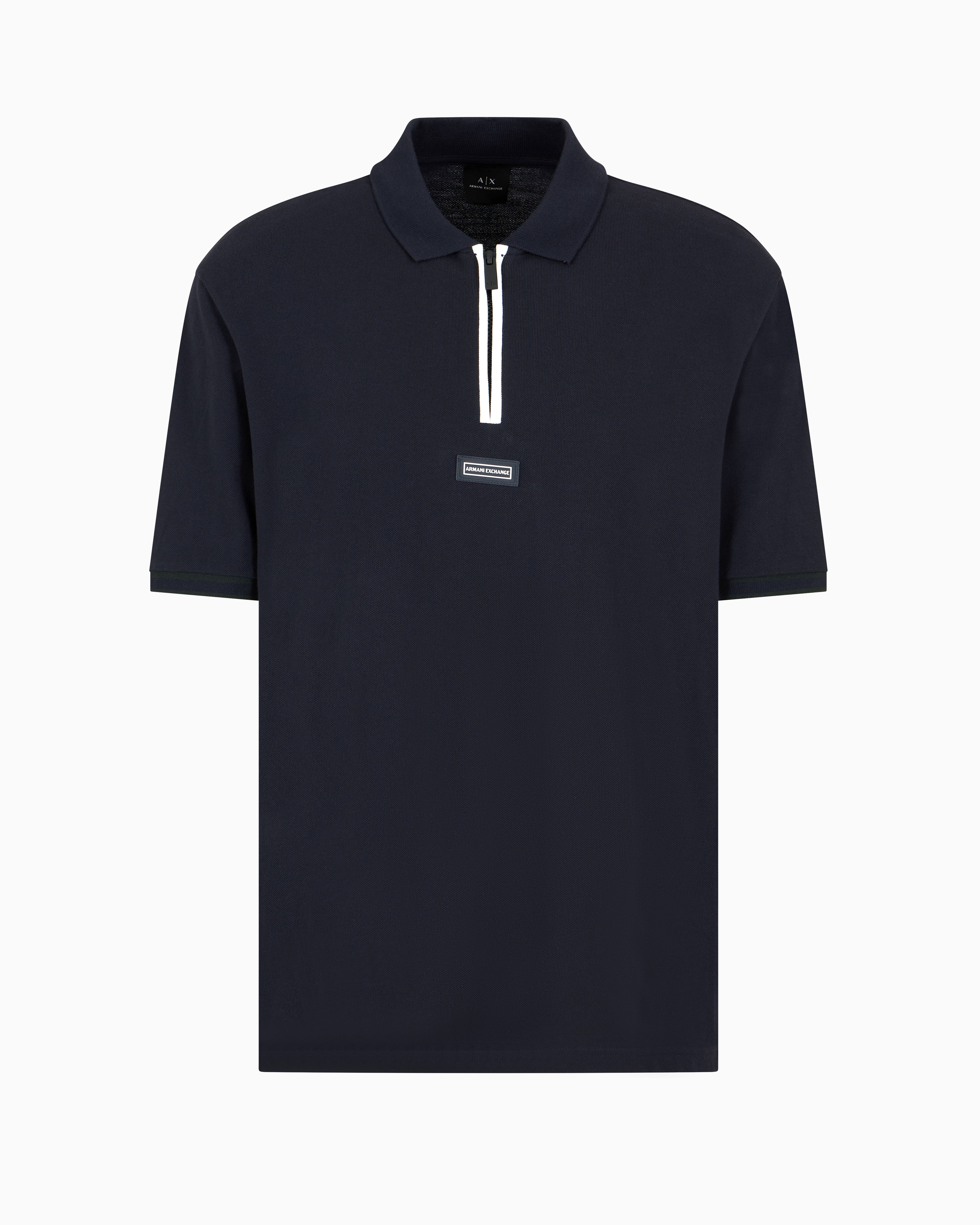 Step into modern style with the A|X Urban Explorer Polo. Crafted from cotton piqué, it features a zipped placket, contrast tipping, and a silicon AX logo patch on the front, combining functionality with contemporary flair.