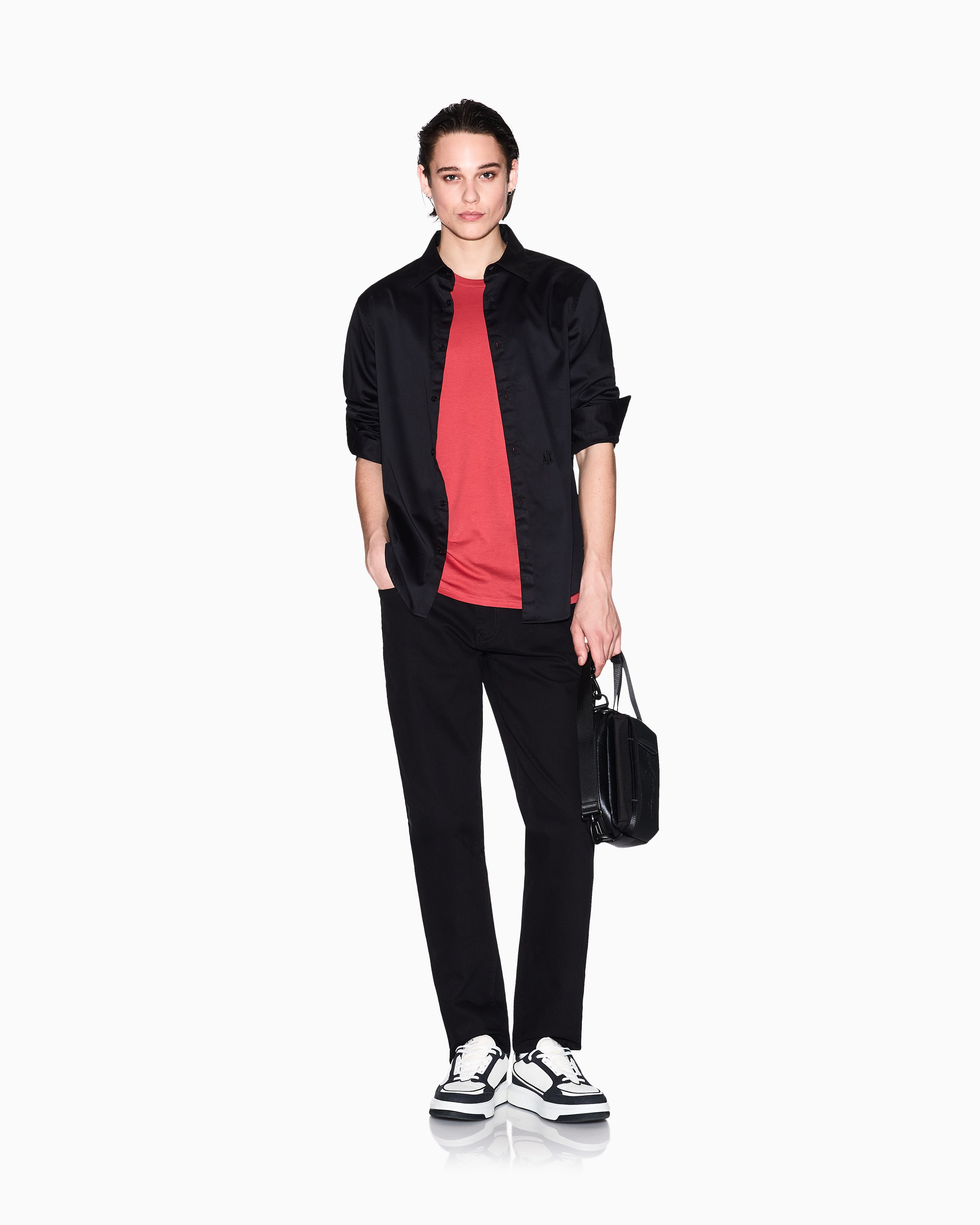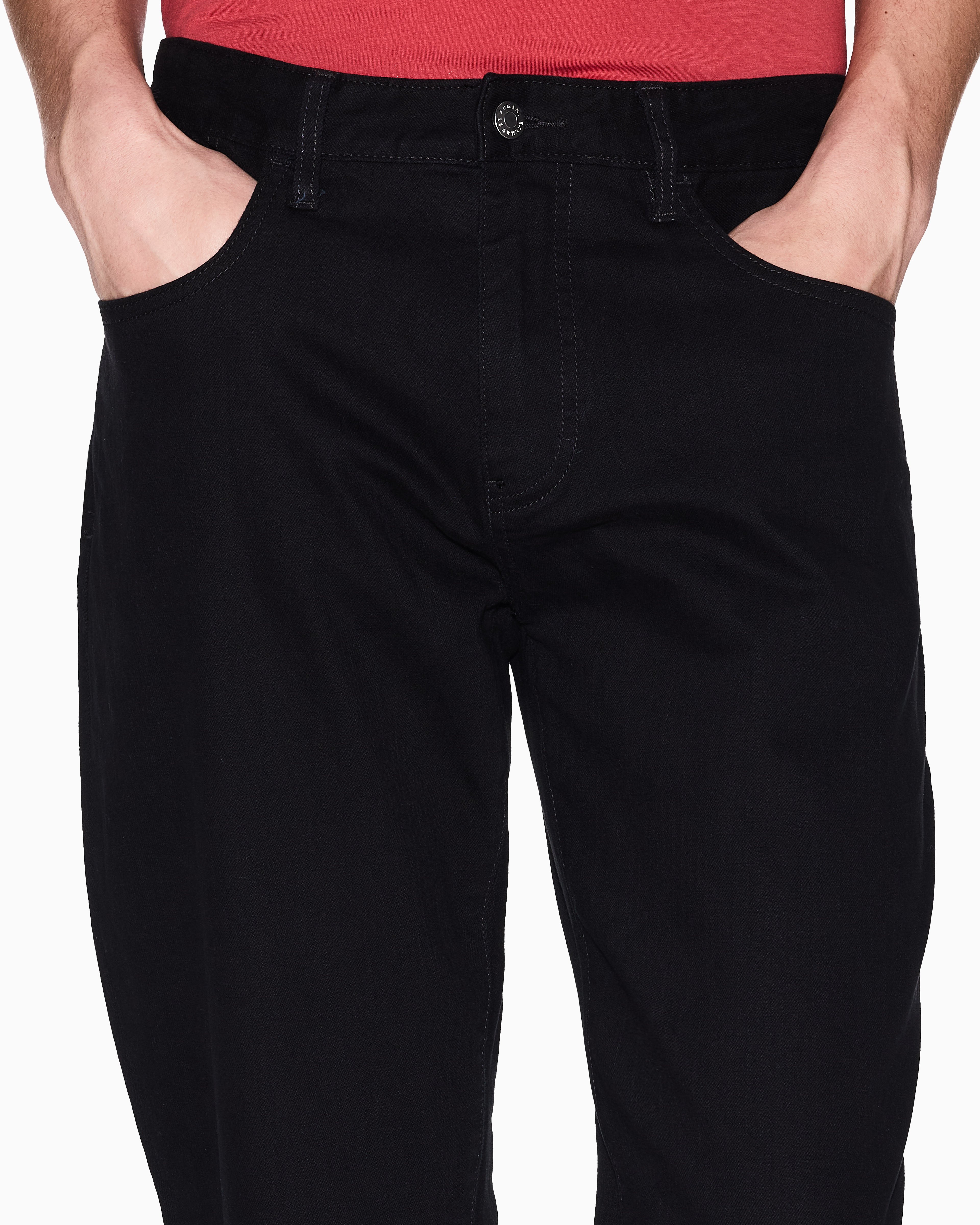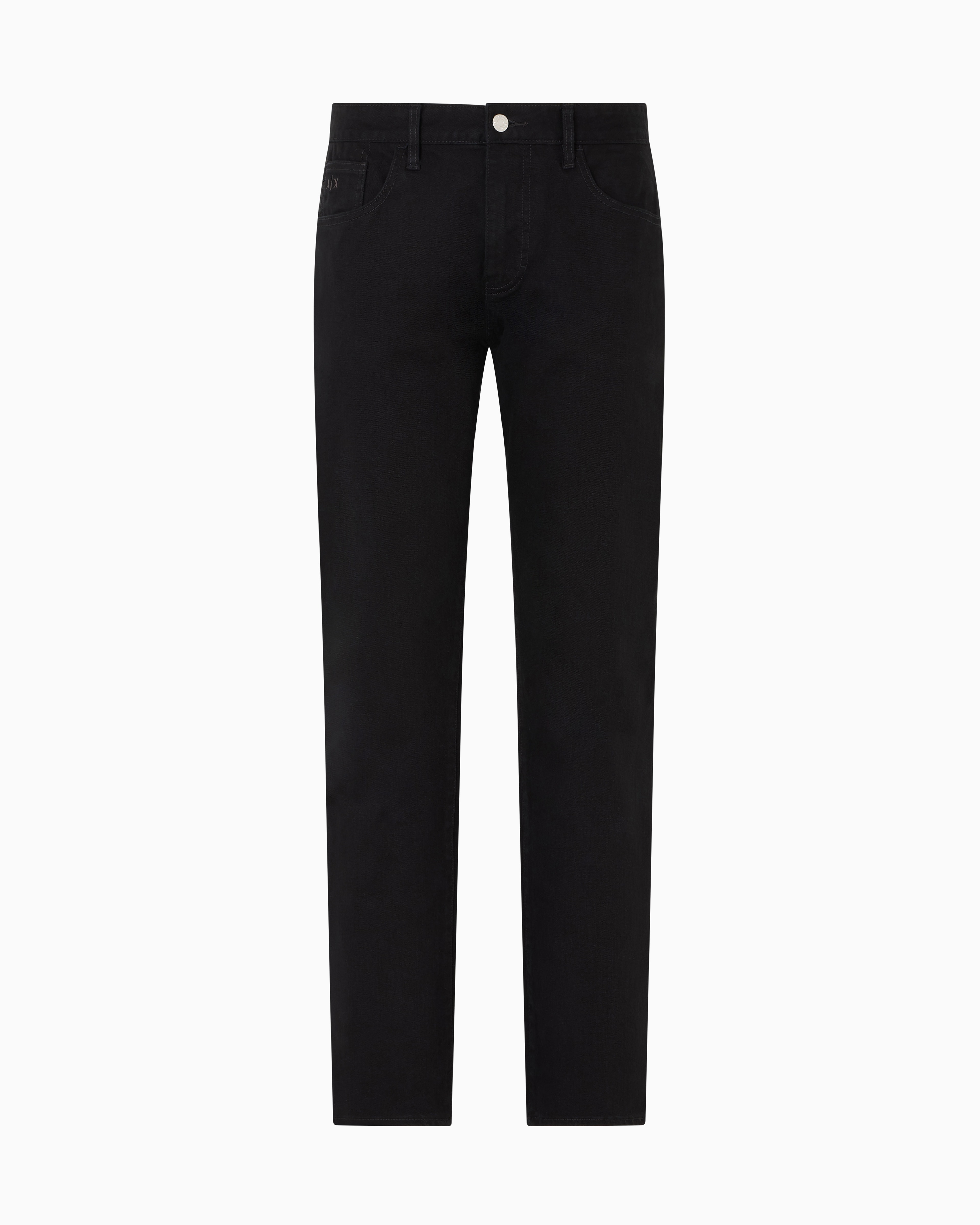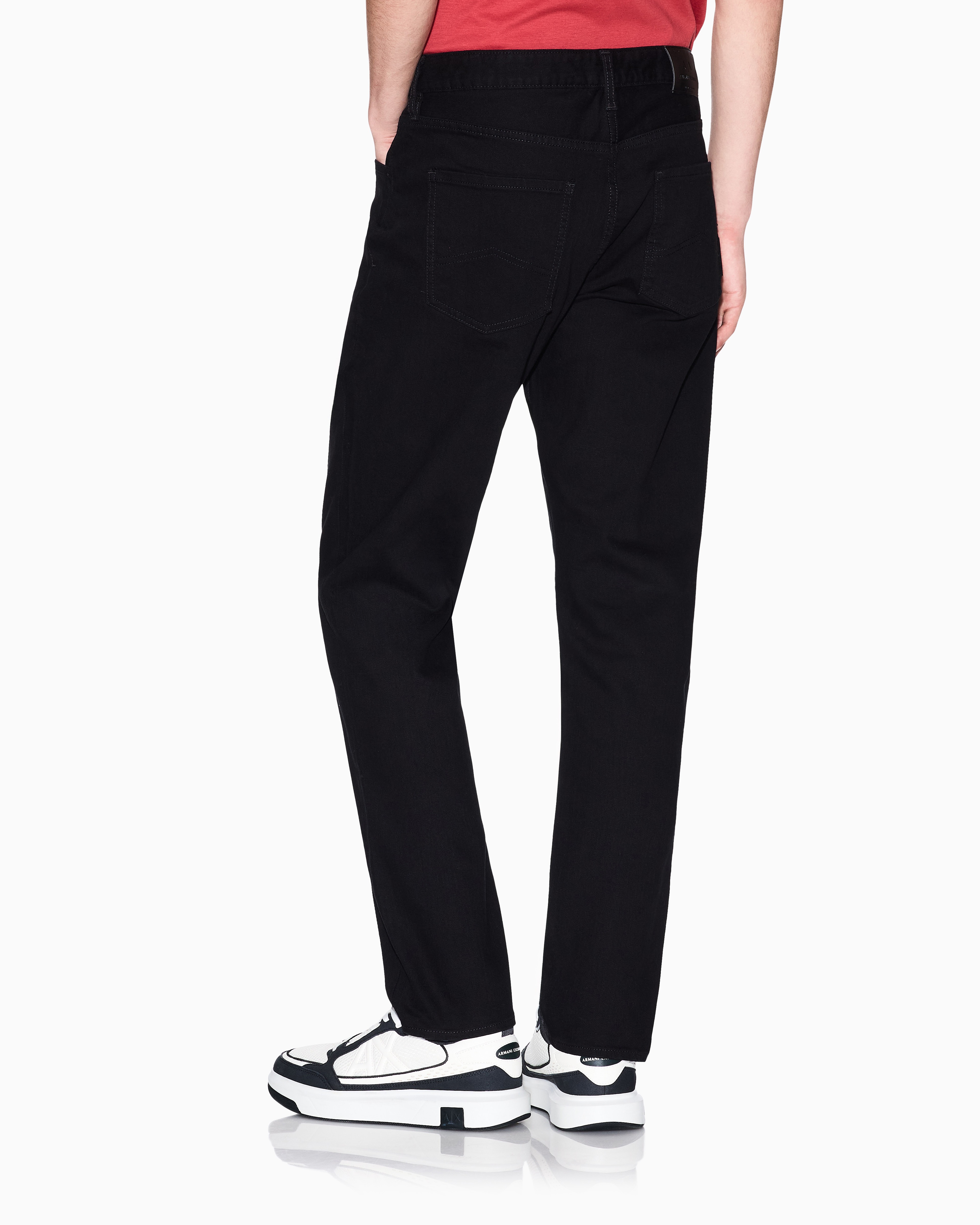 Experience durability with style in A|X Stretch Cotton Bull Denim. Crafted for comfort and resilience, these jeans feature a sleek leather patch on the back, adding a refined touch to their versatile design.