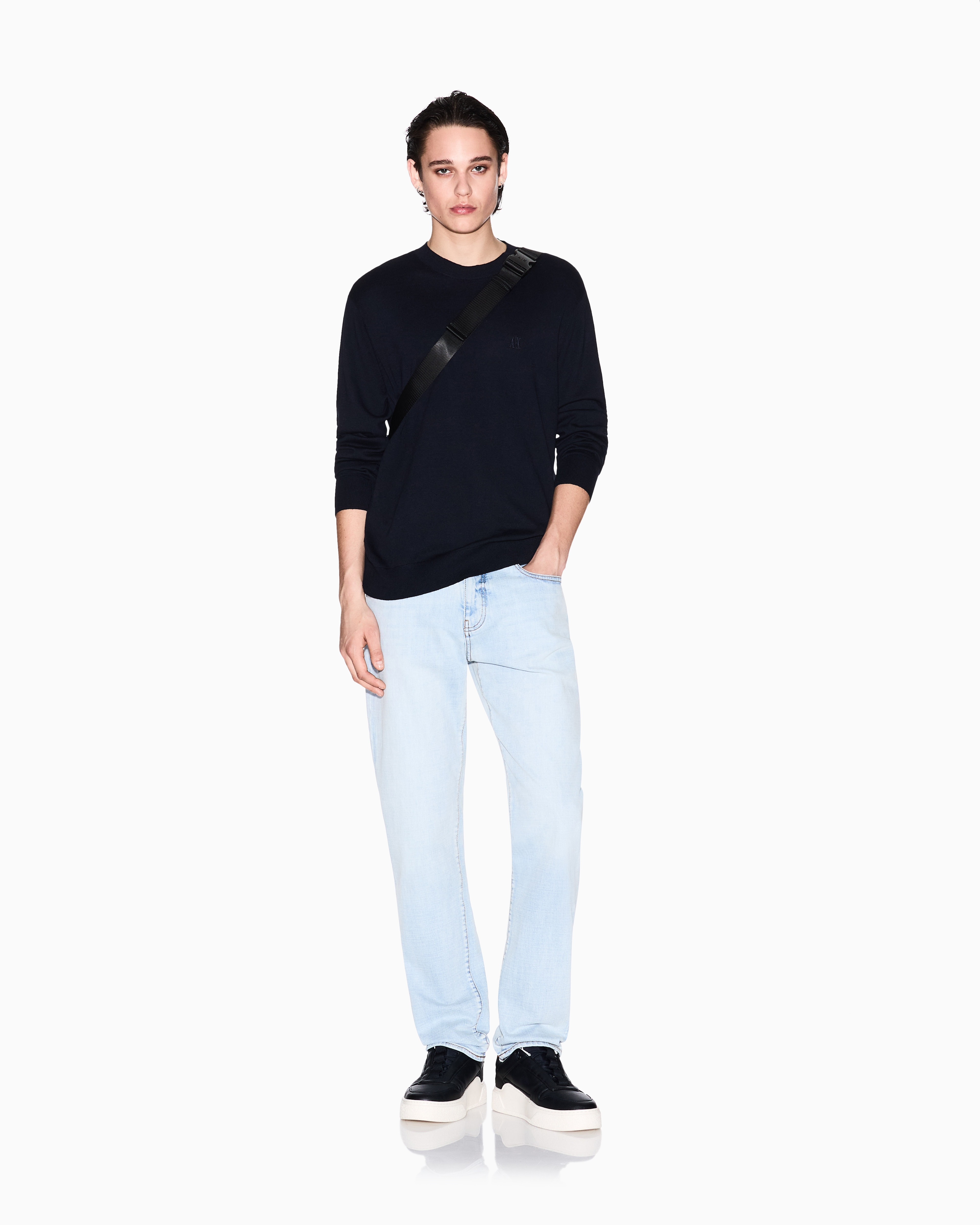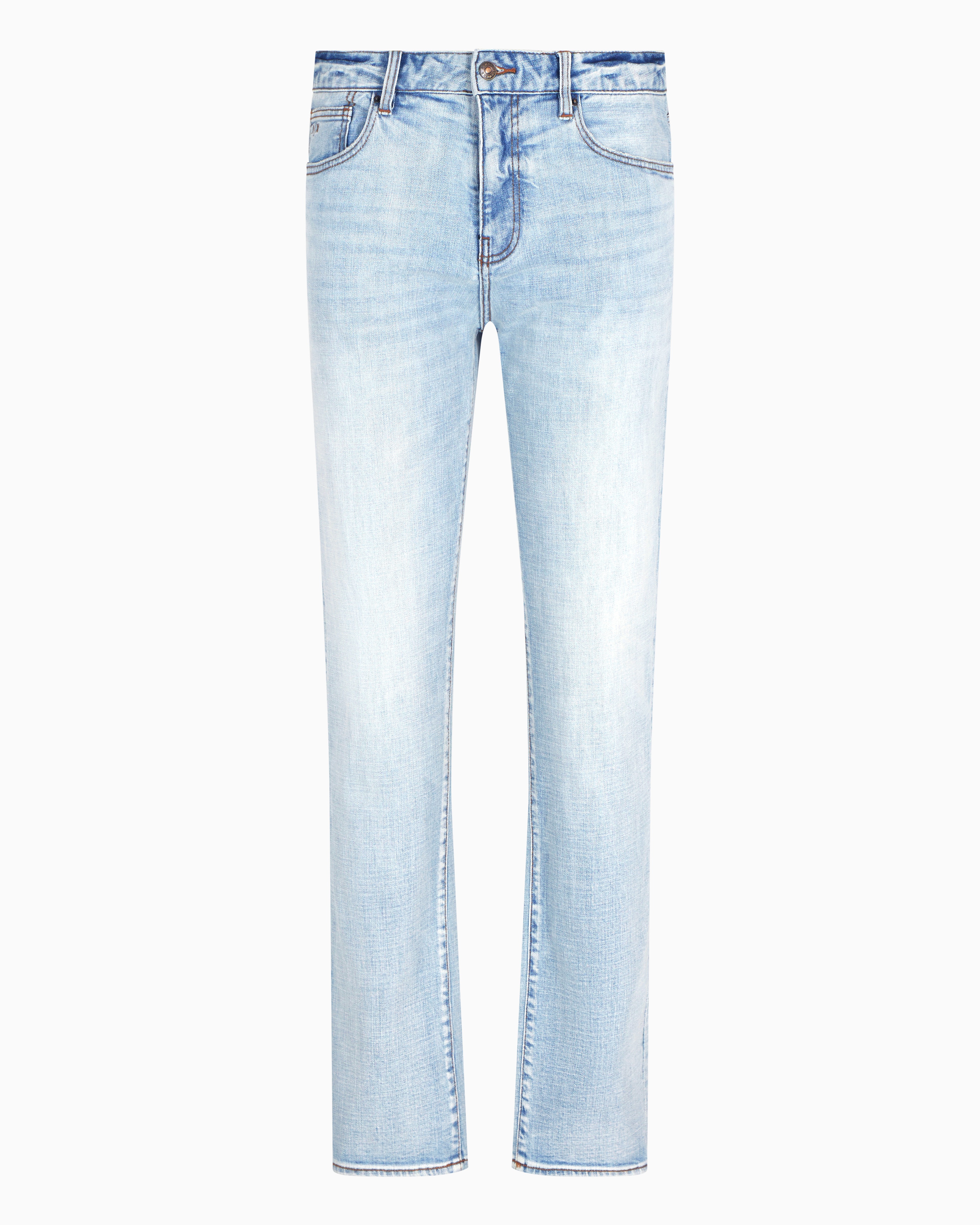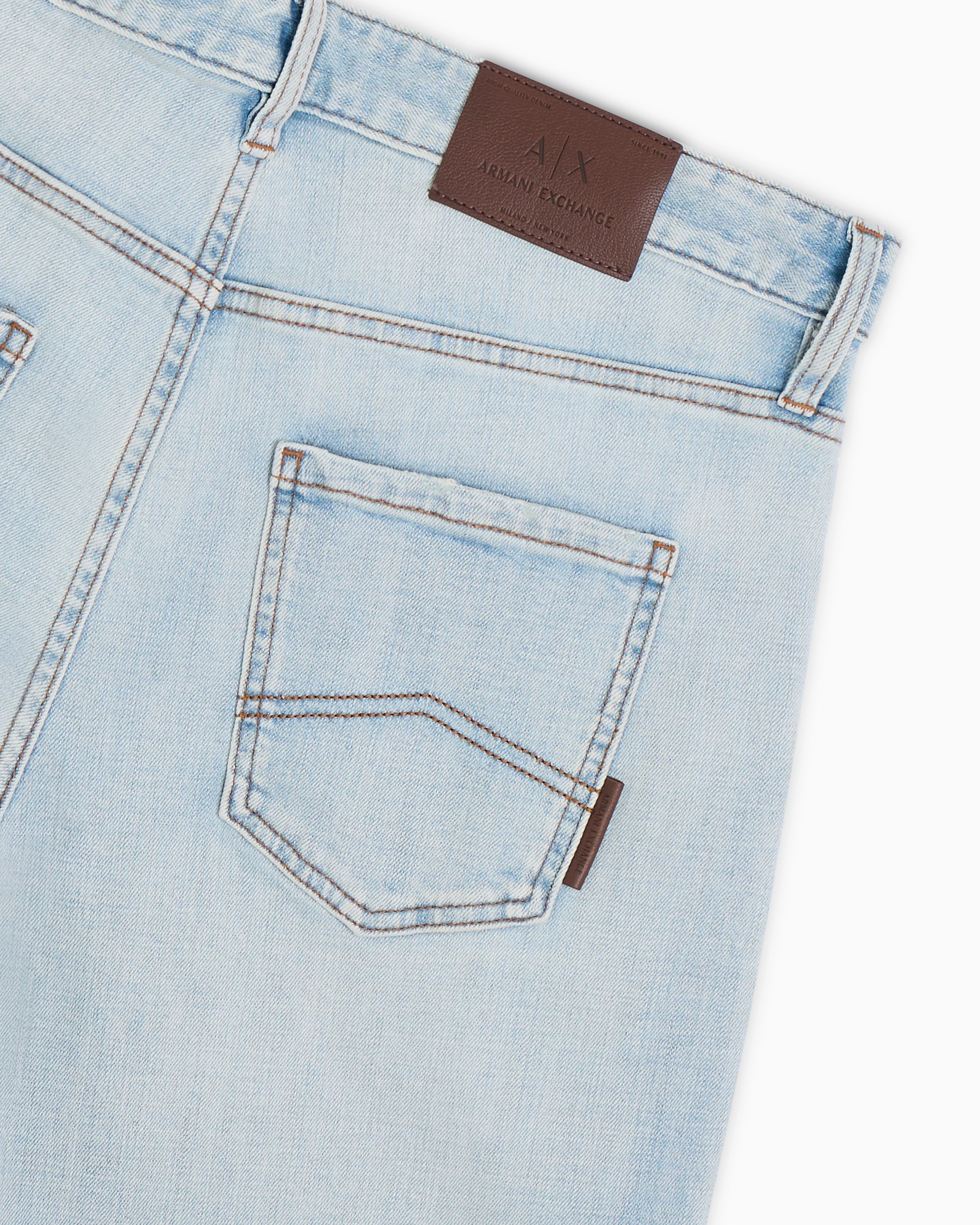 Stand out with A|X Stretch Cotton Denim, featuring a scraped and bleached finish with silicon stones for a unique look. Heavy whiskers on the top block add a rugged touch, while the brown leather patch on the back provides a signature finish to these stylish jeans.