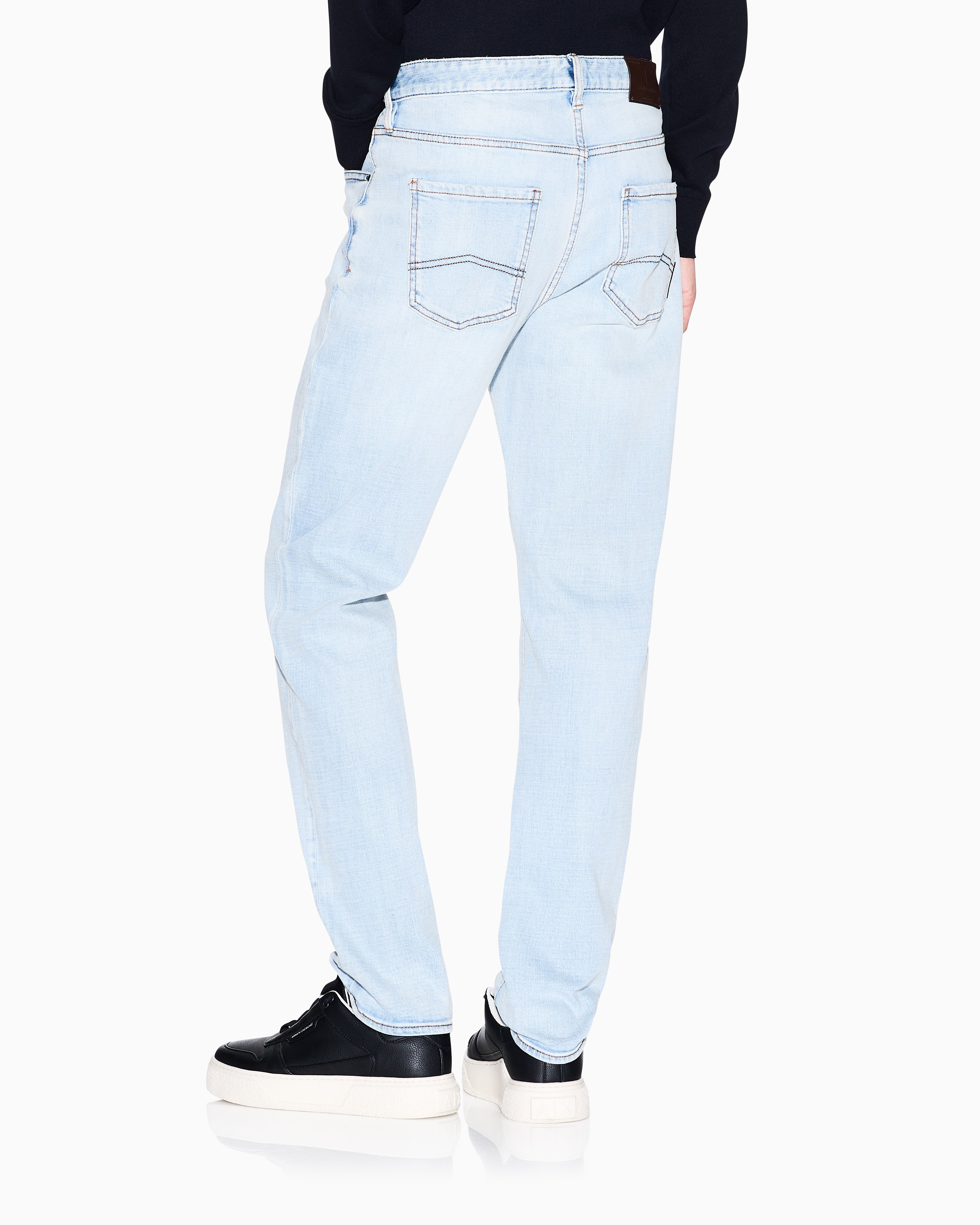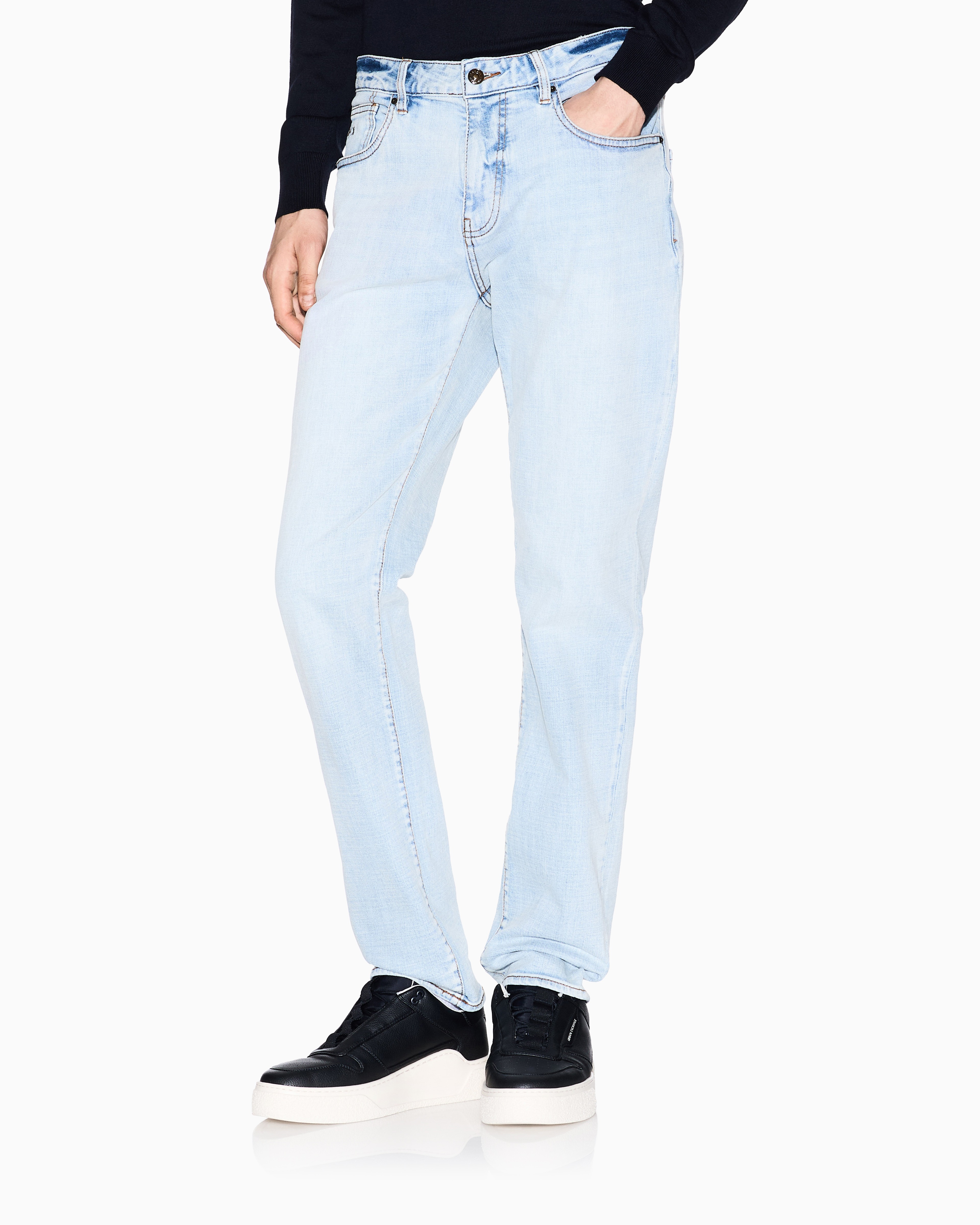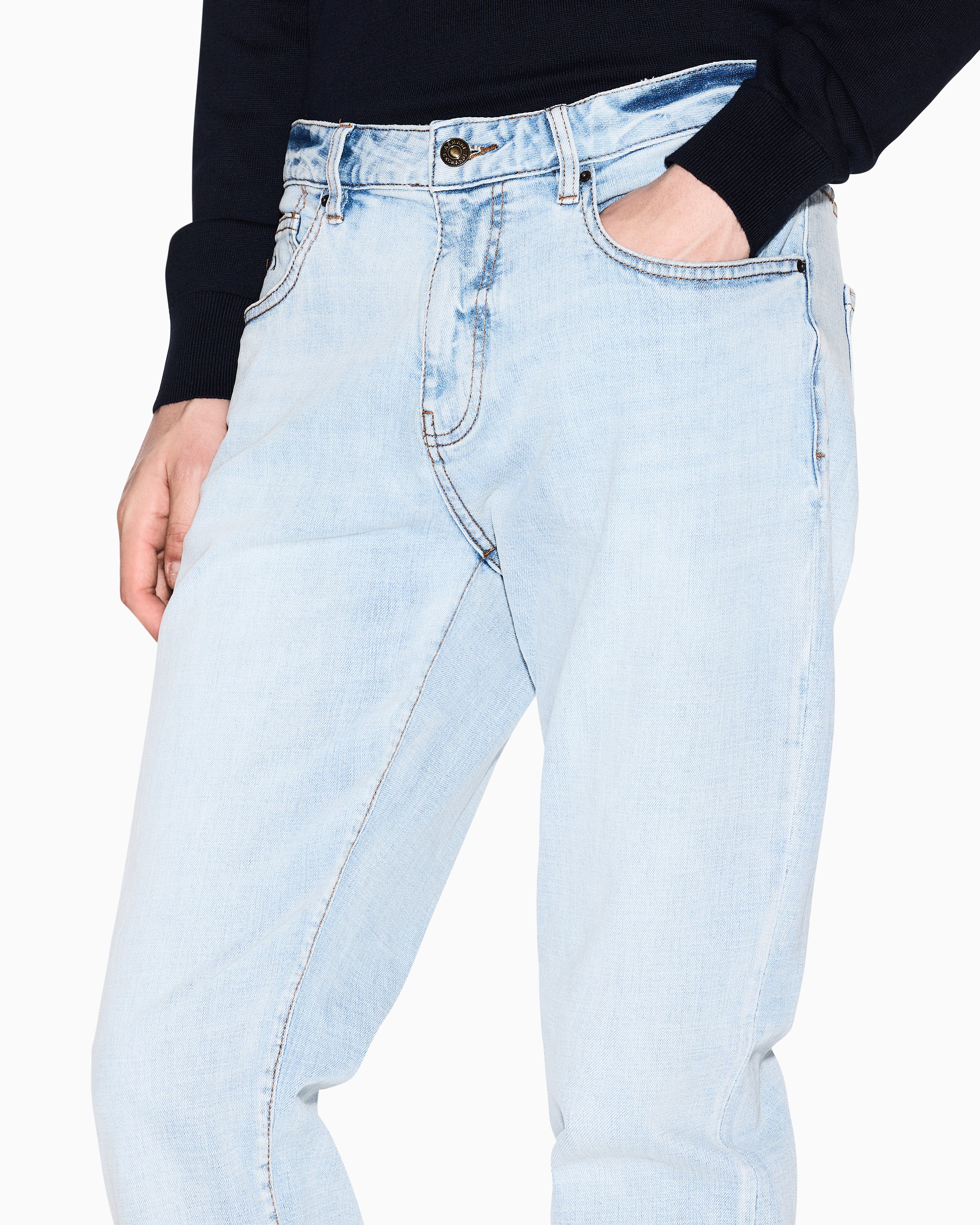 - Stretch cotton denim, sraped and bleached with silicon stones, heavy whiskers on top block, brown leather patch on back