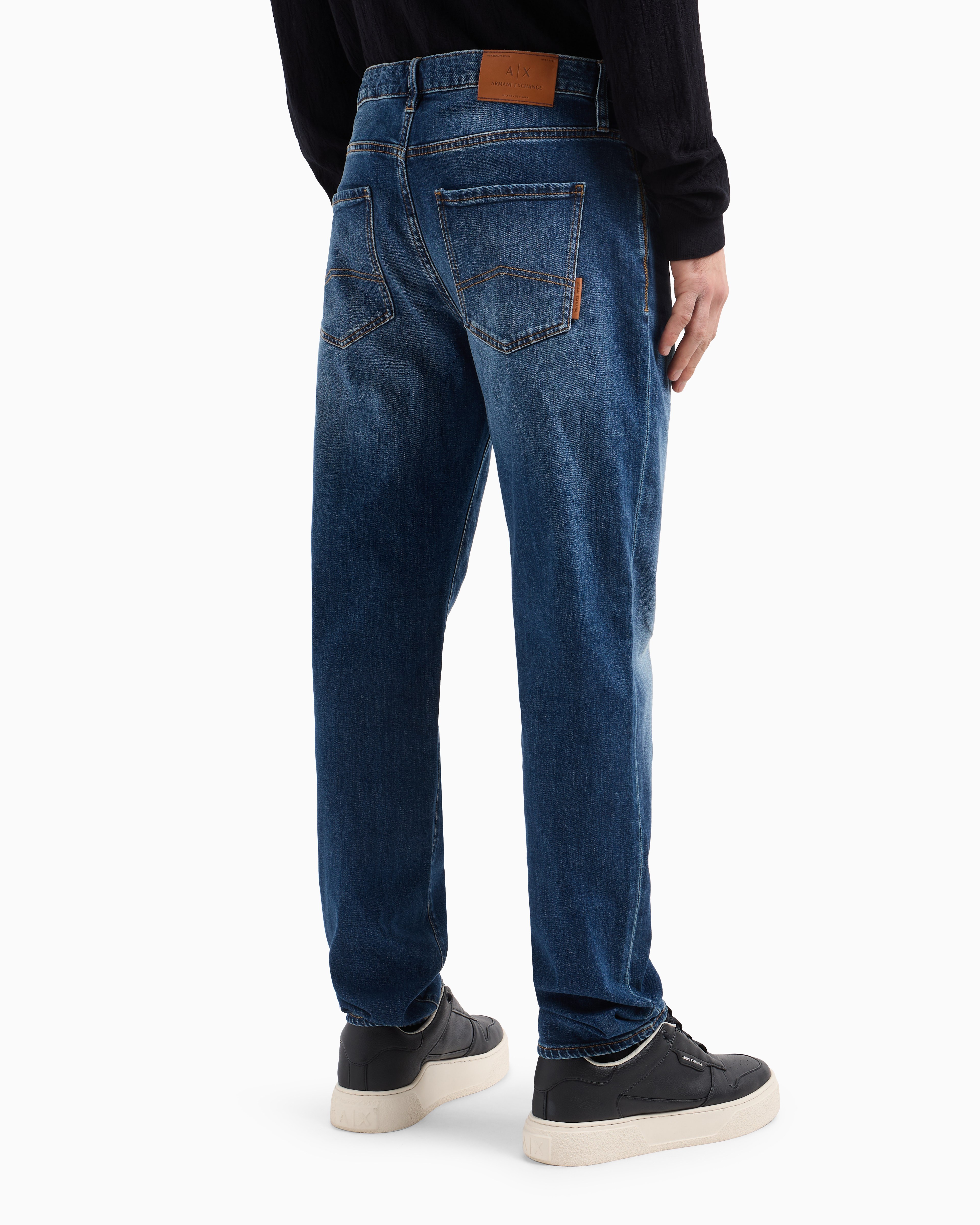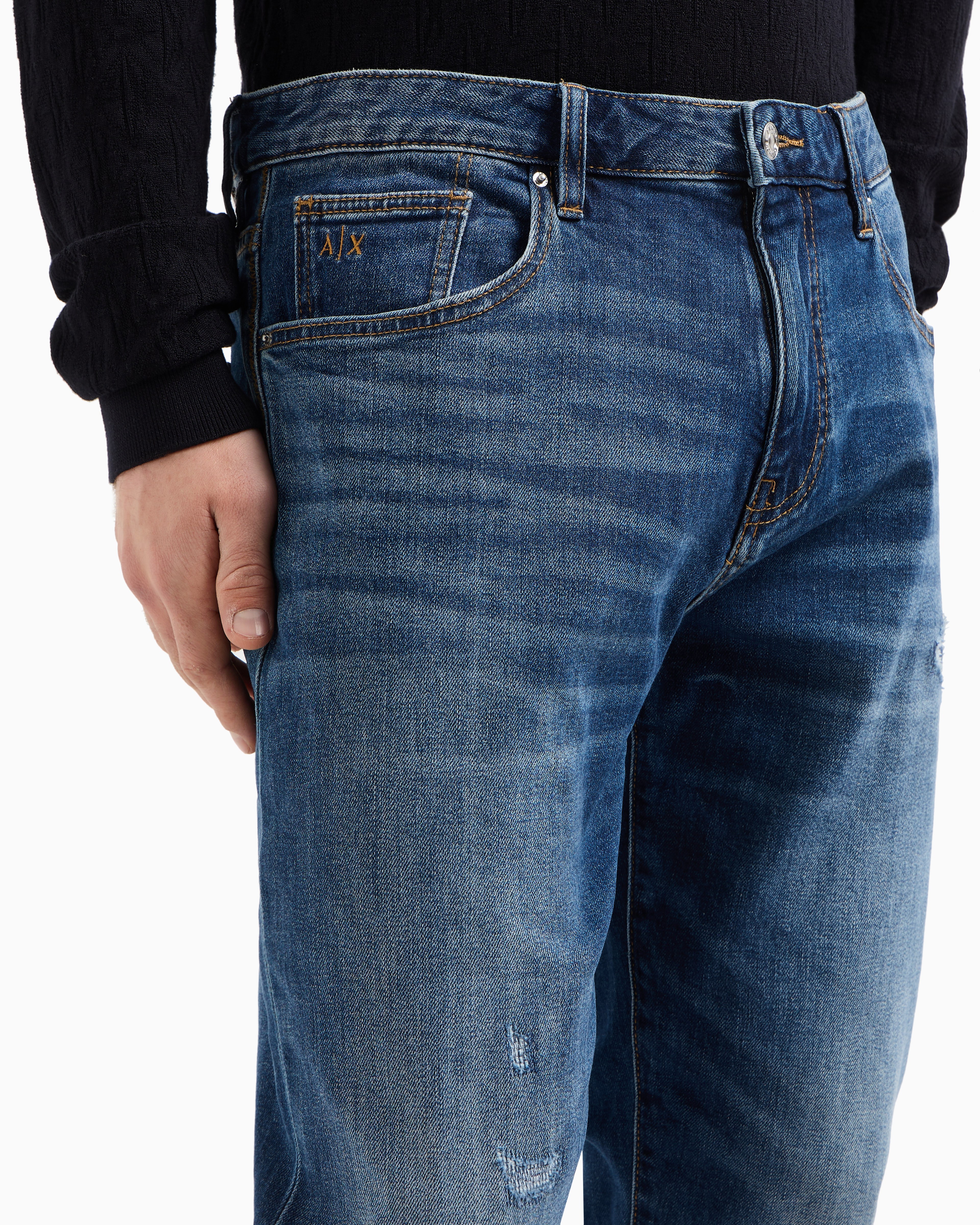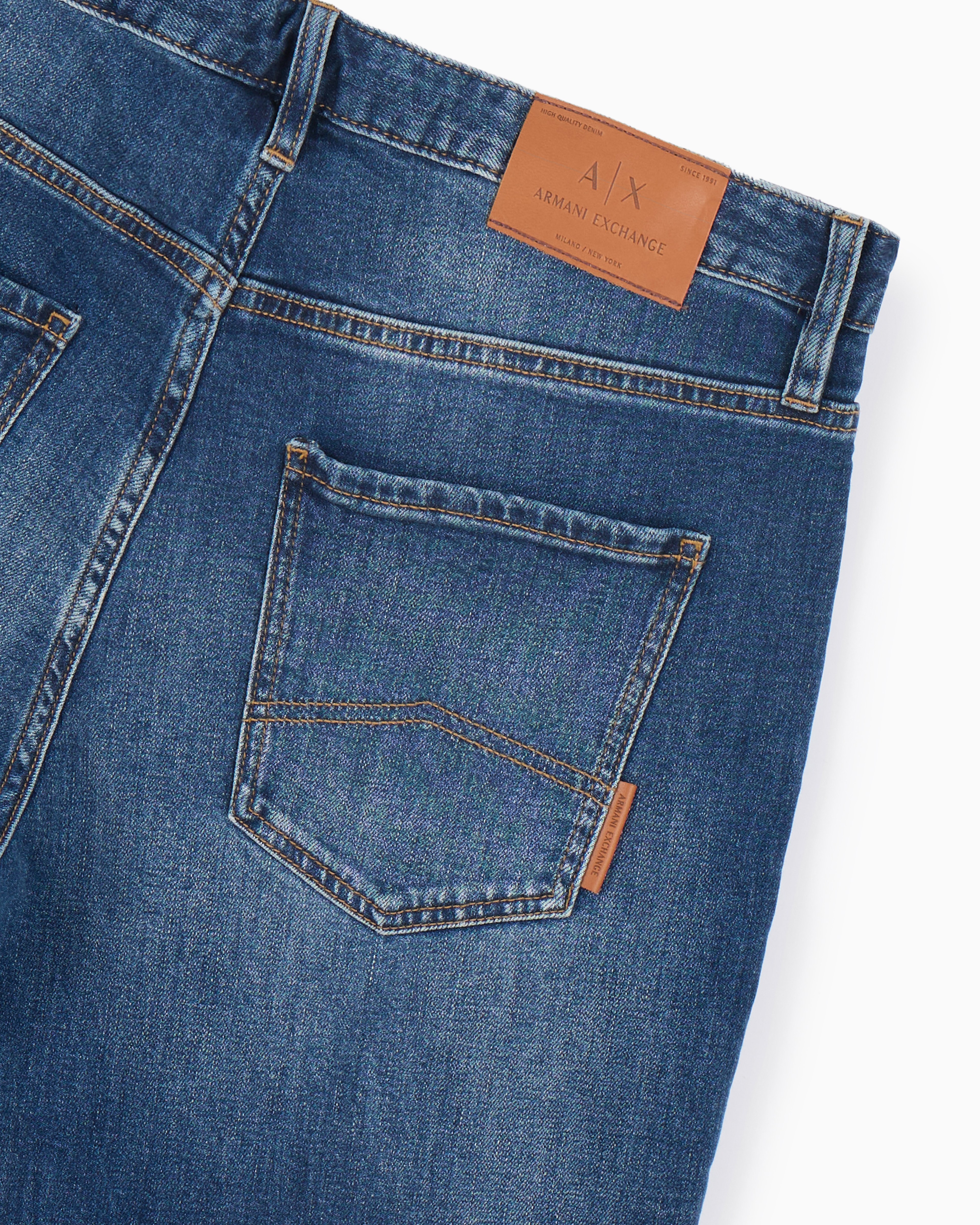 Step up your denim game with A|X Comfort Cotton Denim. Designed with a scraped effect, micro abrasions, and a laser template, these jeans showcase heavy whiskers on the top block and knees for a rugged, lived-in look. Shiny nickel trims, tobacco stitching, and a navy blue leather patch on the back complete the modern, stylish design.