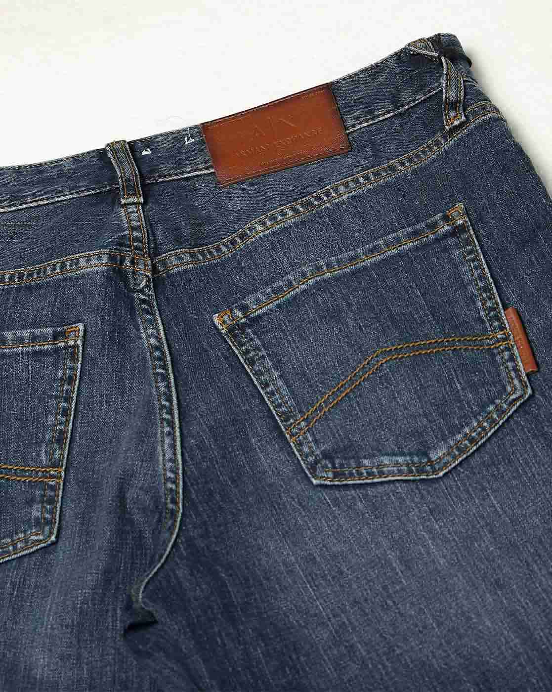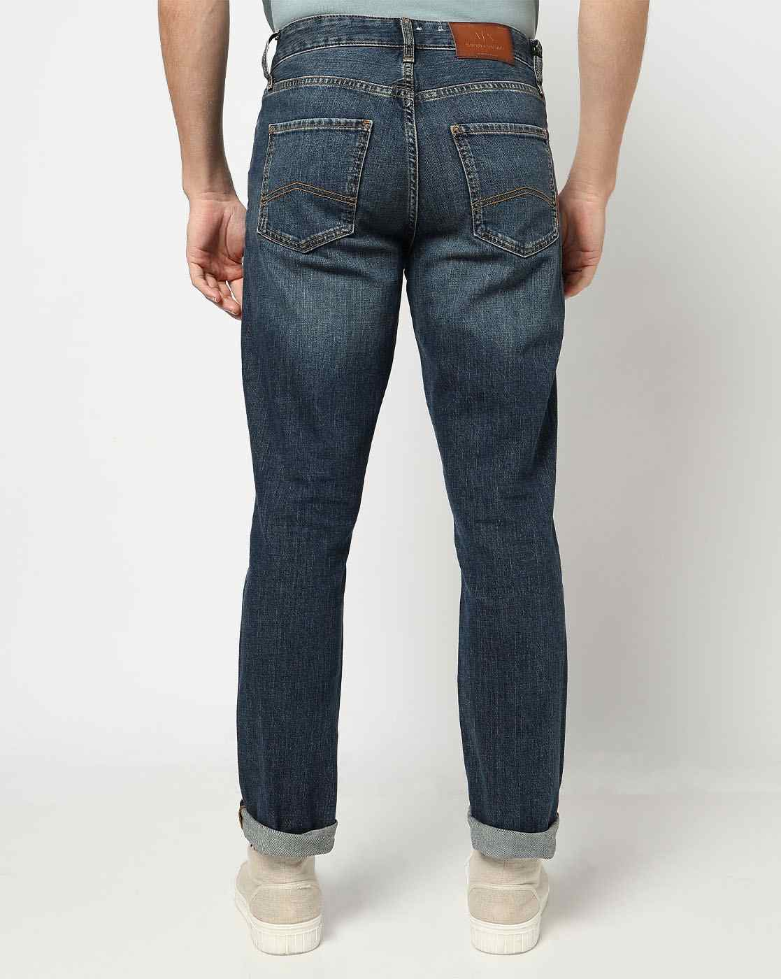 Upgrade your denim collection with A|X Stretch Cotton Denim. Featuring a scraped effect and heavy whiskers on the top block, these jeans are detailed with shiny copper trims, tobacco stitching, and a navy leather patch on the back, blending rugged style with refined accents.