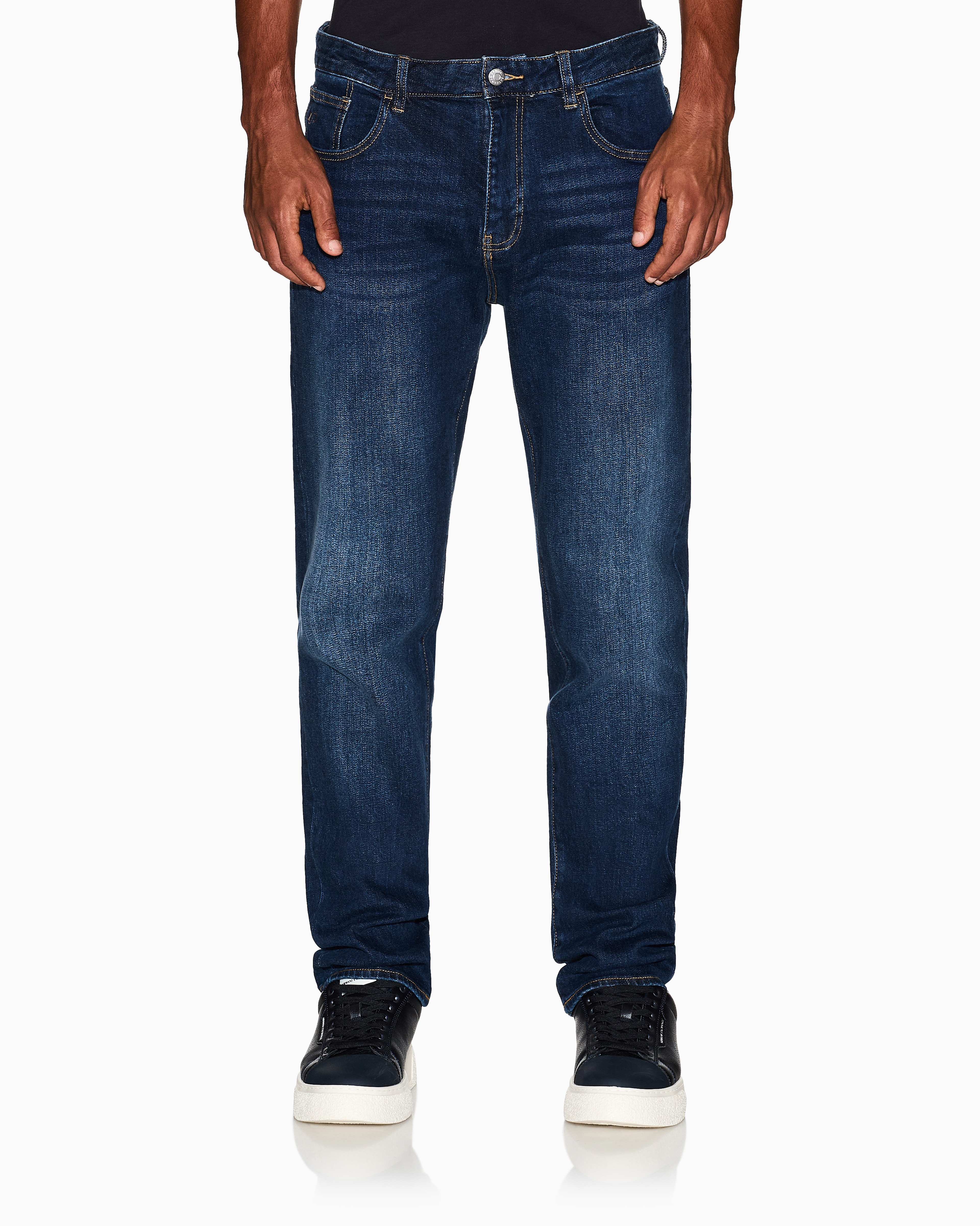 Experience timeless style with A|X Comfort Cotton Denim Jeans. Designed for everyday ease, they feature a sleek leather patch on the back for a signature touch. A perfect blend of comfort and sophistication for the modern wardrobe.