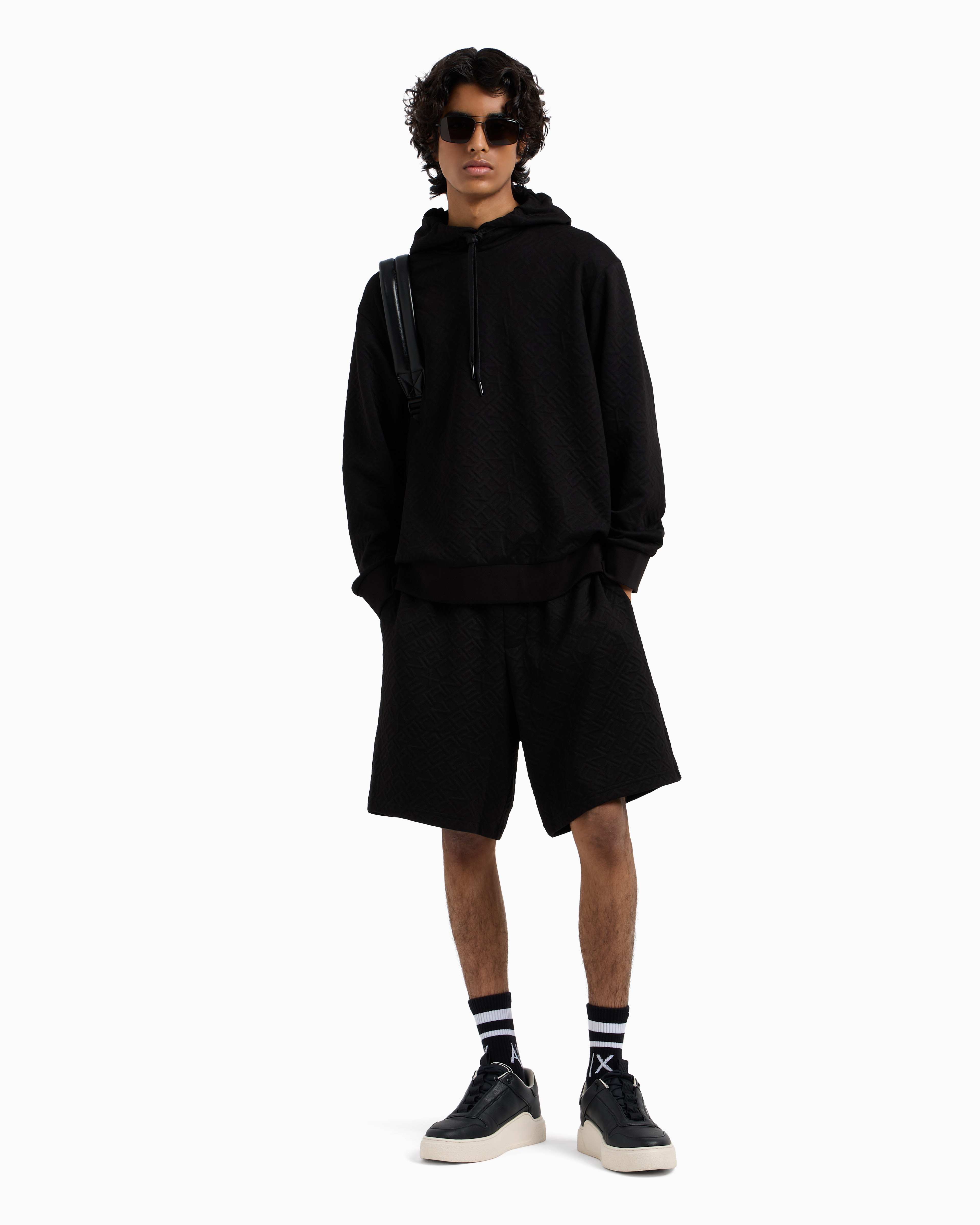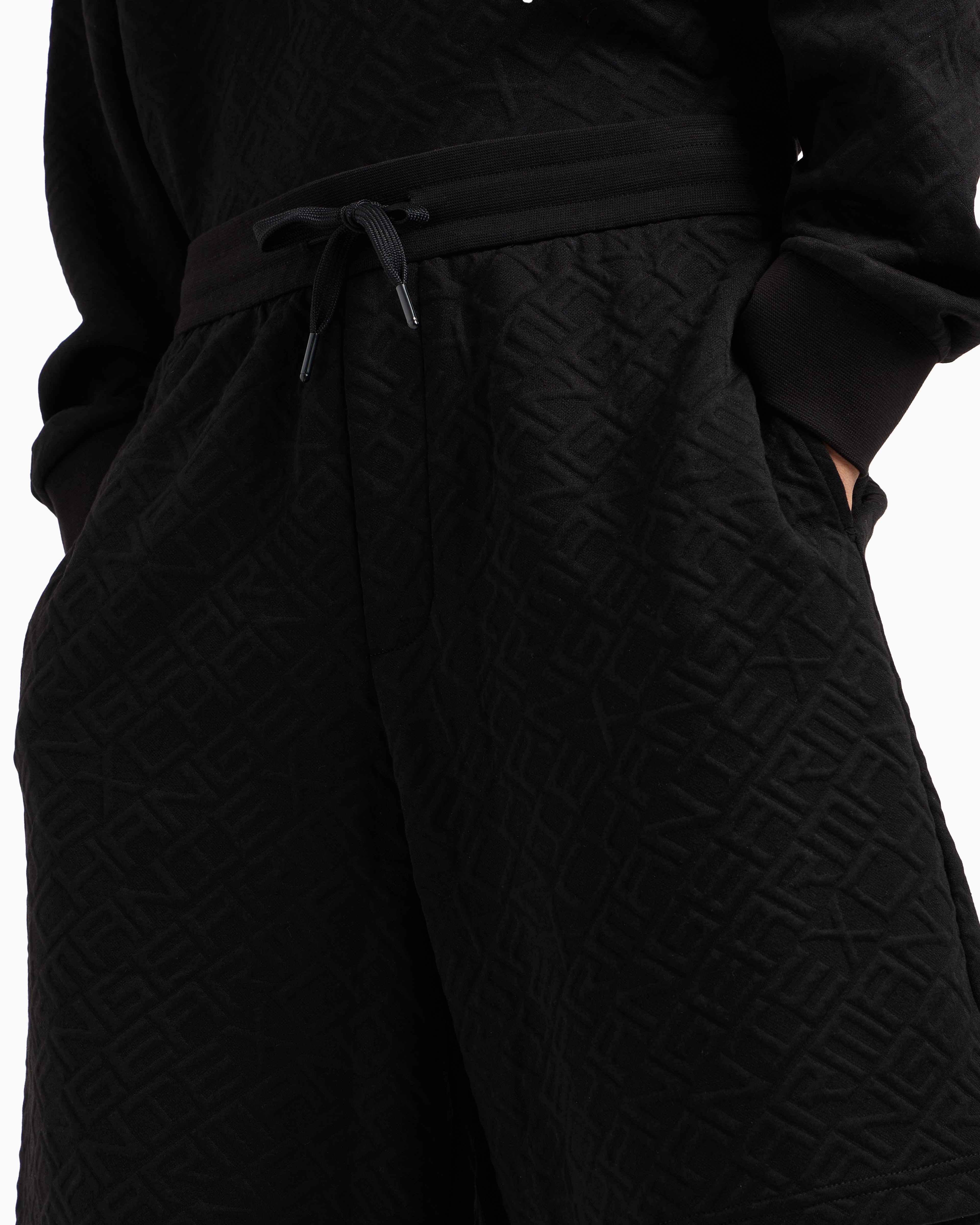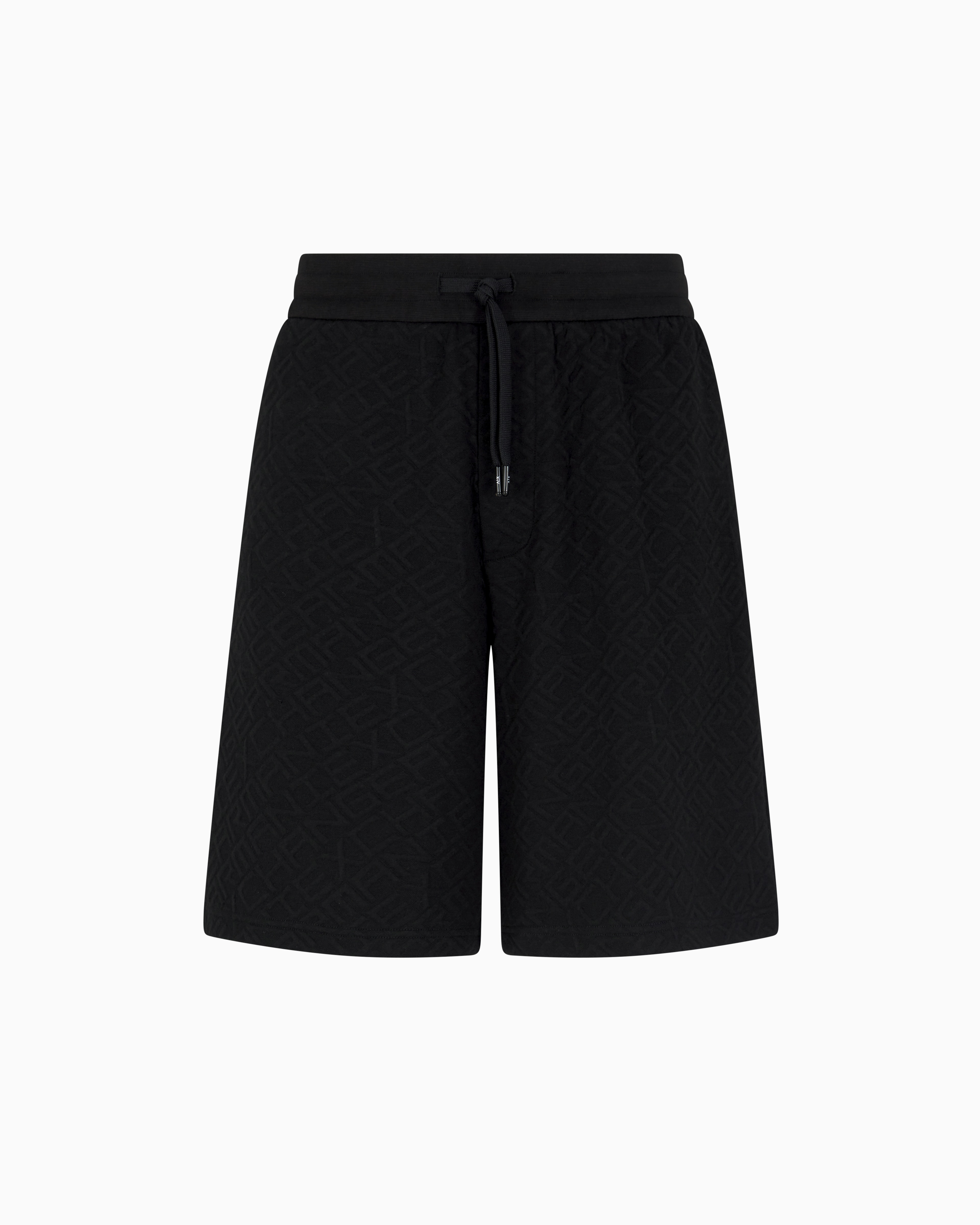 - Bermuda pants, stretch poly viscose, elastic waistband with drawstrings, allover logo jacquard