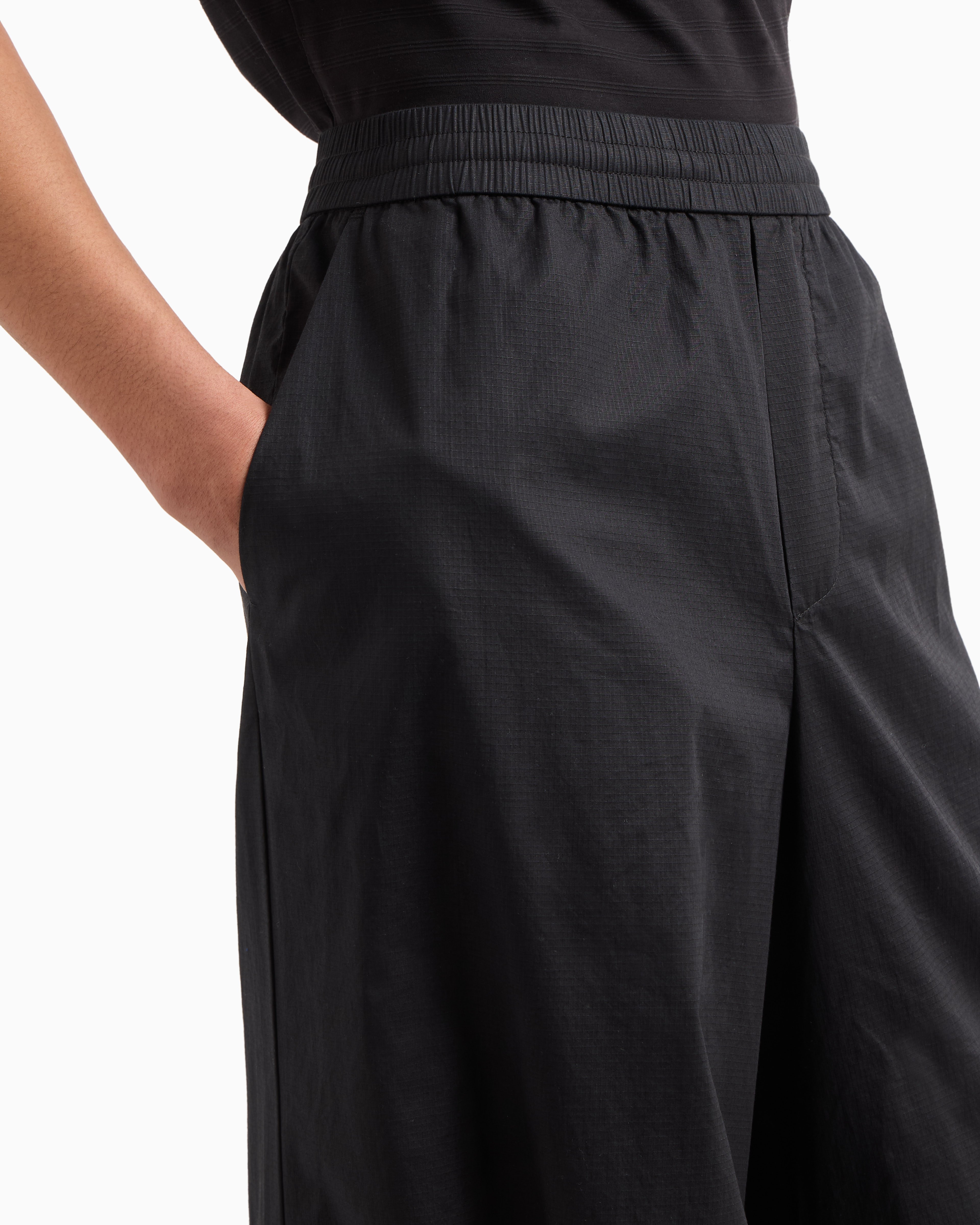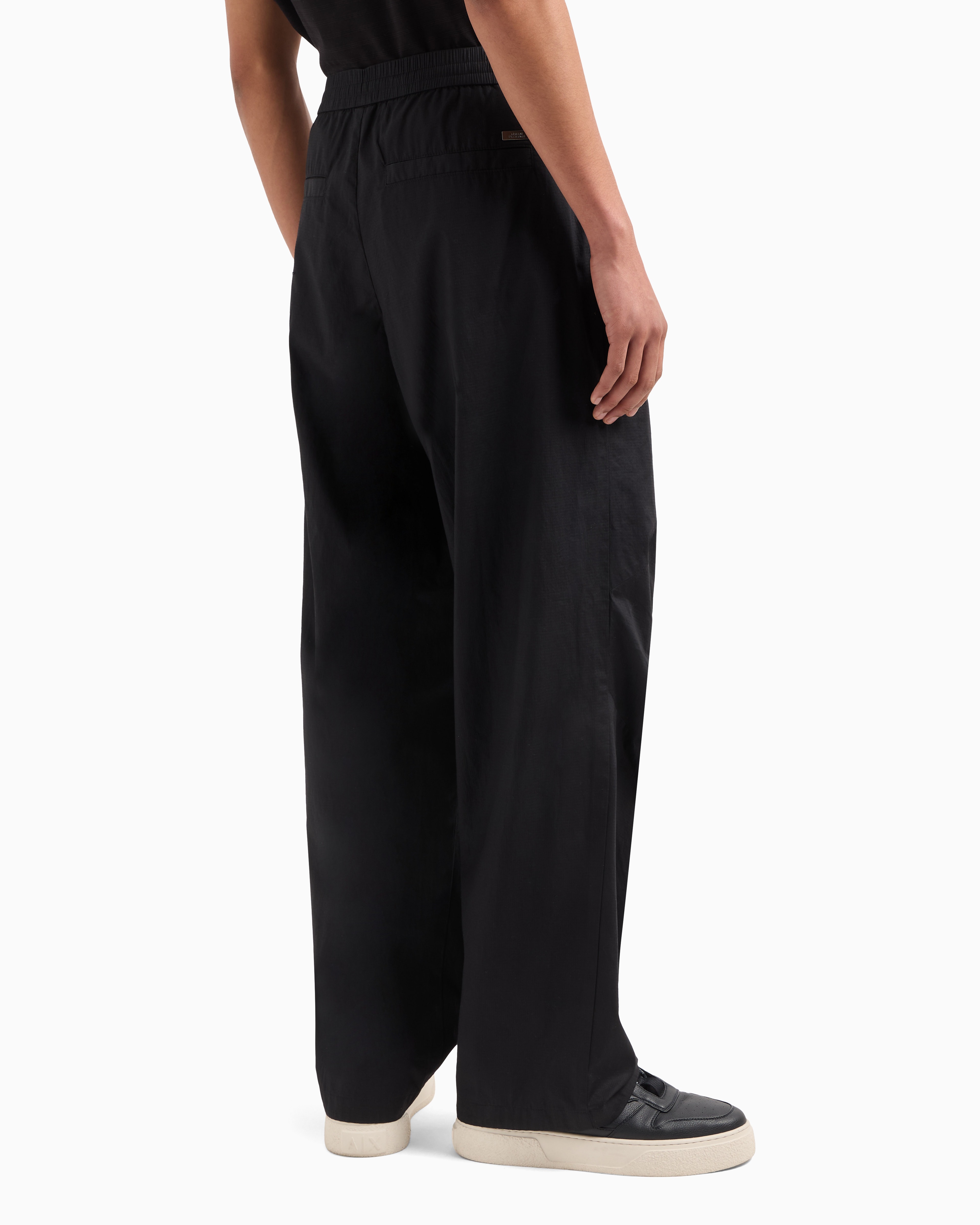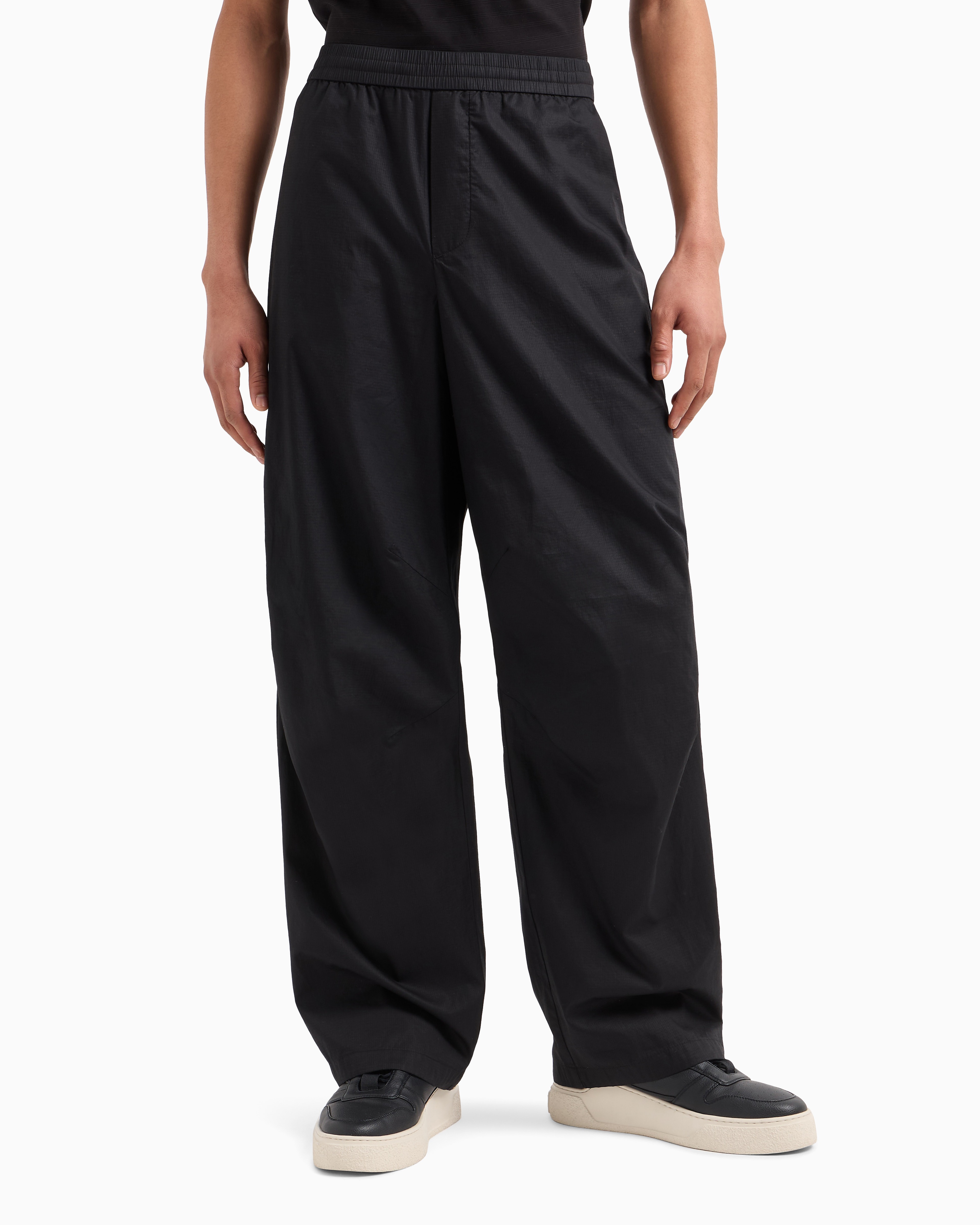 - joggers in cotton ripstop, straight leg, ergonomic cuts on knees, metal logo plate on back