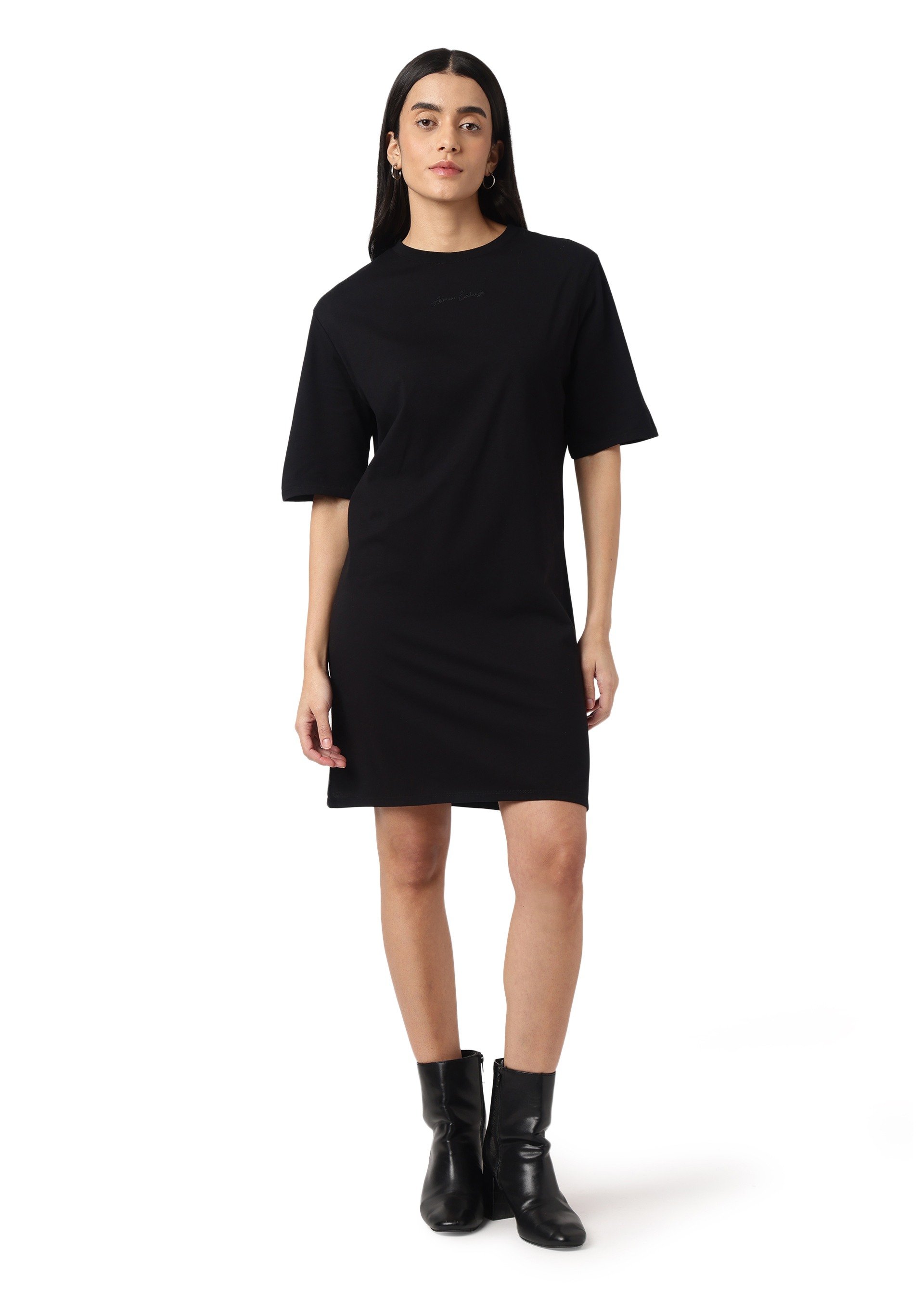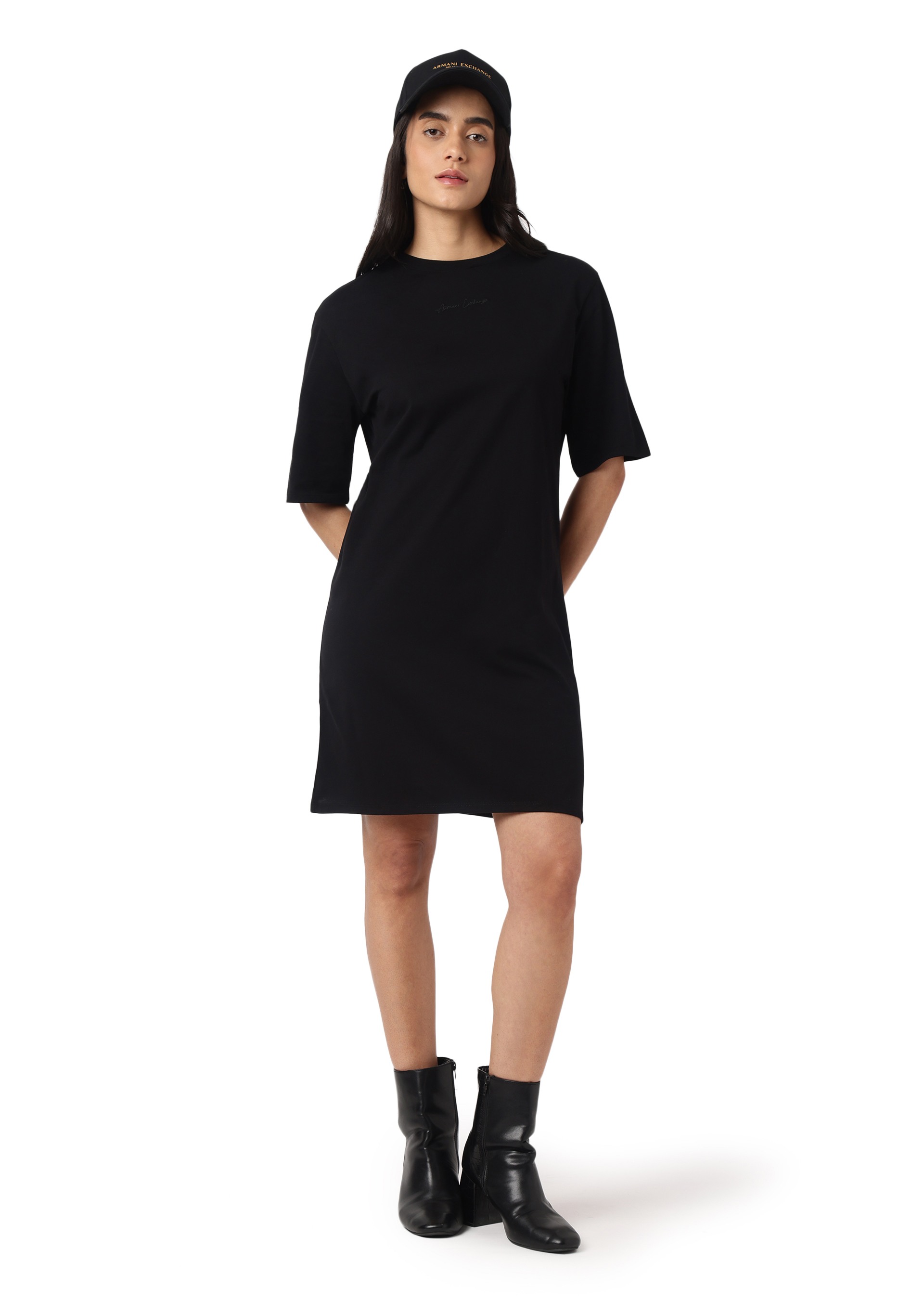 The Mini Logo Signature dress by Armani Exchange is crafted from soft organic cotton jersey for ultimate comfort. Featuring an embroidered signature logo in the center, this dress offers a clean and stylish look that's perfect for casual outings or laid-back days. Its simple yet sophisticated design makes it a versatile addition to any wardrobe