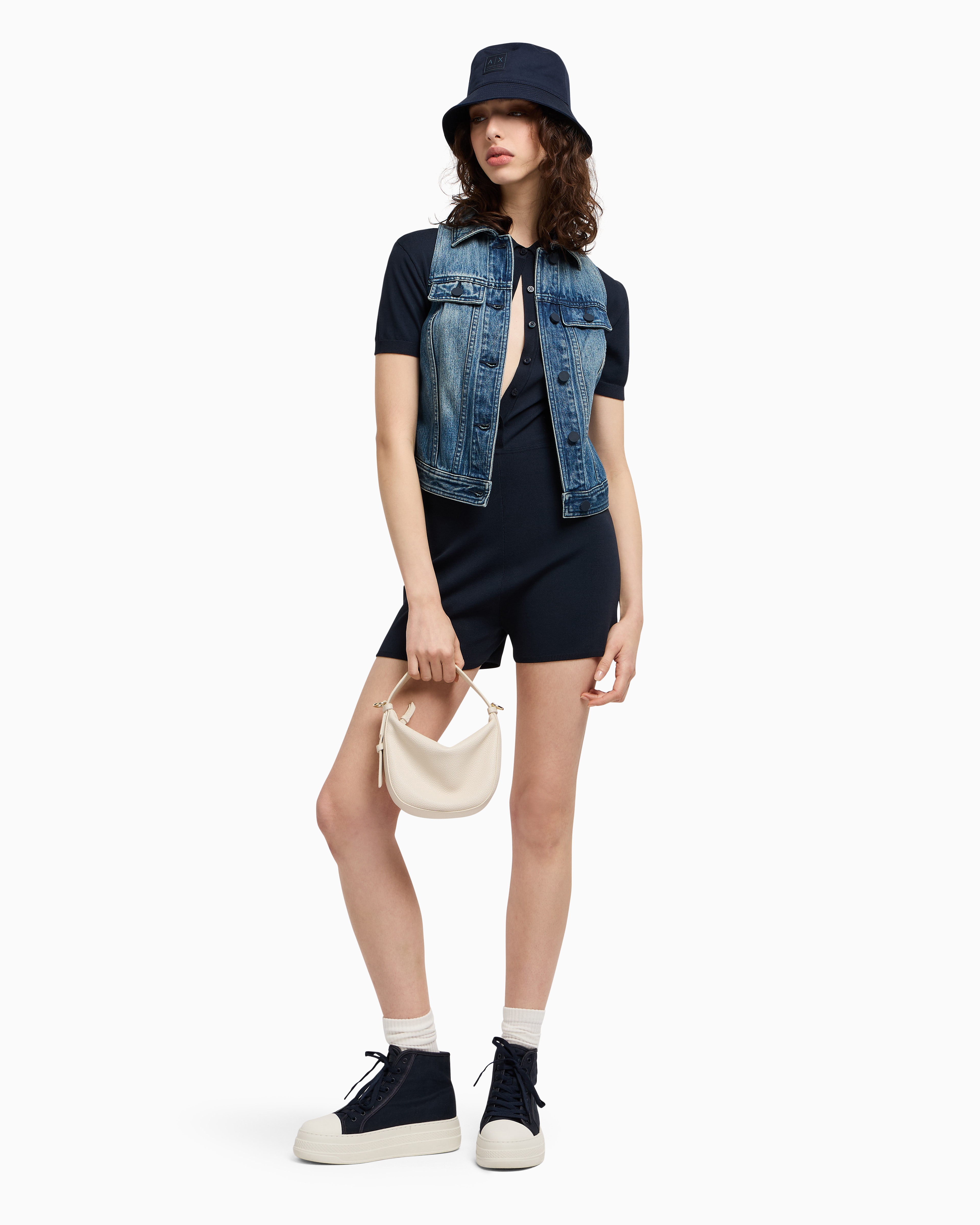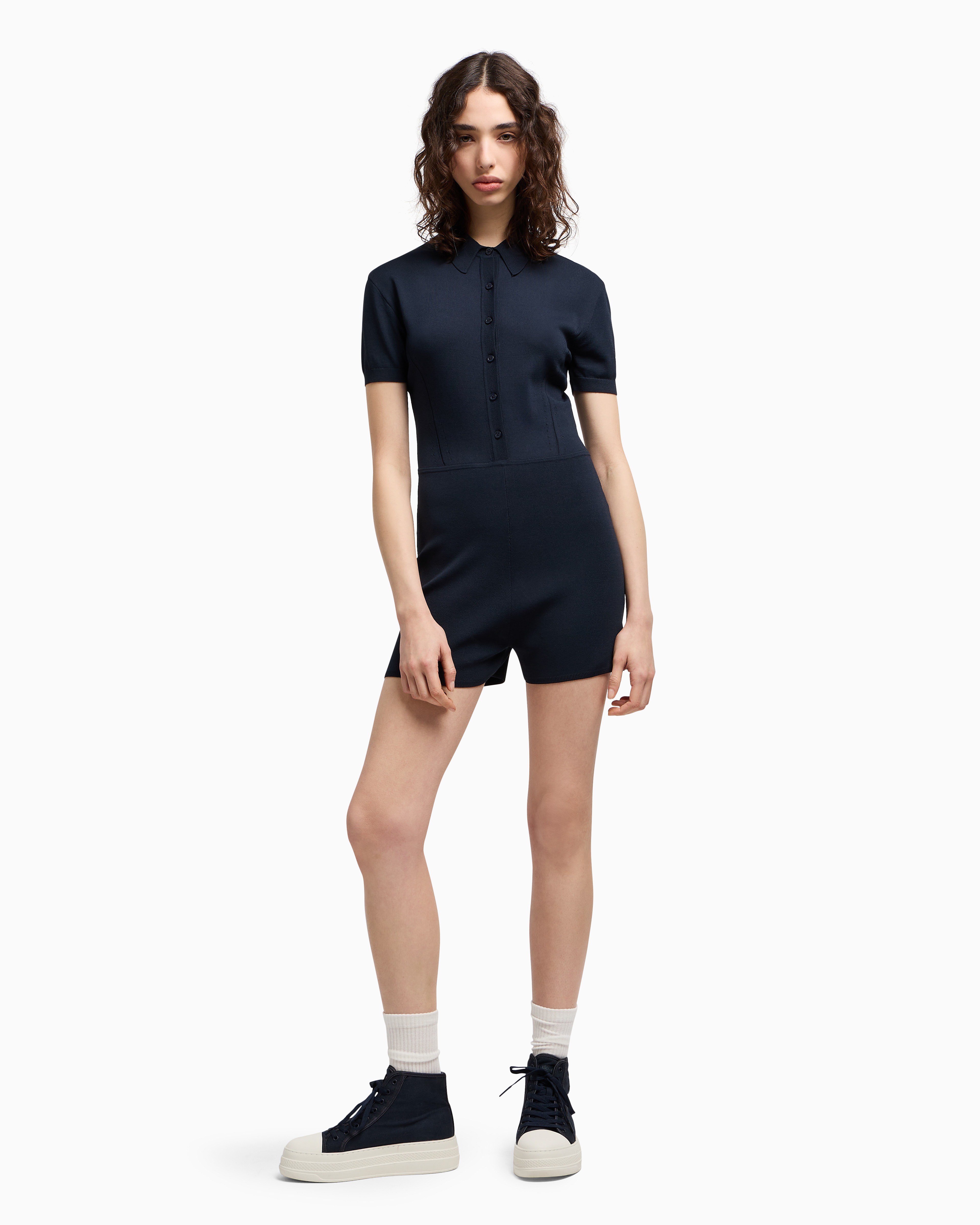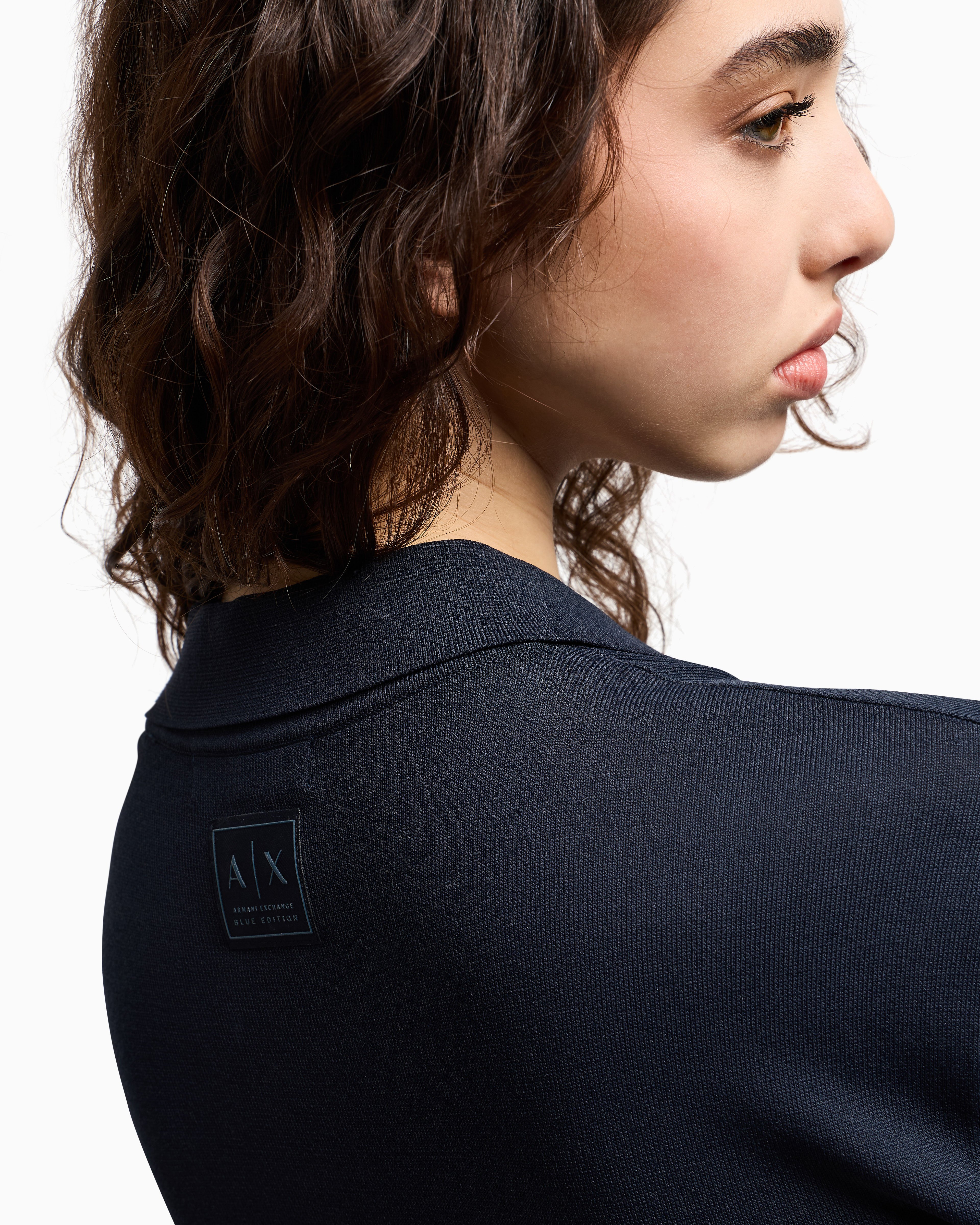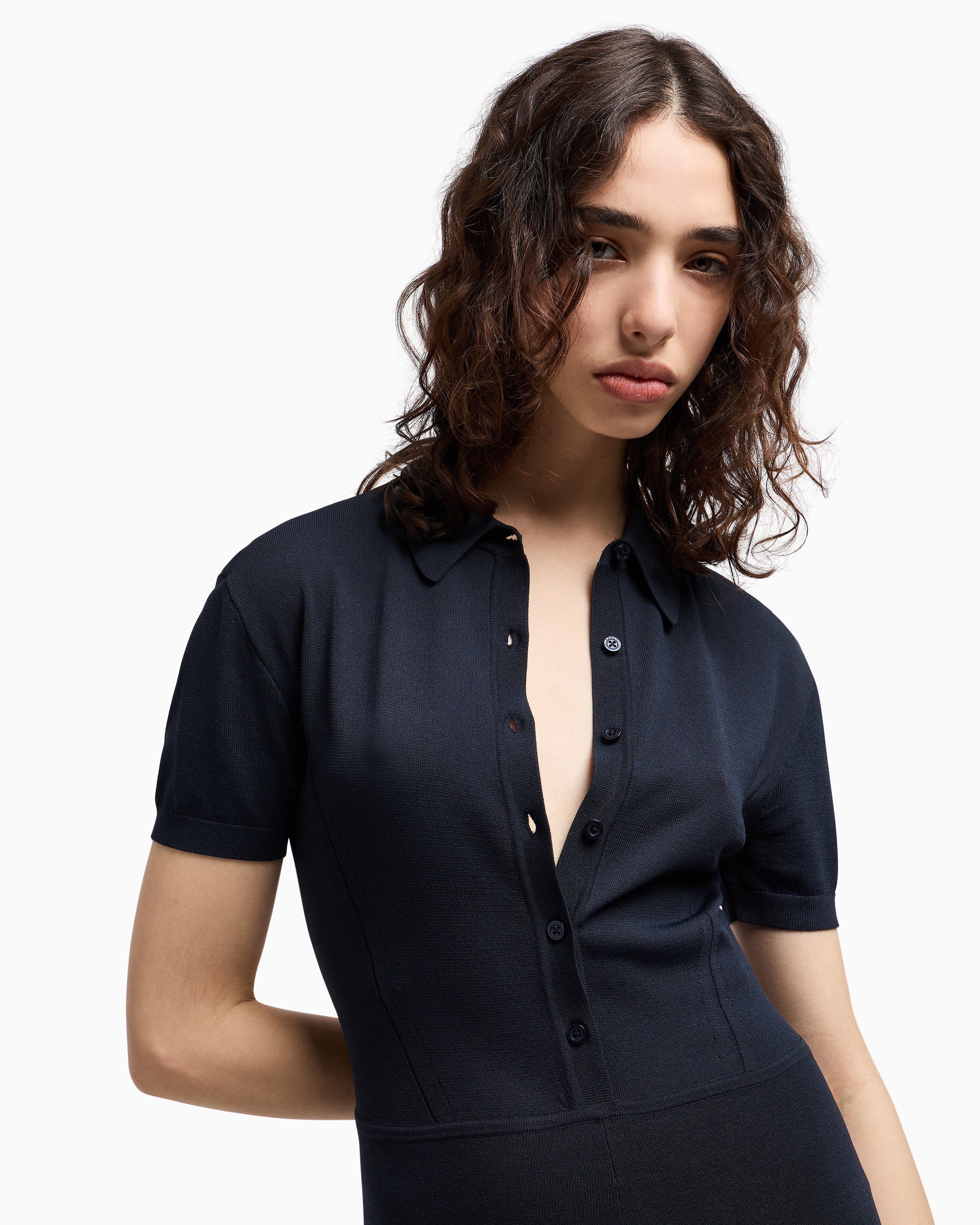 - Cross gender project, knitted recycled viscose nylon, chemisier cut, button closure, pointelle details, logo patch on back neck
